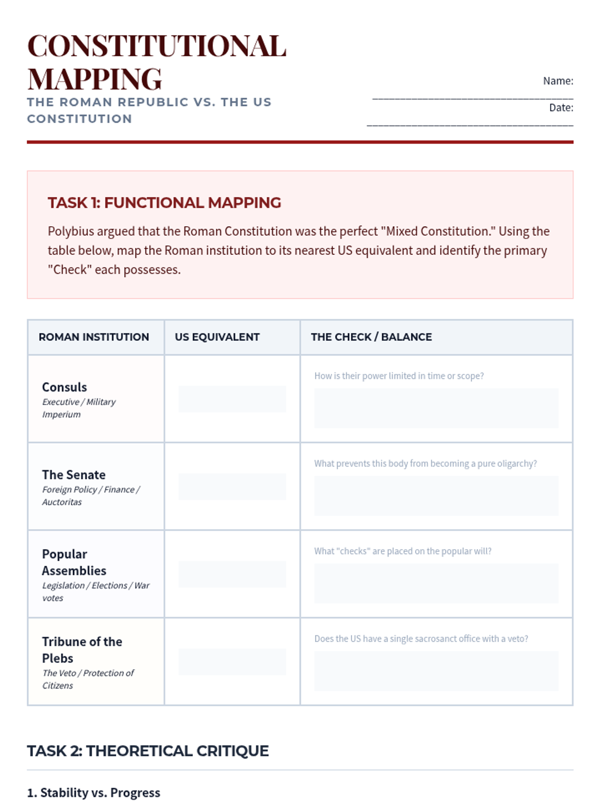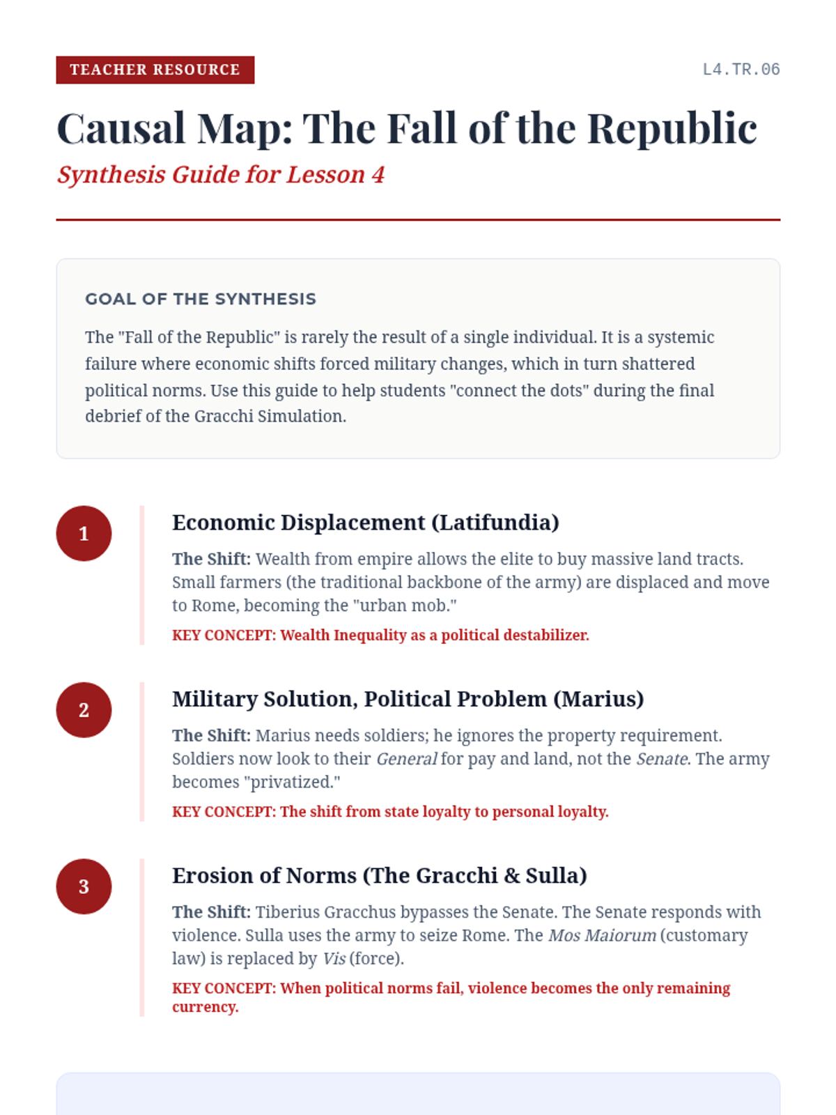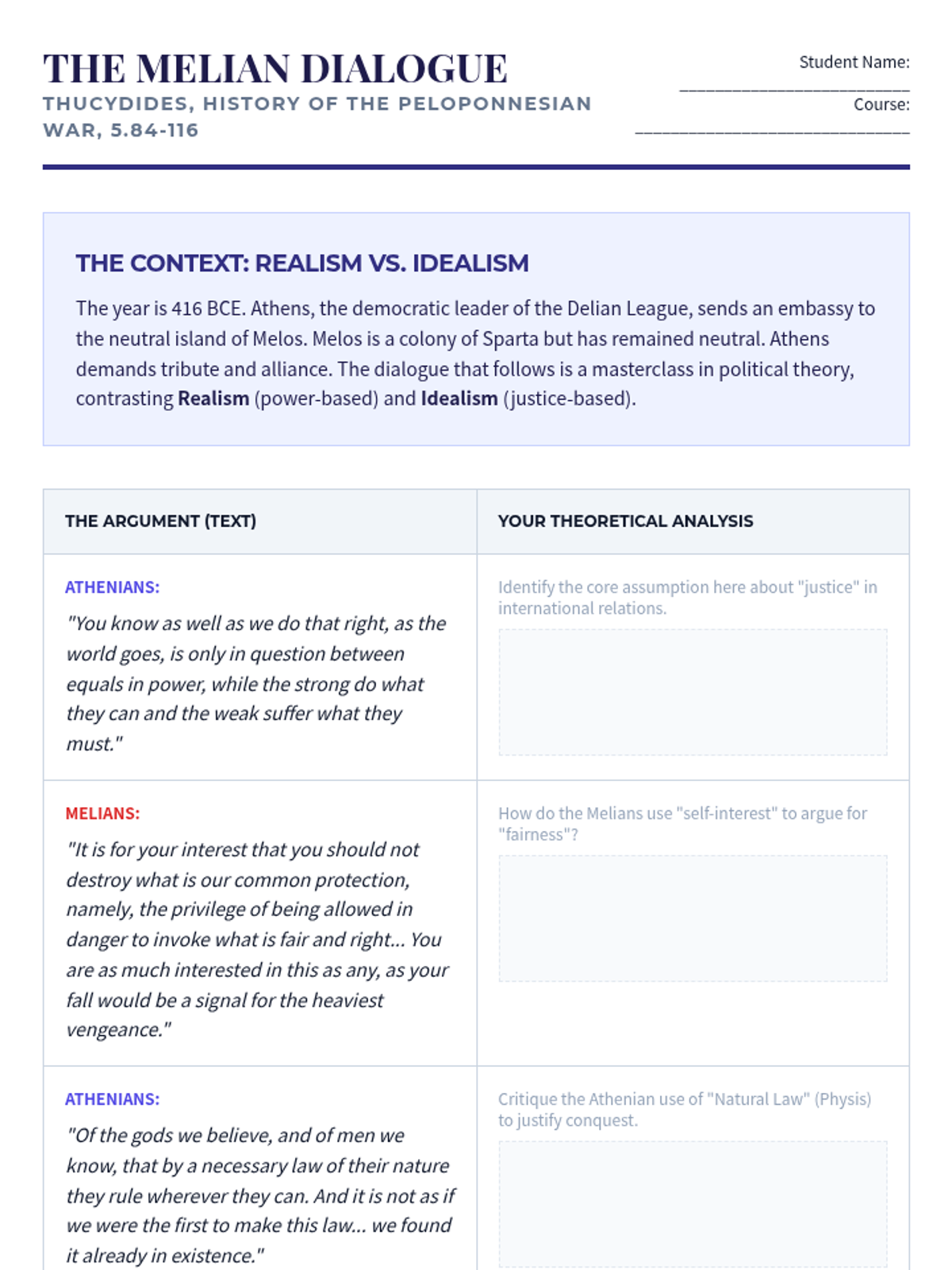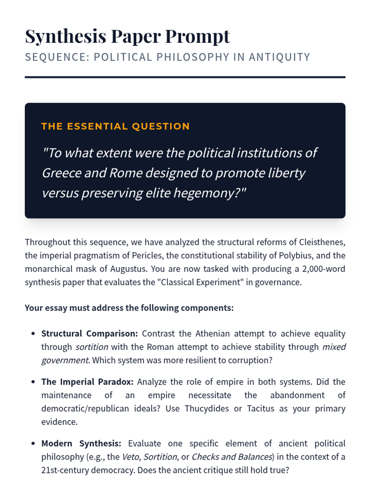 This sequence explores the transition from aristocracy to democracy in Athens and the evolution of the Roman Republic's mixed constitution. Students analyze foundational texts and the eventual collapse of republican institutions under the weight of empire, concluding with a synthesis of ancient and modern political concepts.