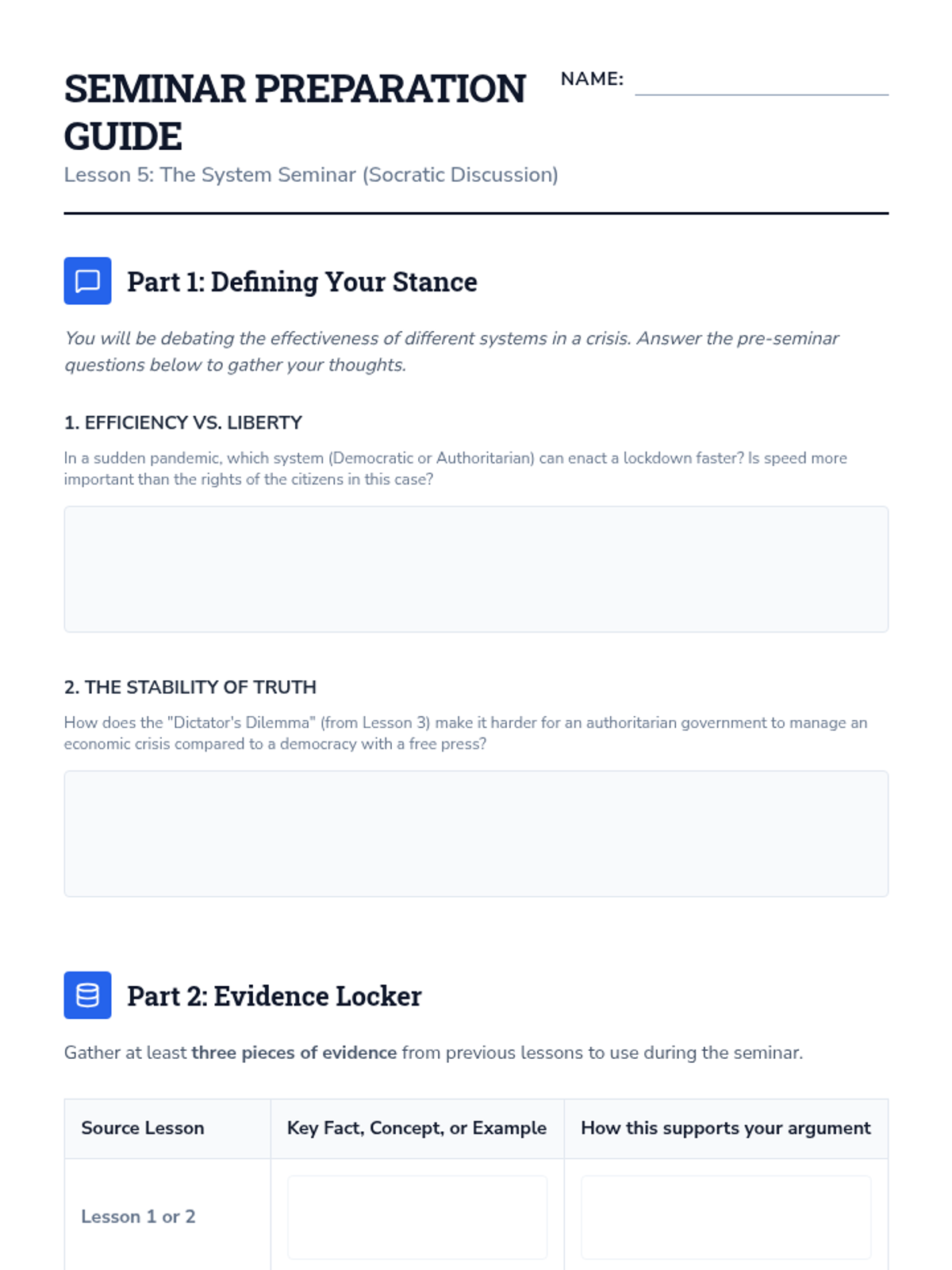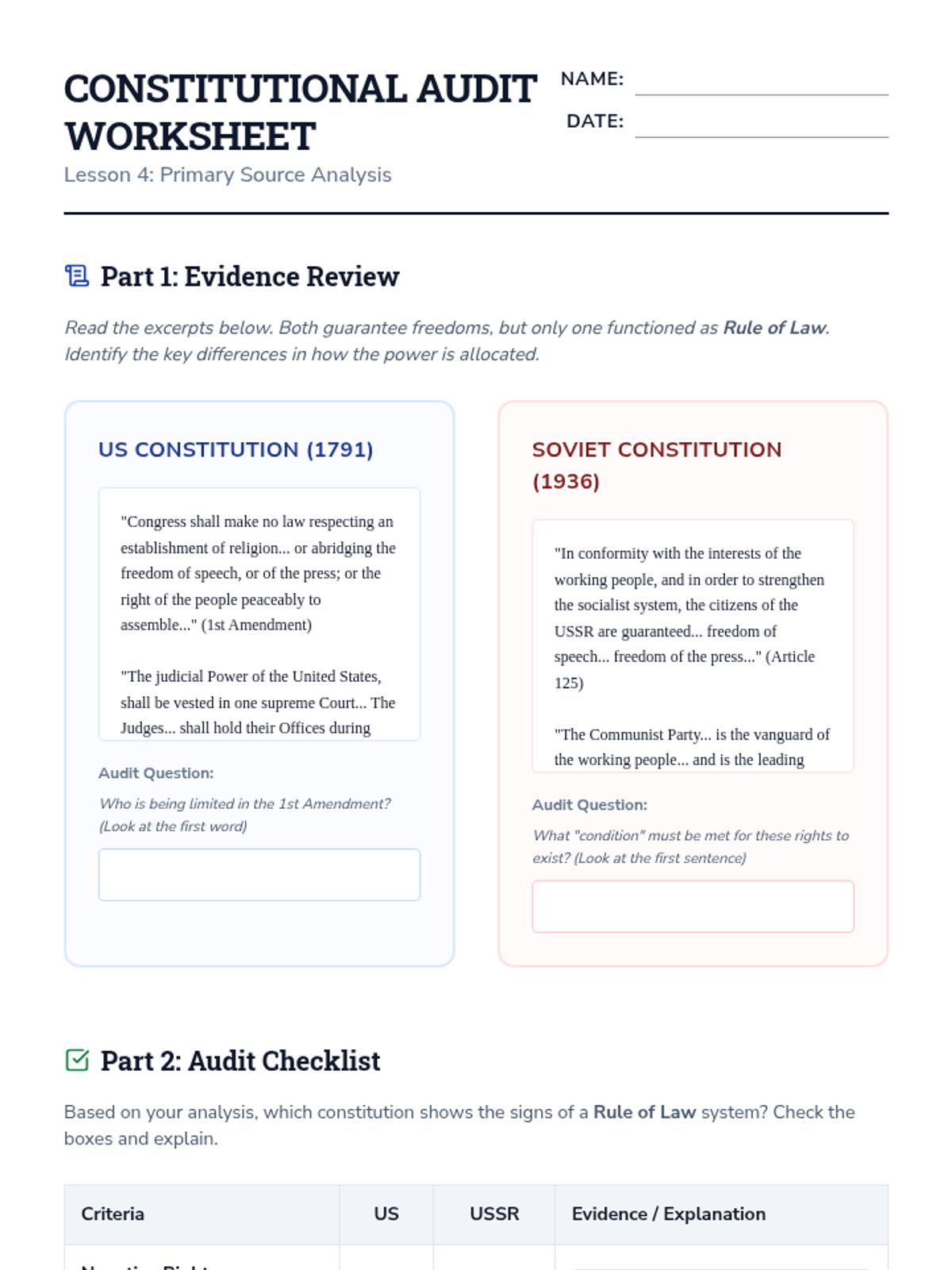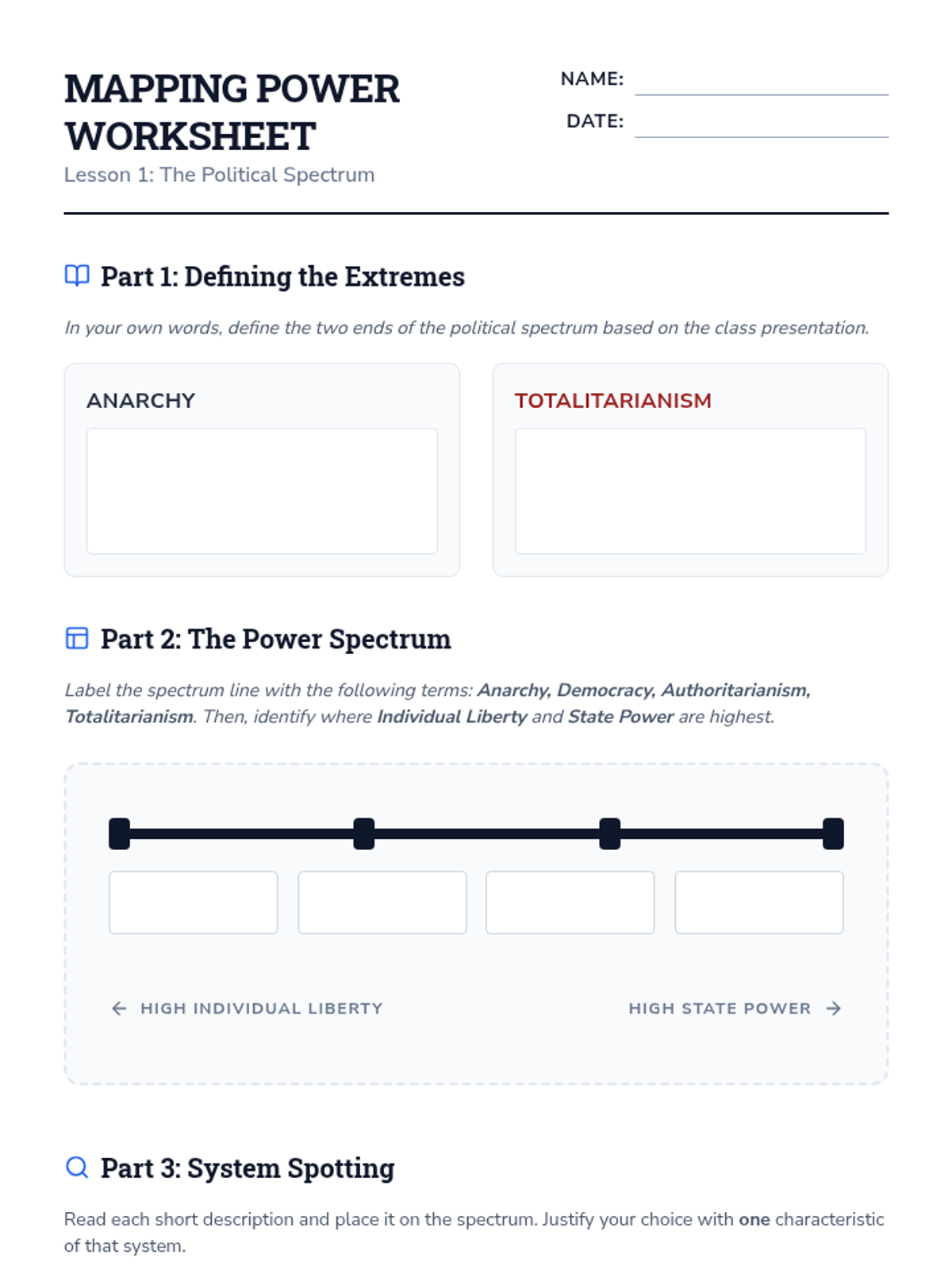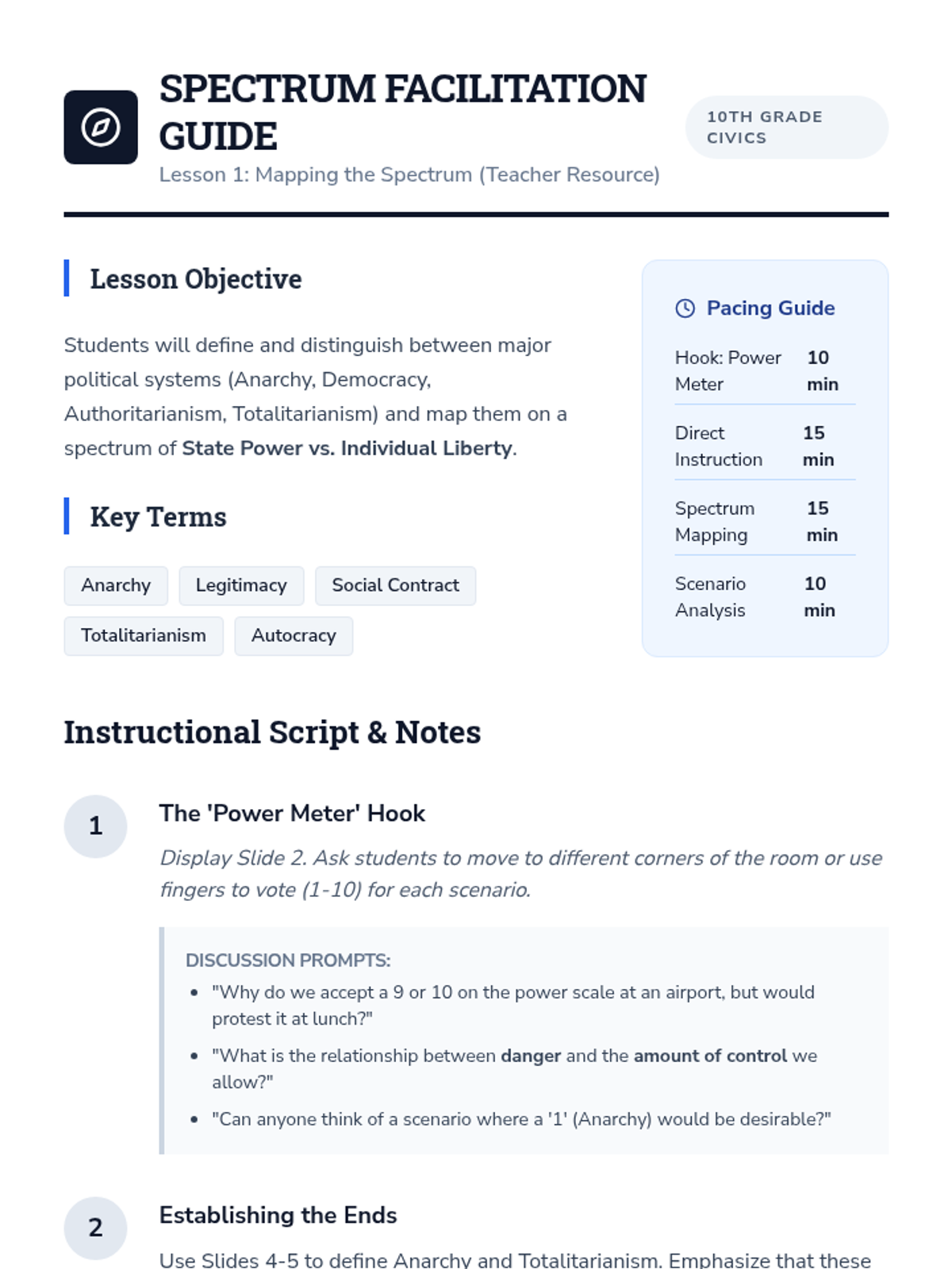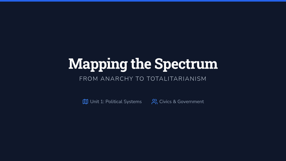 A rigorous 10th-grade sequence exploring the structural and functional differences between democratic and authoritarian systems. Students analyze power distribution, legitimacy, and the role of constitutions through case studies and comparative mapping.