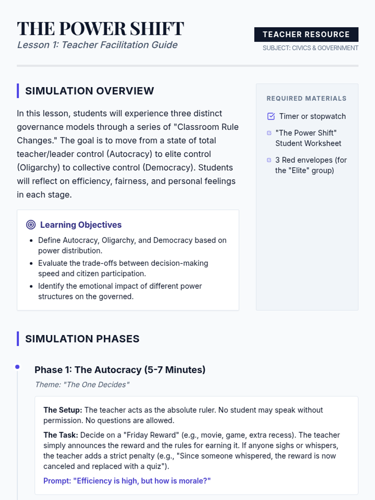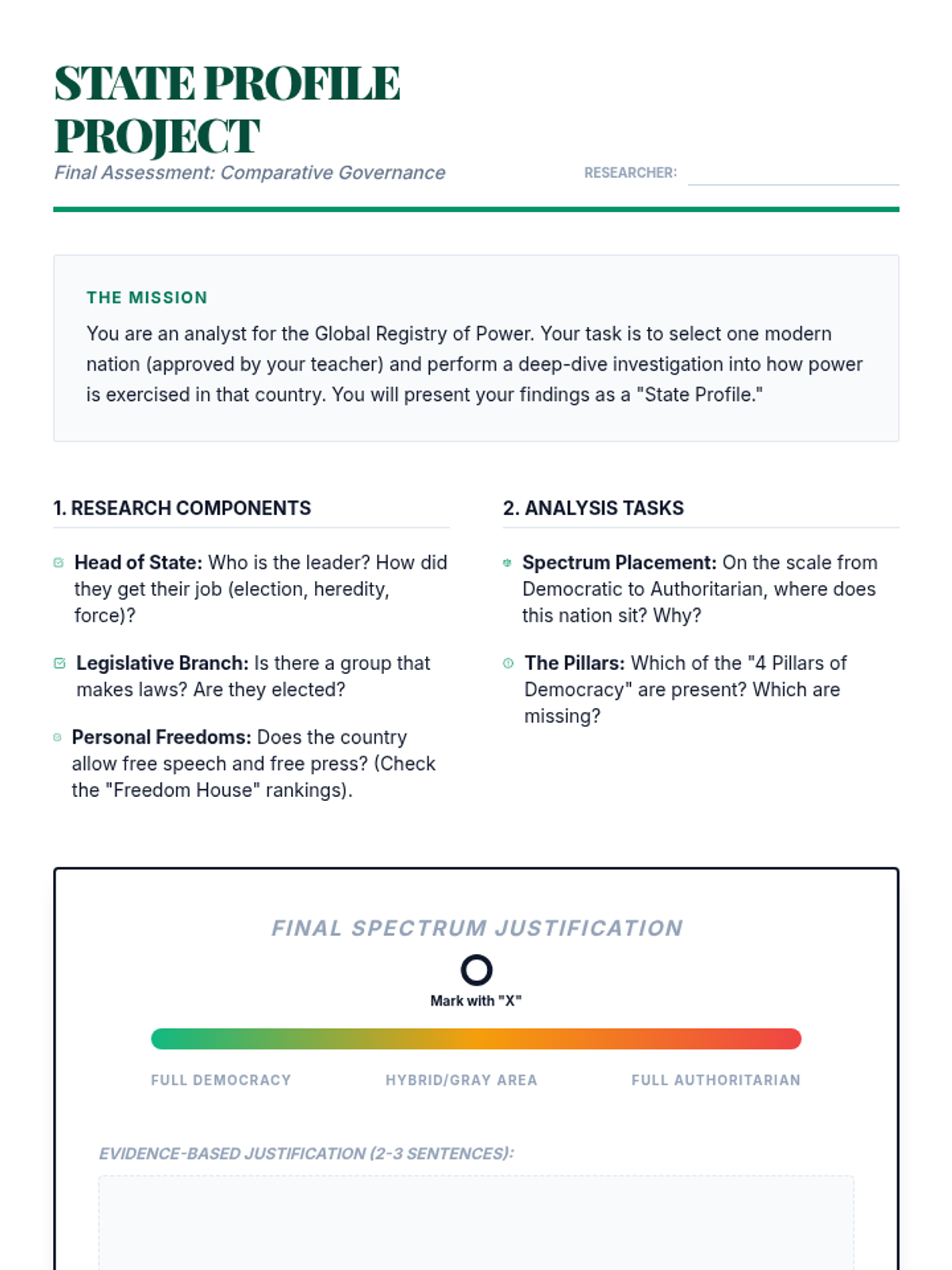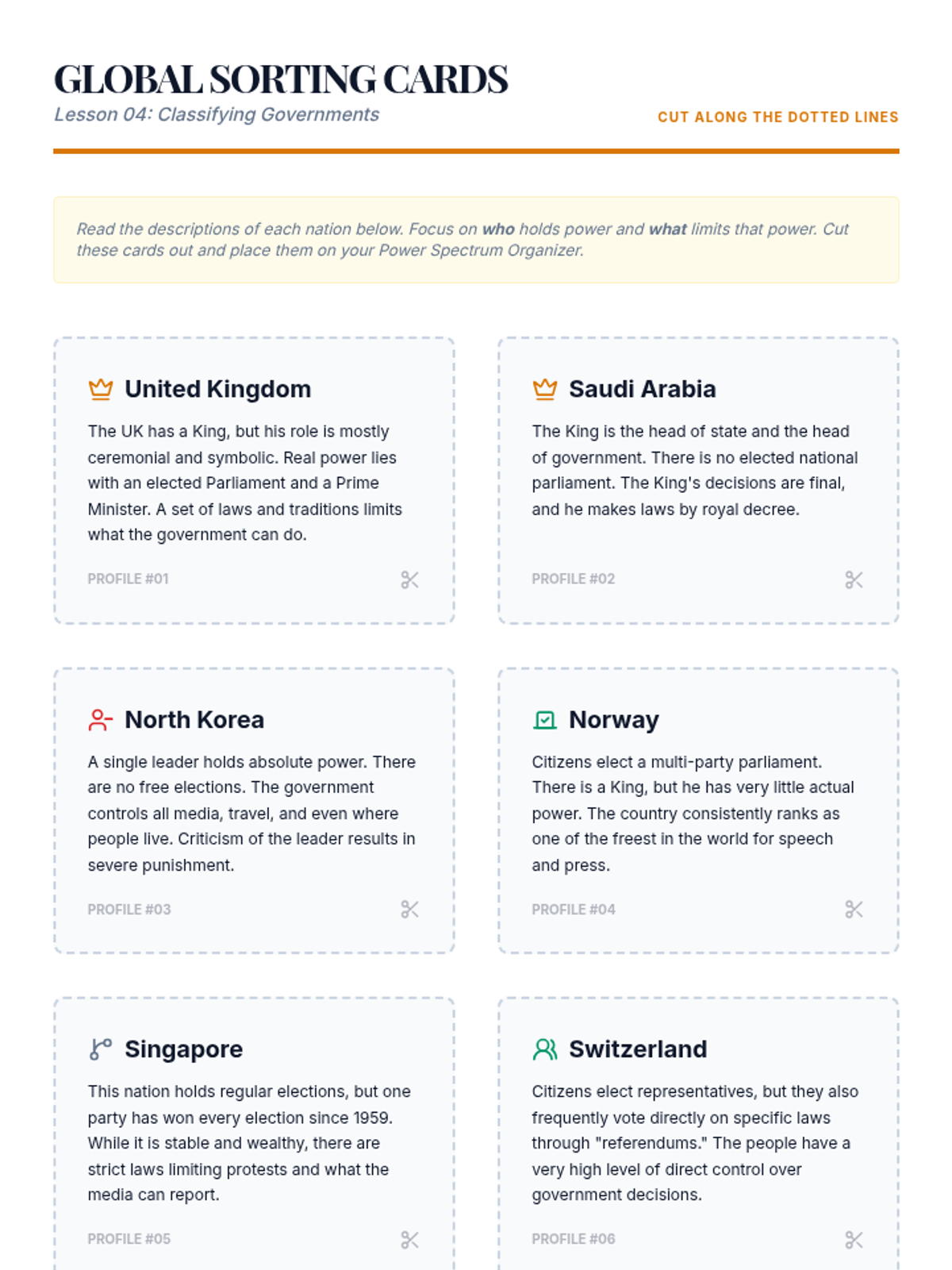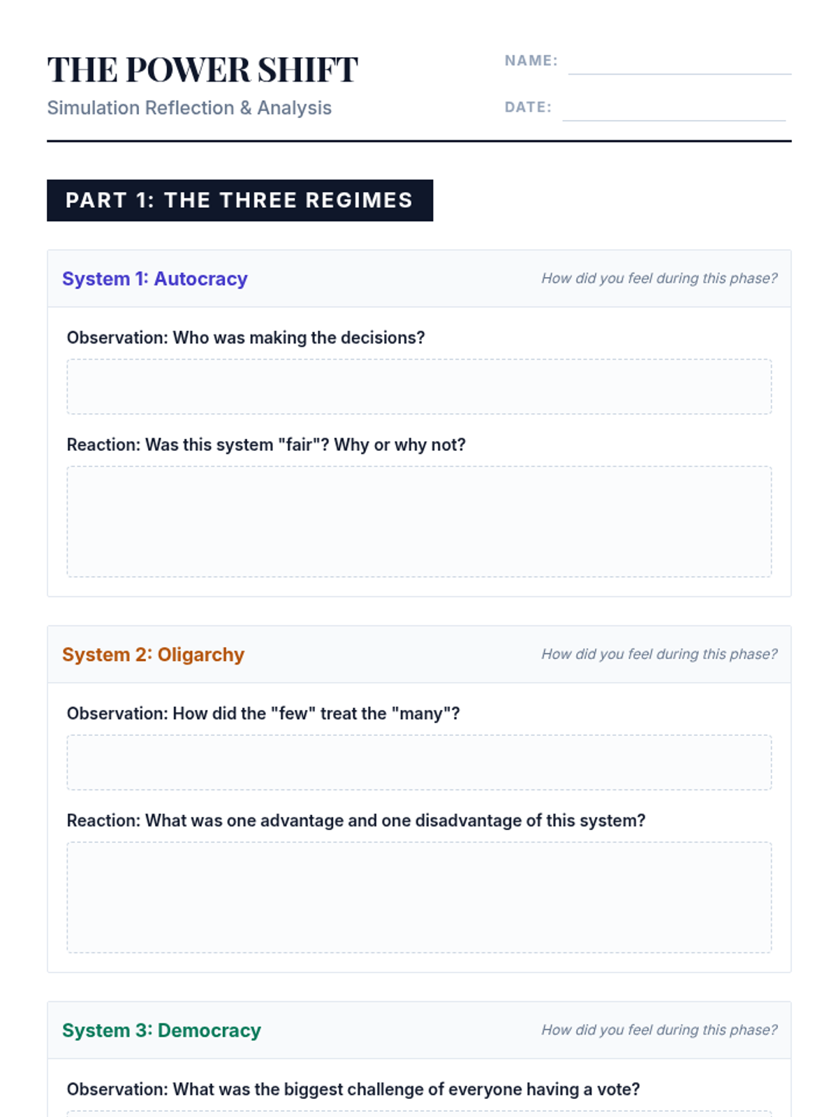 This sequence explores the spectrum of political power, comparing democratic and authoritarian models through simulations, primary source analysis, and comparative case studies. Students will investigate how different systems distribute power and the resulting impact on individual freedoms and societal efficiency.