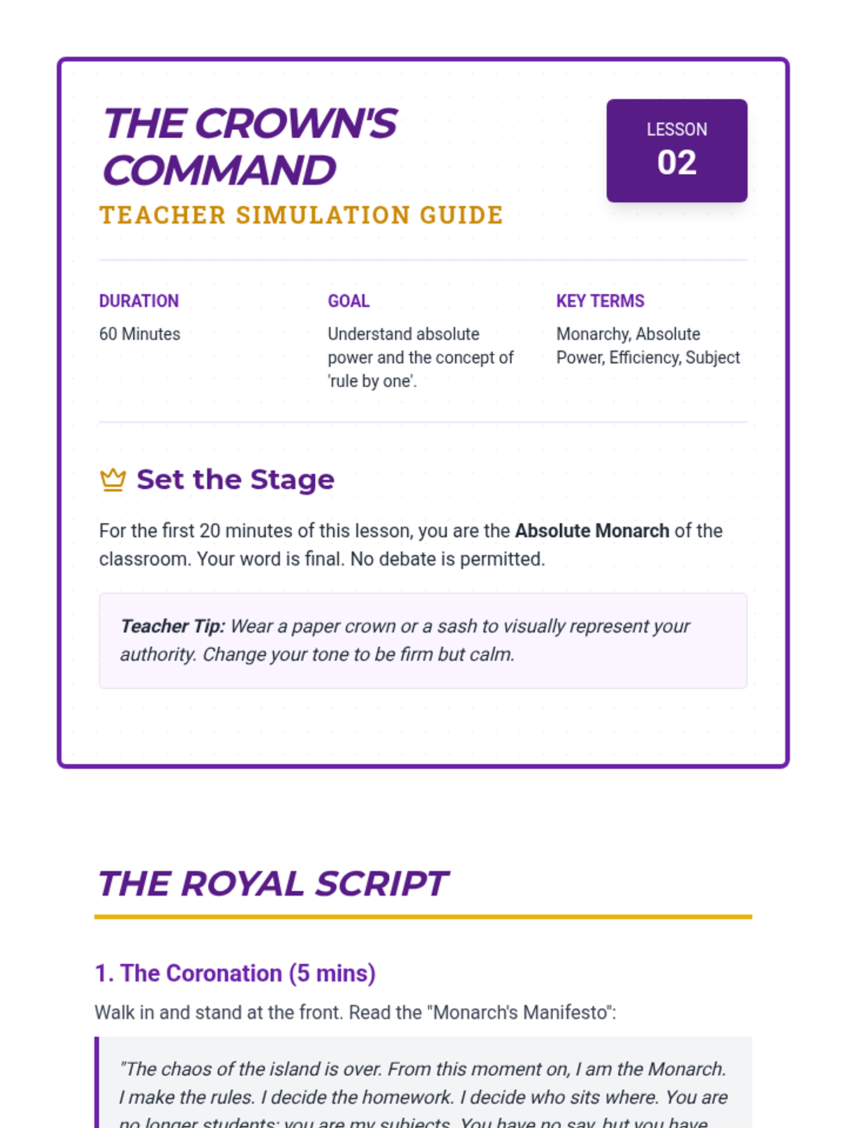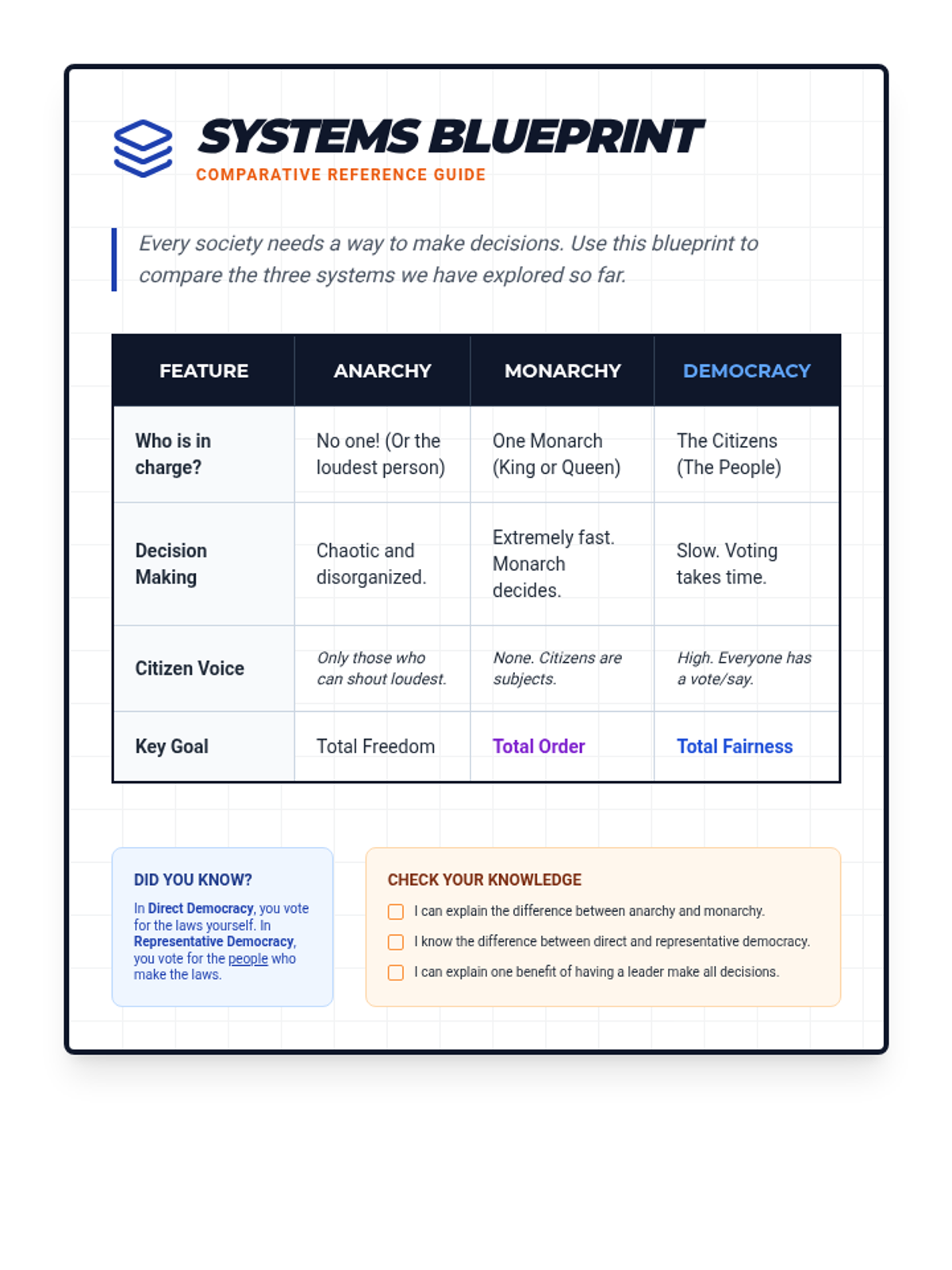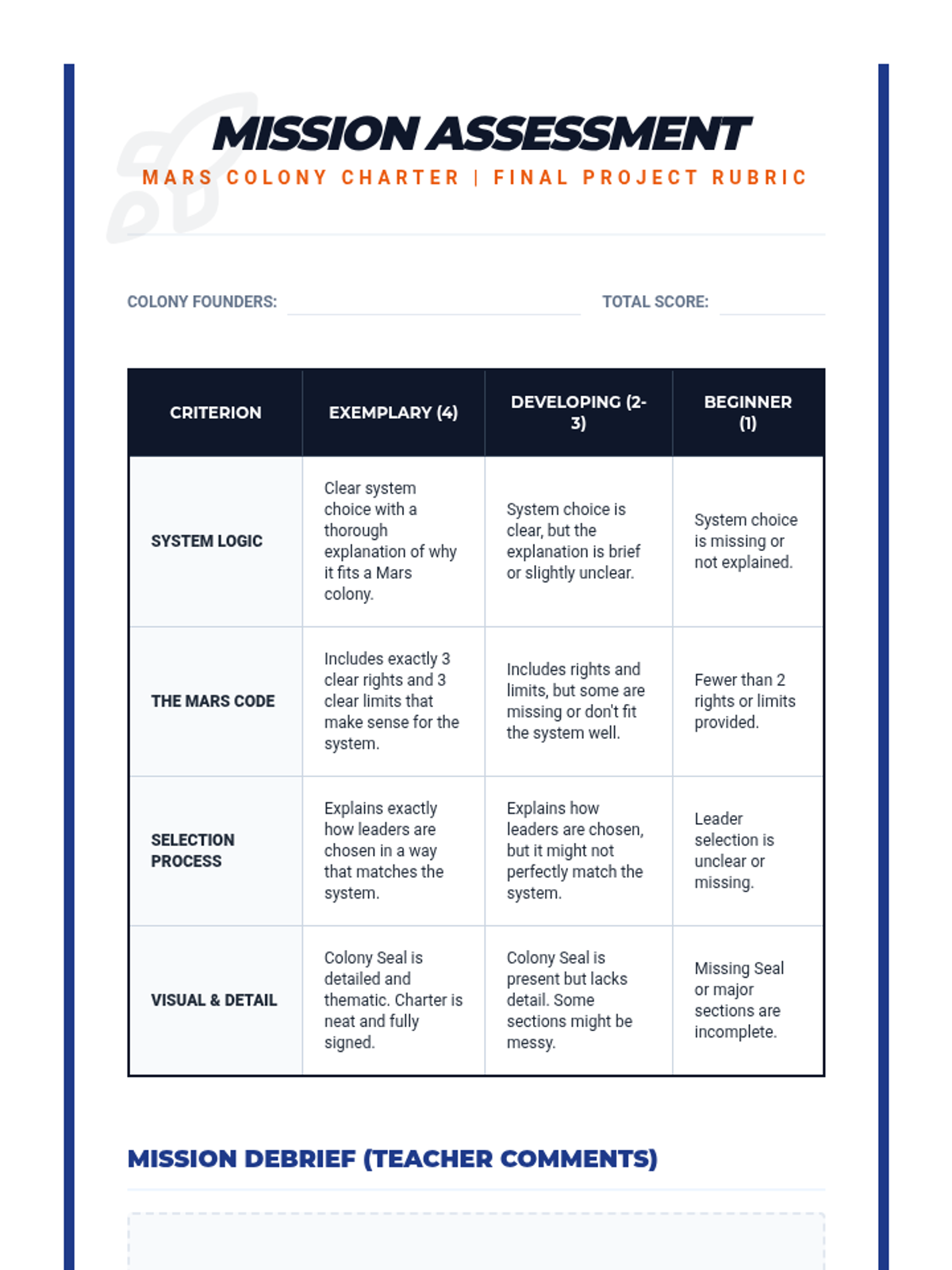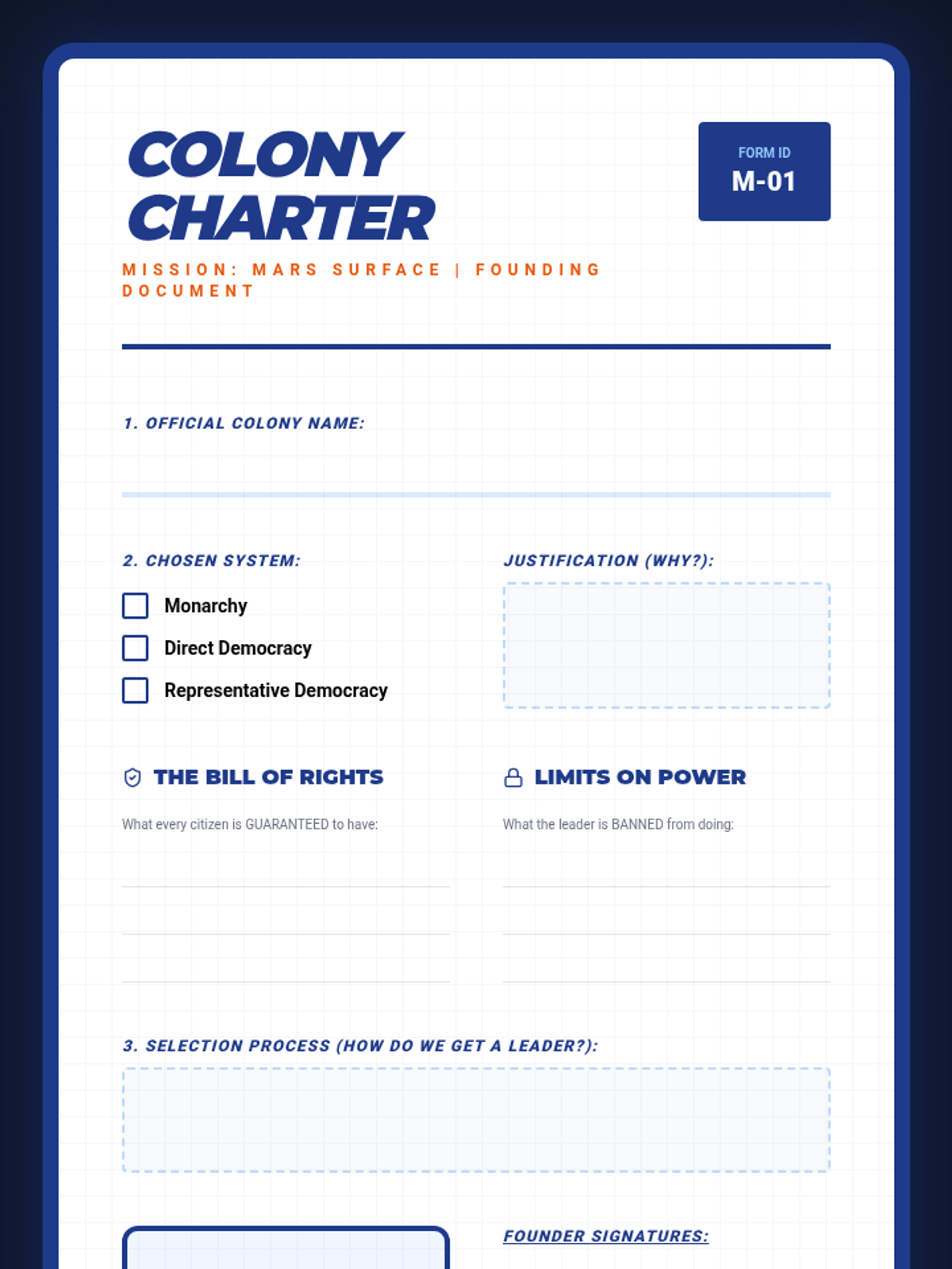 A 4th-grade civics sequence where students explore political systems through classroom simulations, moving from anarchy to monarchy and finally to democracy. Students conclude by designing their own government charter for a fictional Mars colony.