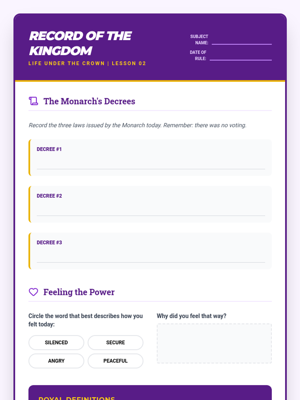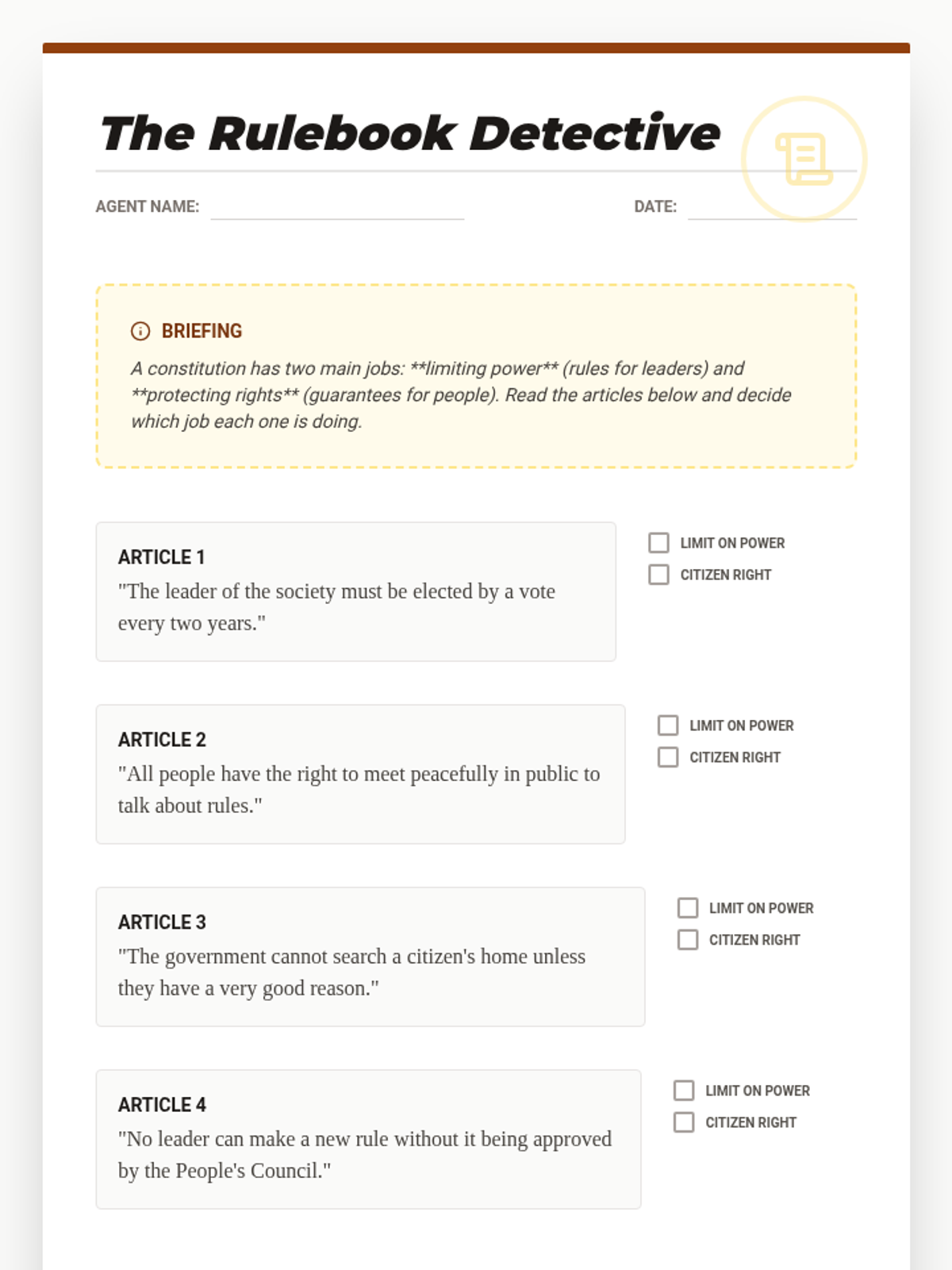 Students explore the concept of constitutional frameworks by drafting a 'Classroom Constitution.' They learn how written rules prevent confusion, define rights and responsibilities, and limit the power of leaders, culminating in a formal ratification ceremony.