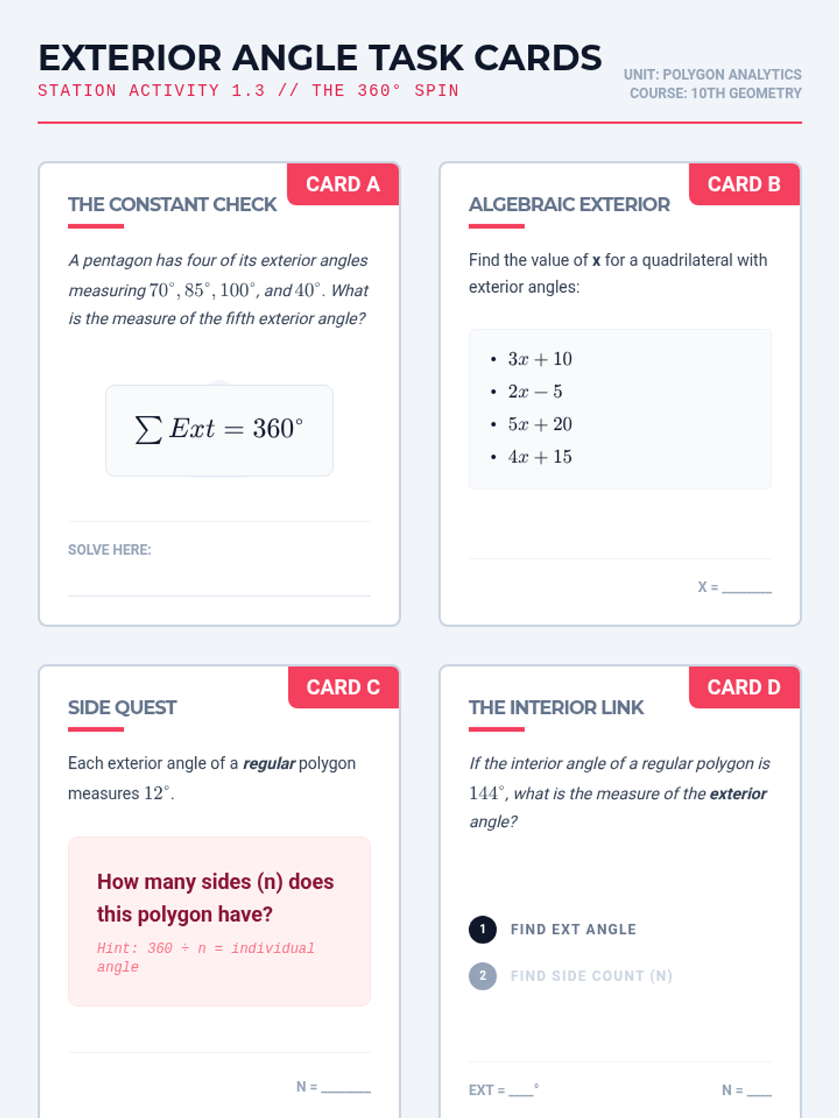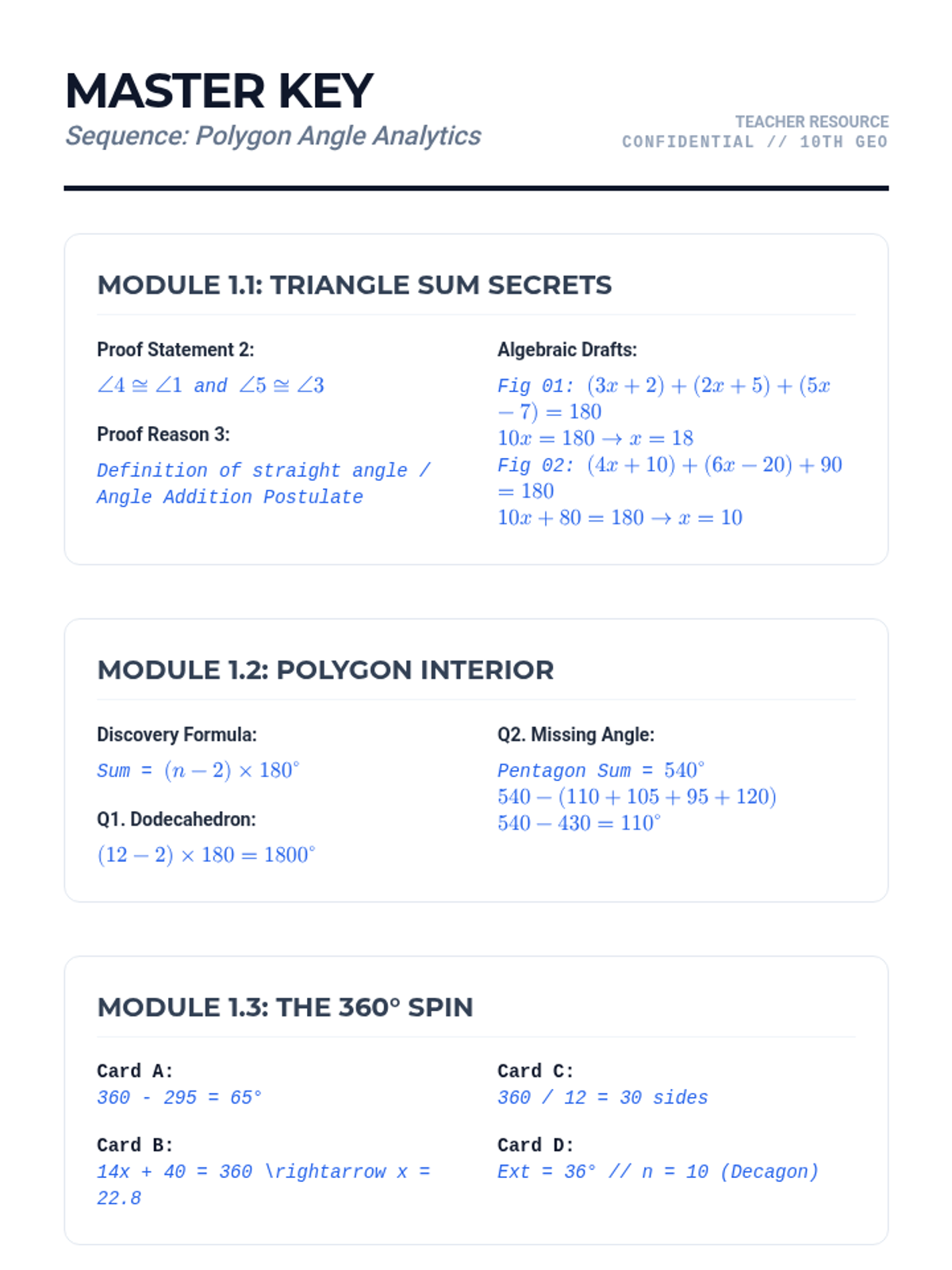 A comprehensive 10th-grade geometry unit focused on deriving and applying angle theorems for triangles and n-sided polygons through deductive reasoning and algebraic synthesis.