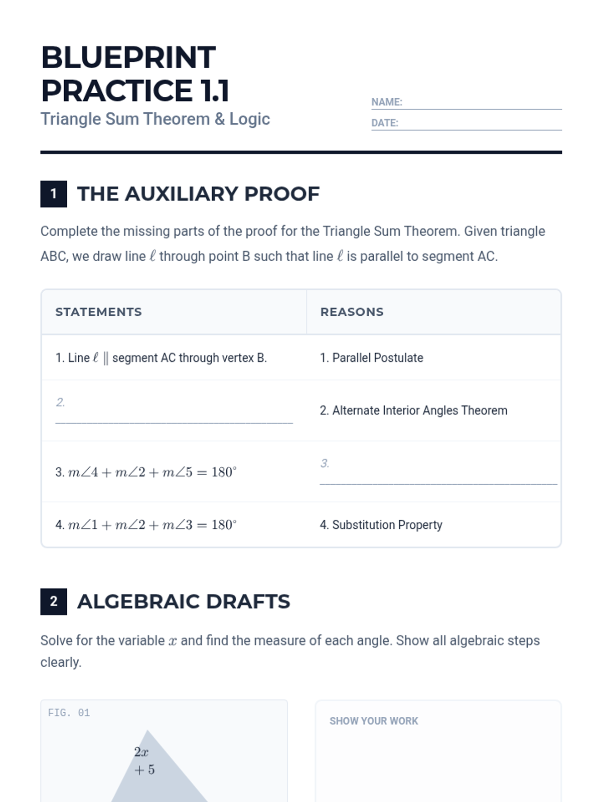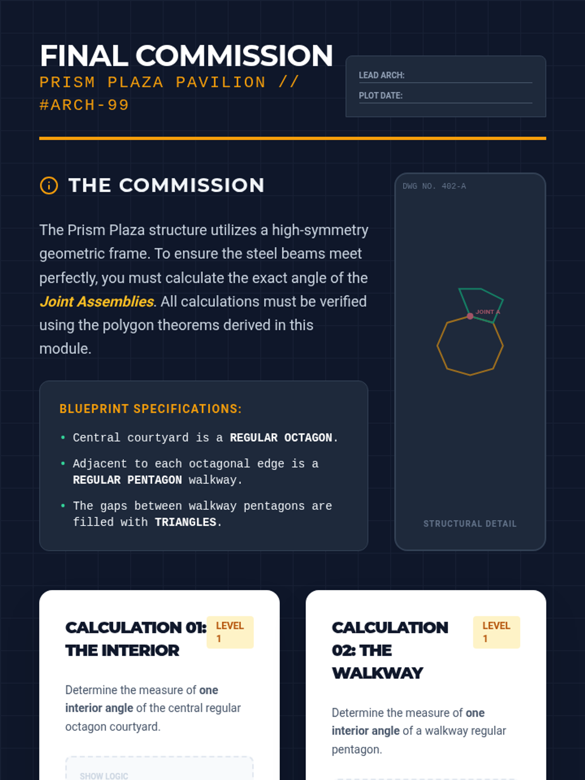A series of algebra and geometry foundation lessons designed with a technical blueprint aesthetic, focusing on precision, organized computation, and visual clarity in mathematical steps.