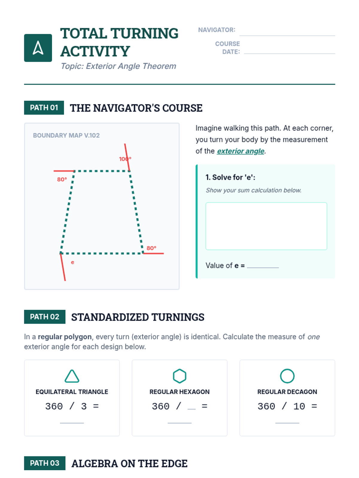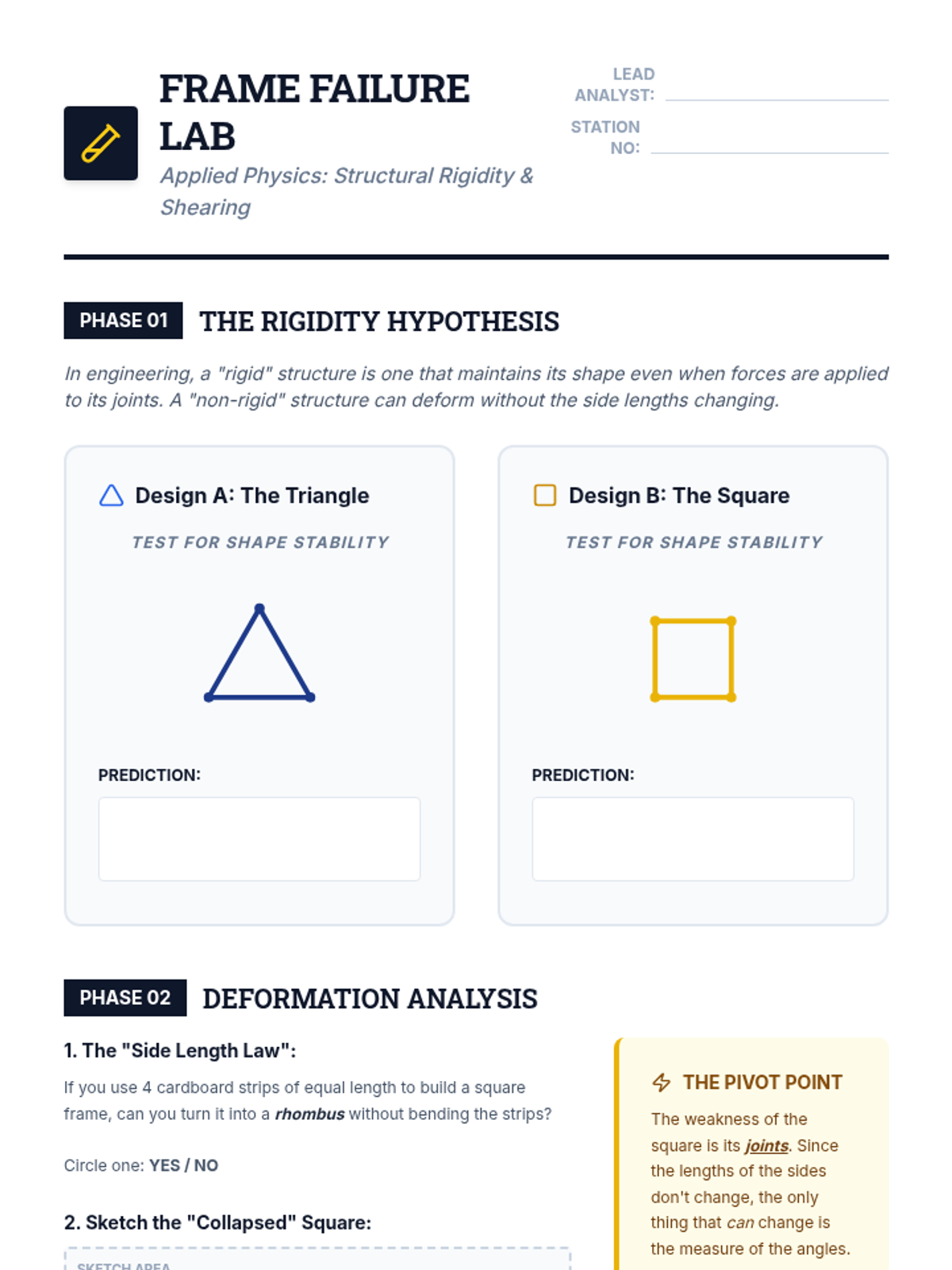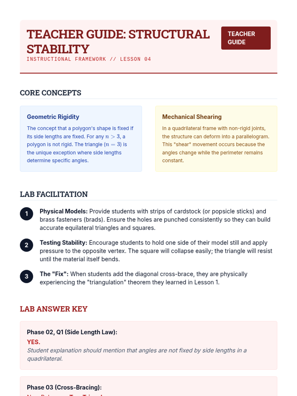 This sequence investigates the mathematical properties of polygons and their structural applications in engineering and architecture. Students explore interior and exterior angles, the unique attributes of regular polygons, and the fundamental reasons why triangles provide structural rigidity where other polygons fail.