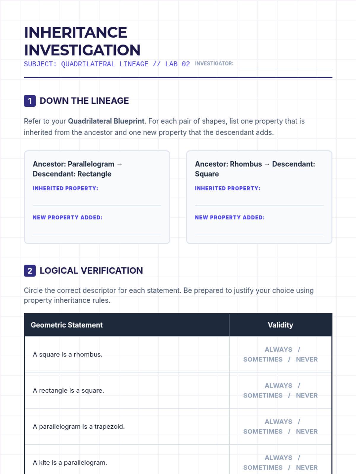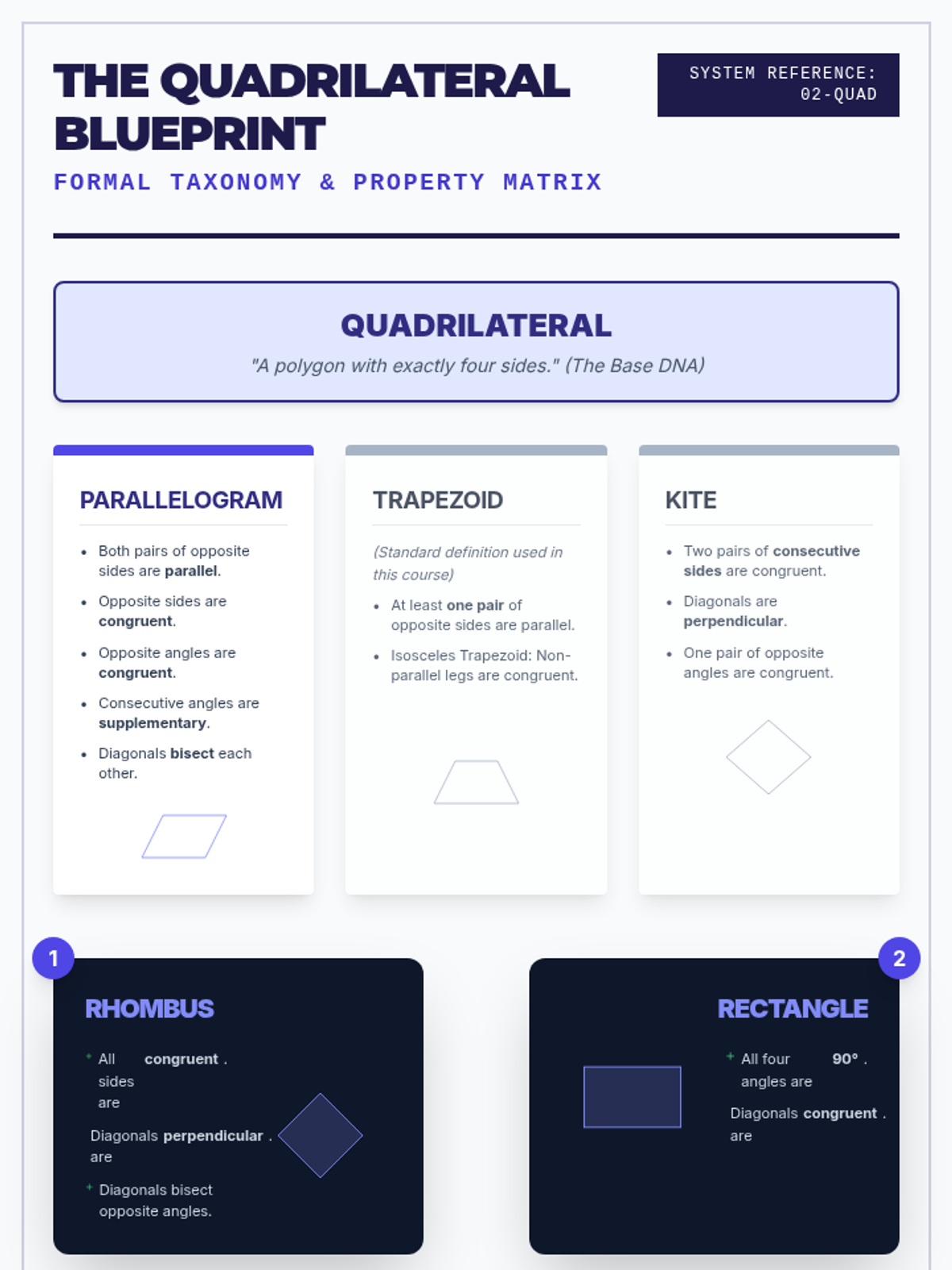 A 9th-grade geometry sequence exploring the logical hierarchy of polygons, focusing on rigorous definitions, property inheritance, and conditional logic. Students transition from visual identification to formal classification using Venn and Euler diagrams.
