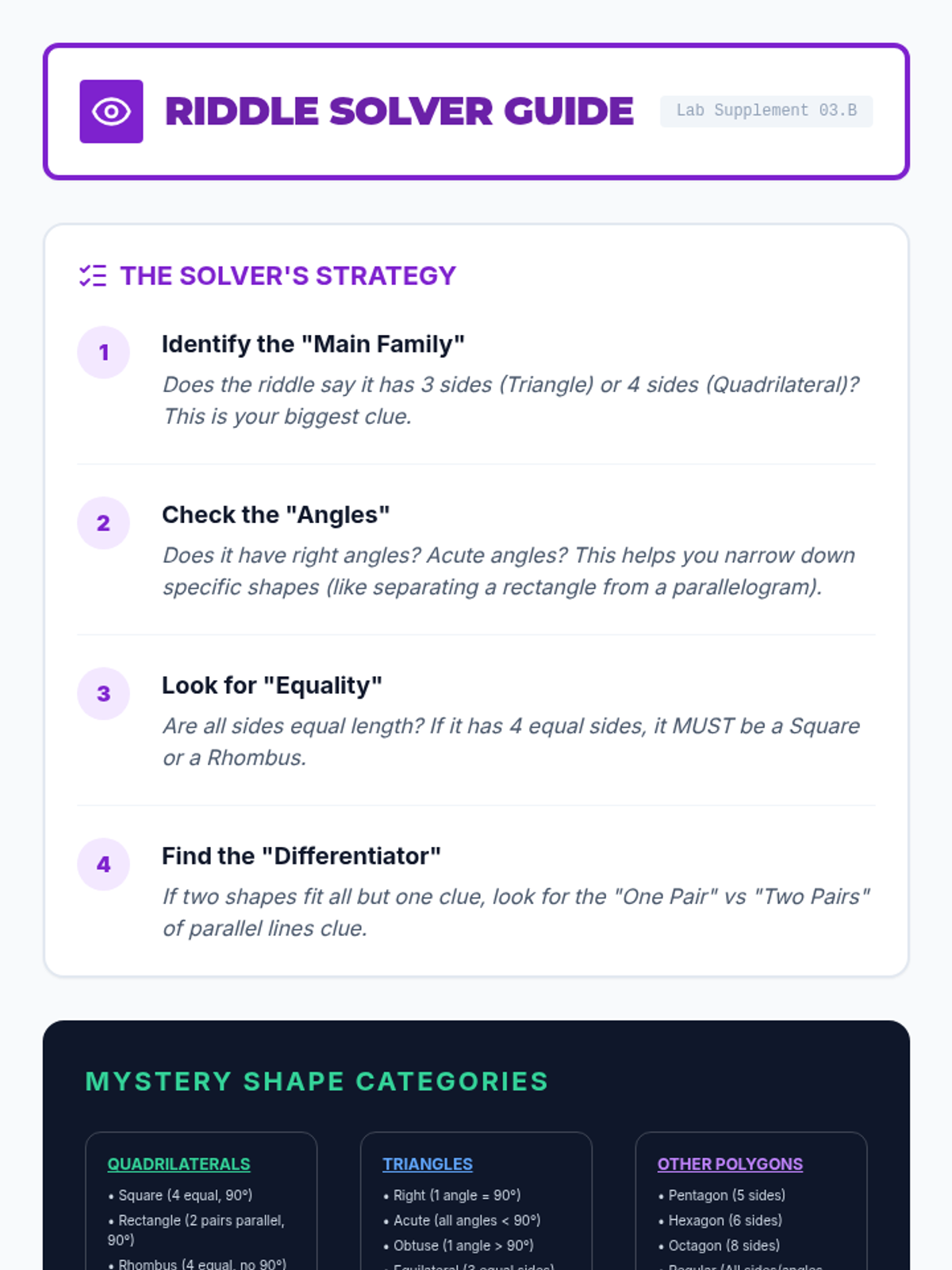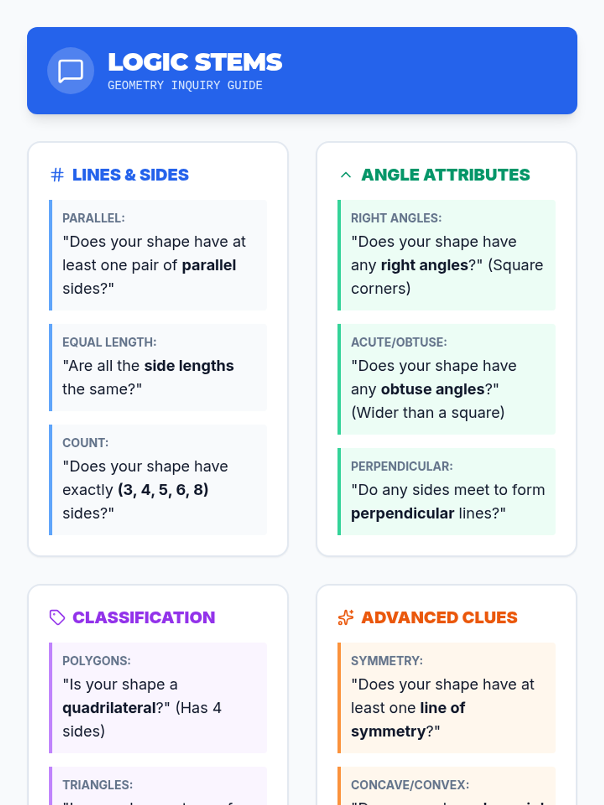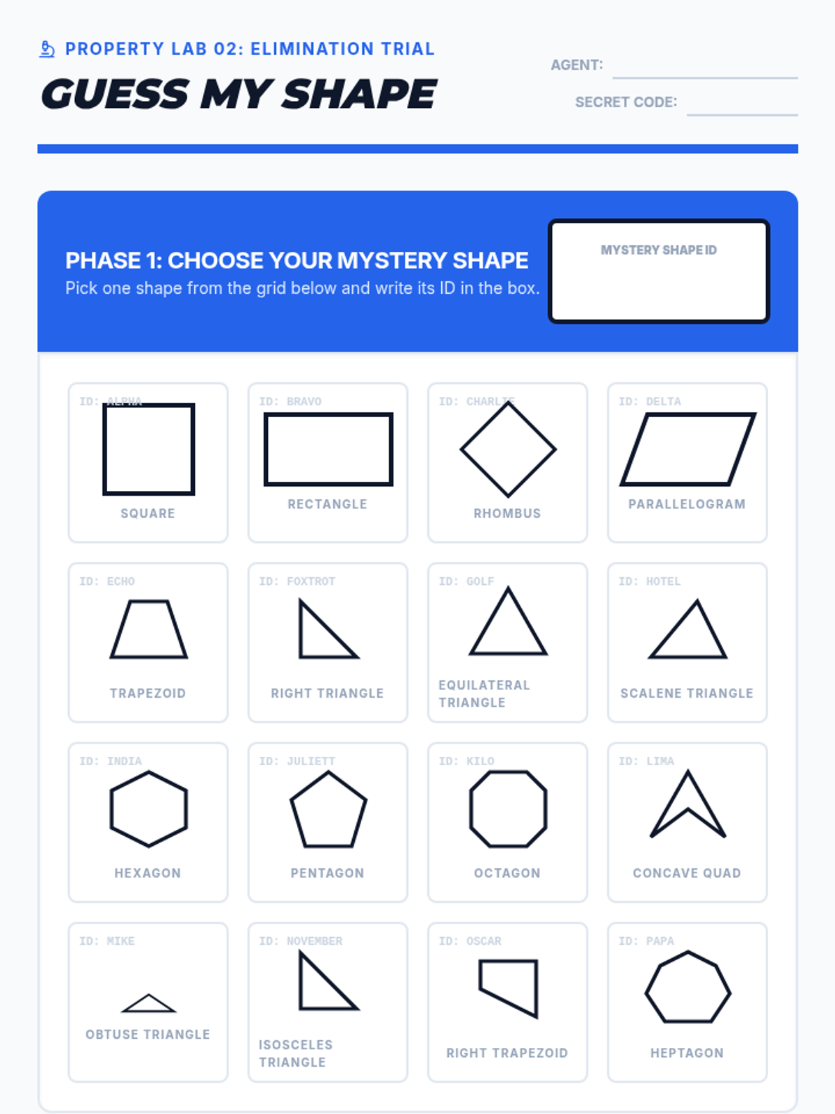 A game-based sequence focused on rapid identification and logical deduction using polygon properties through bingo, riddles, and simulations. Students build fluency in identifying shapes and distinguishing between subtle differences.