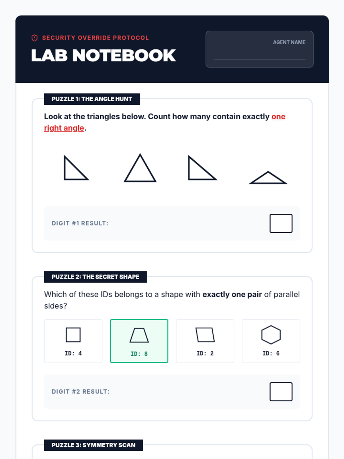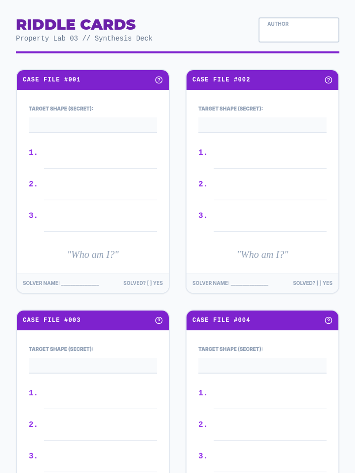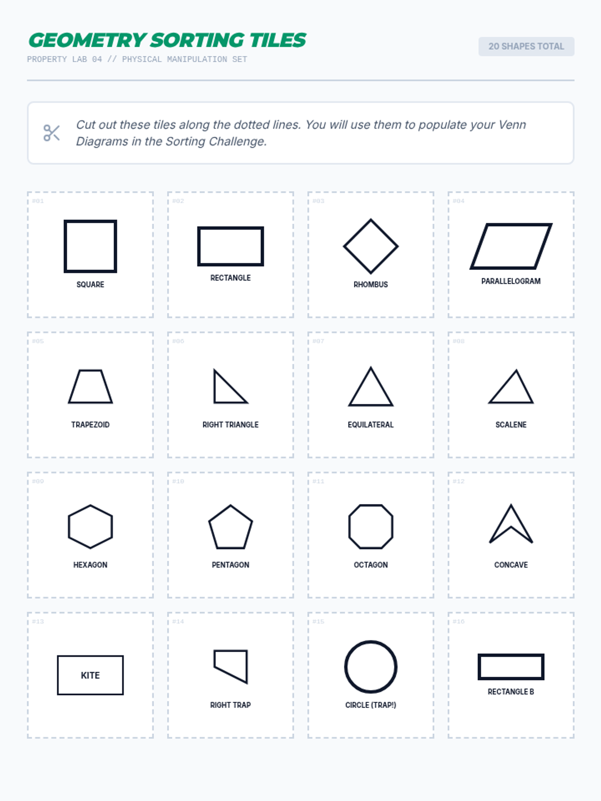 A game-based sequence focused on rapid identification and logical deduction using polygon properties through bingo, riddles, and simulations. Students build fluency in identifying shapes and distinguishing between subtle differences.