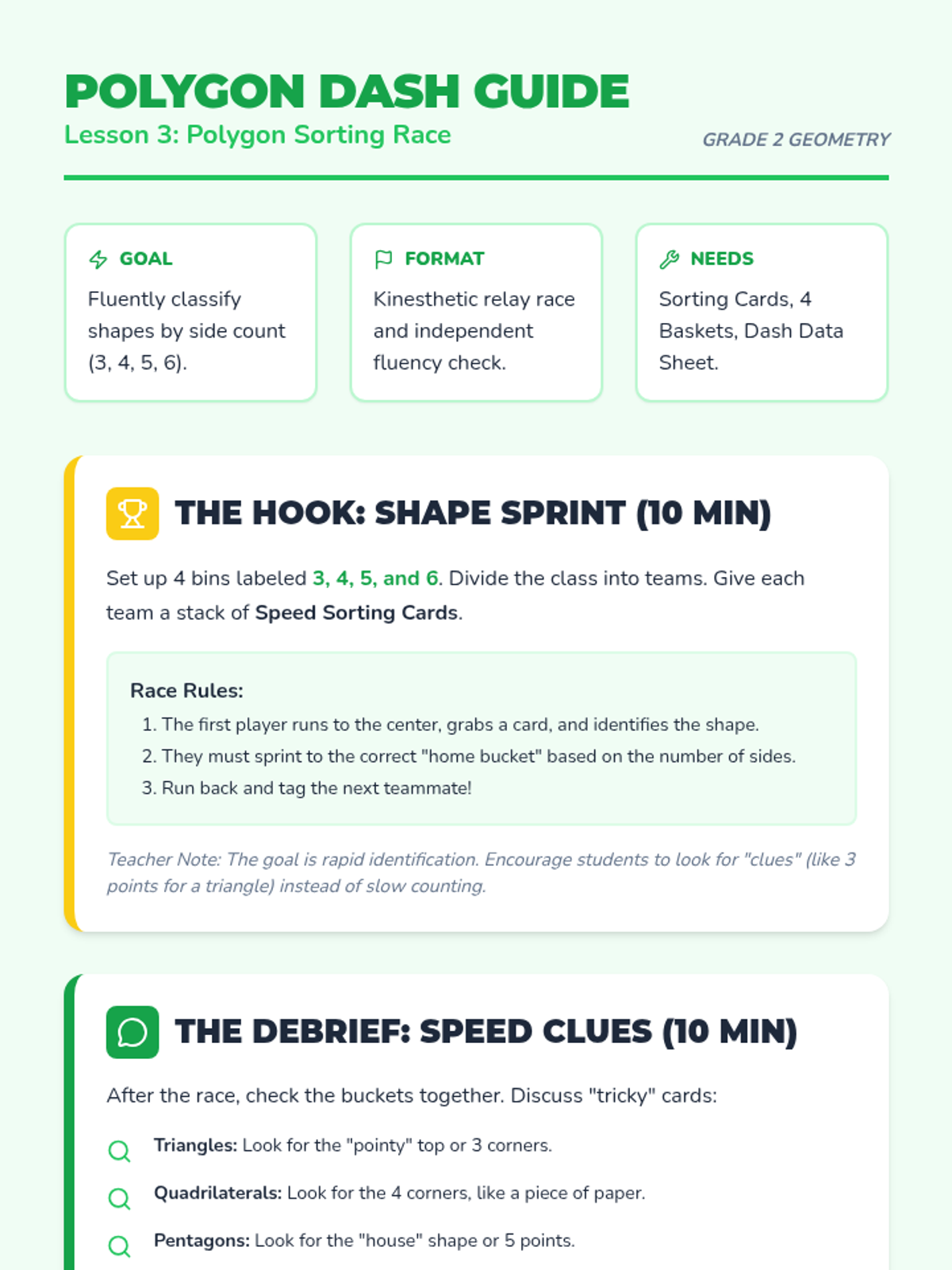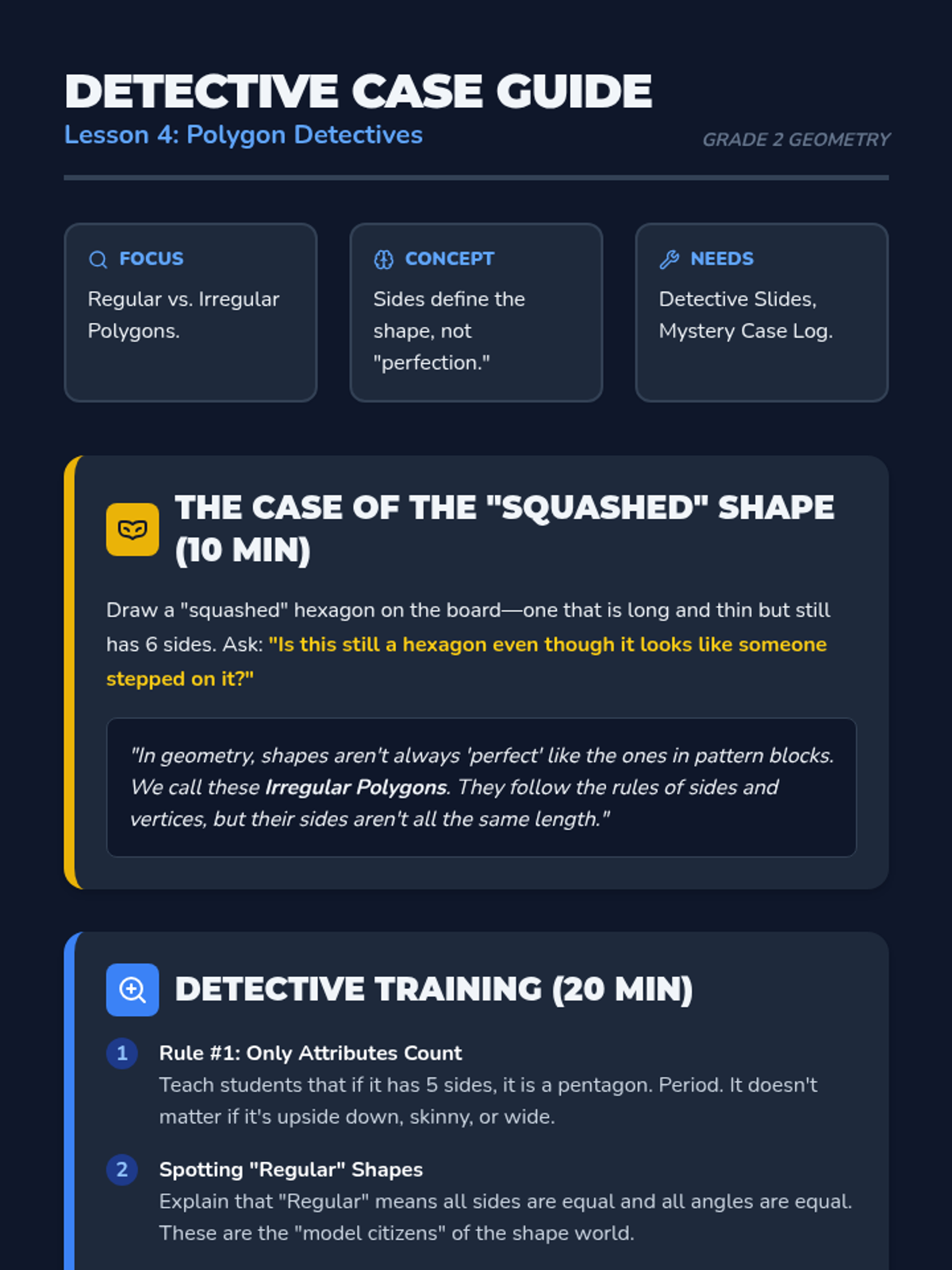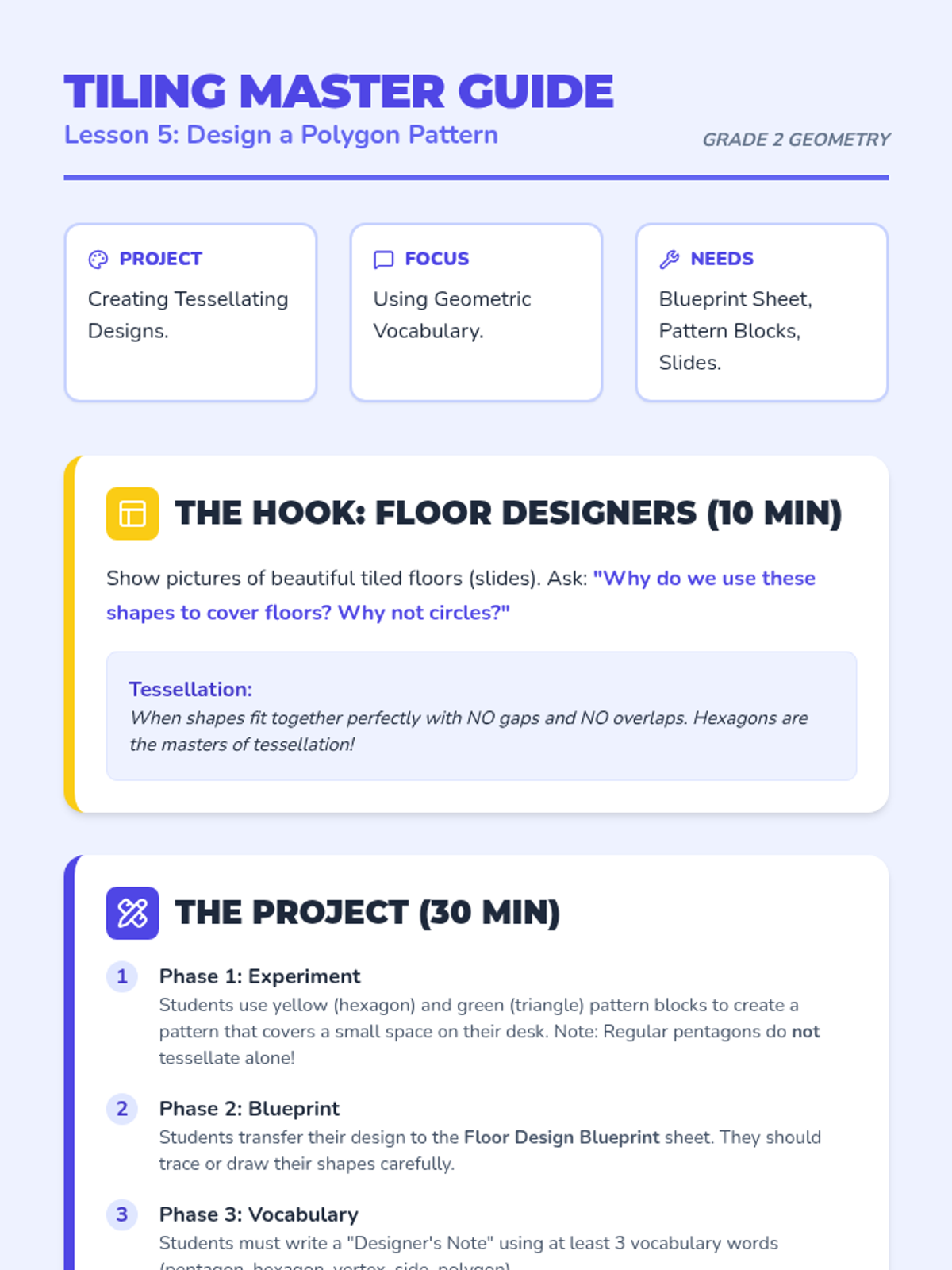 A comprehensive 2nd Grade geometry sequence focused on identifying and classifying pentagons and hexagons. Students progress from basic attribute recognition to identifying irregular polygons and creating tessellating patterns through games and hands-on activities.