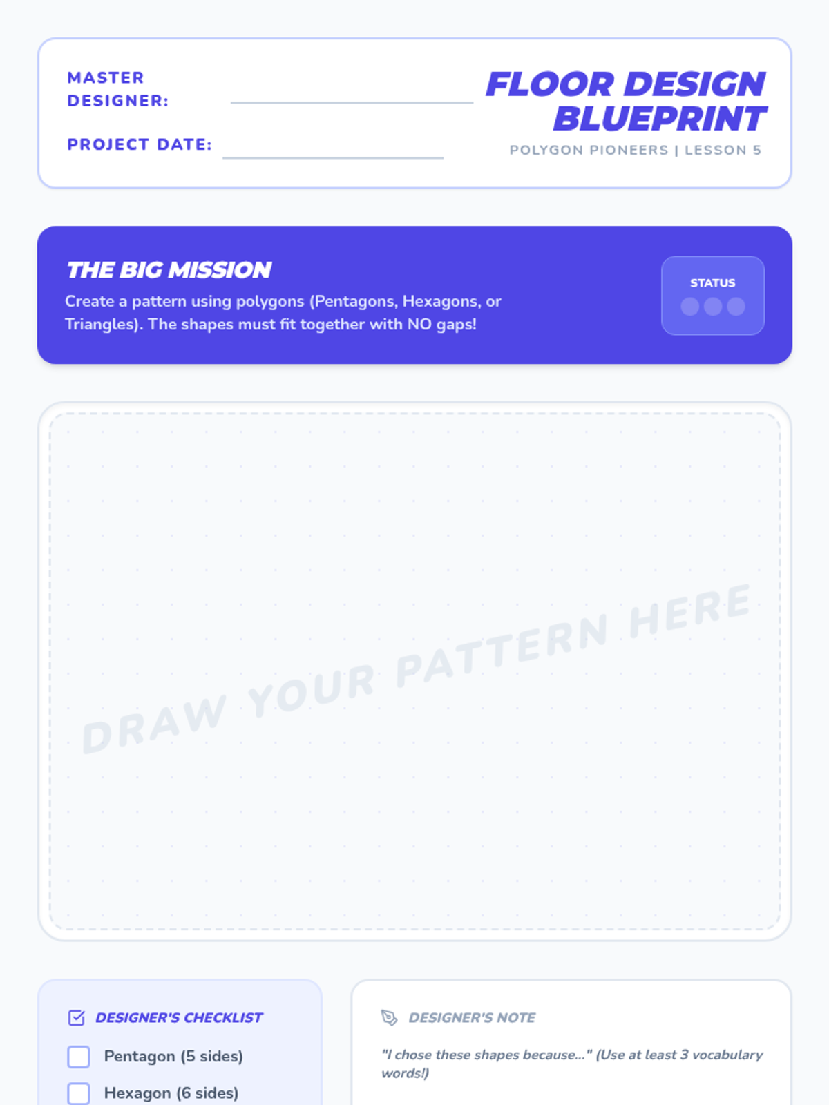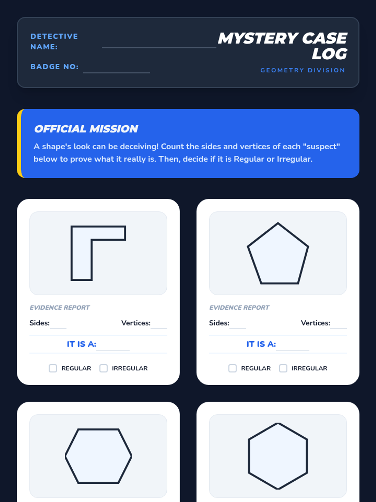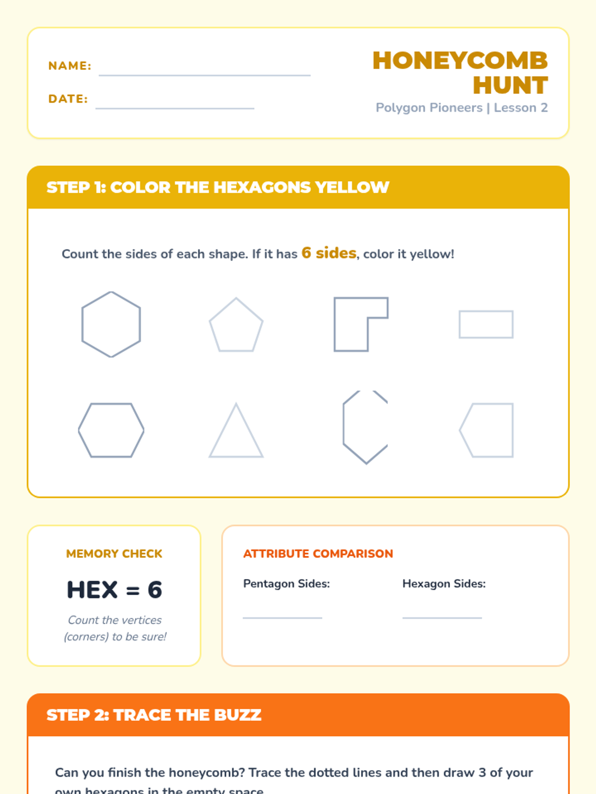 A comprehensive 2nd Grade geometry sequence focused on identifying and classifying pentagons and hexagons. Students progress from basic attribute recognition to identifying irregular polygons and creating tessellating patterns through games and hands-on activities.