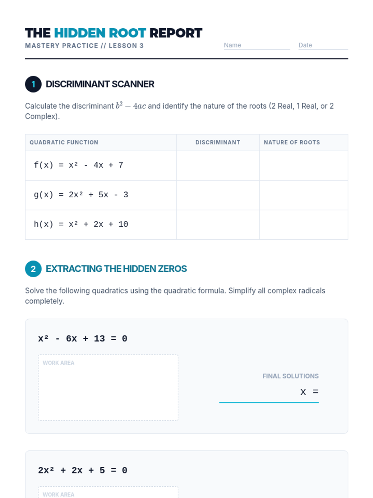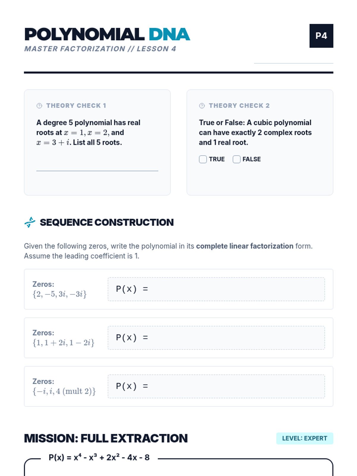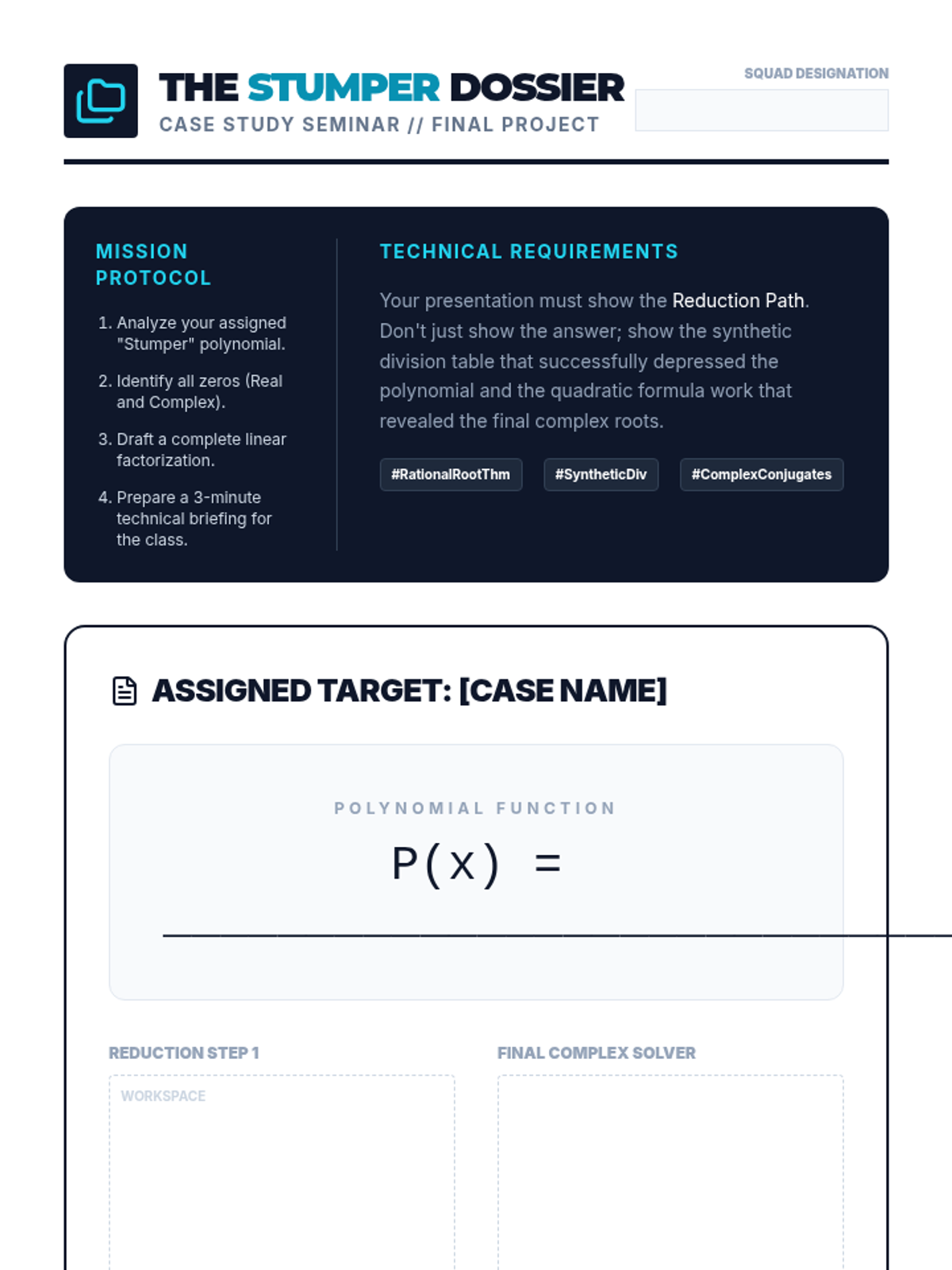 A high-level algebra sequence for 12th-grade students focused on uncovering complex roots in higher-degree polynomials using synthetic division, the Rational Root Theorem, and the Fundamental Theorem of Algebra. Students will learn to fully factor polynomials over the complex field, transitioning from real-root detection to identifying 'hidden' imaginary solutions.