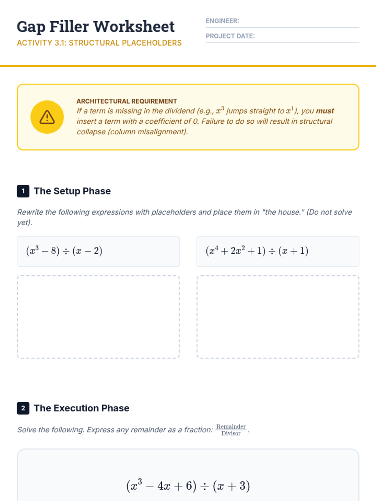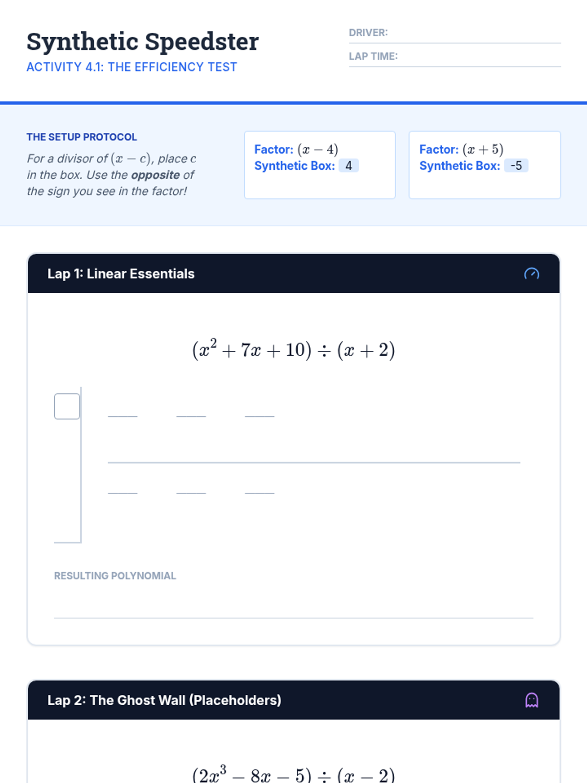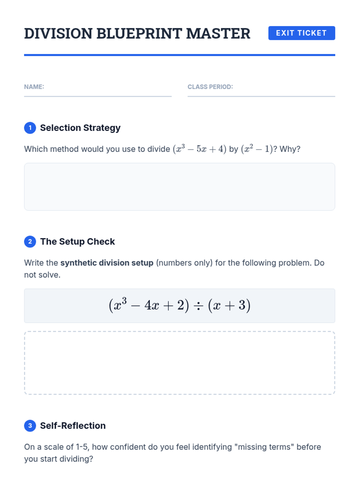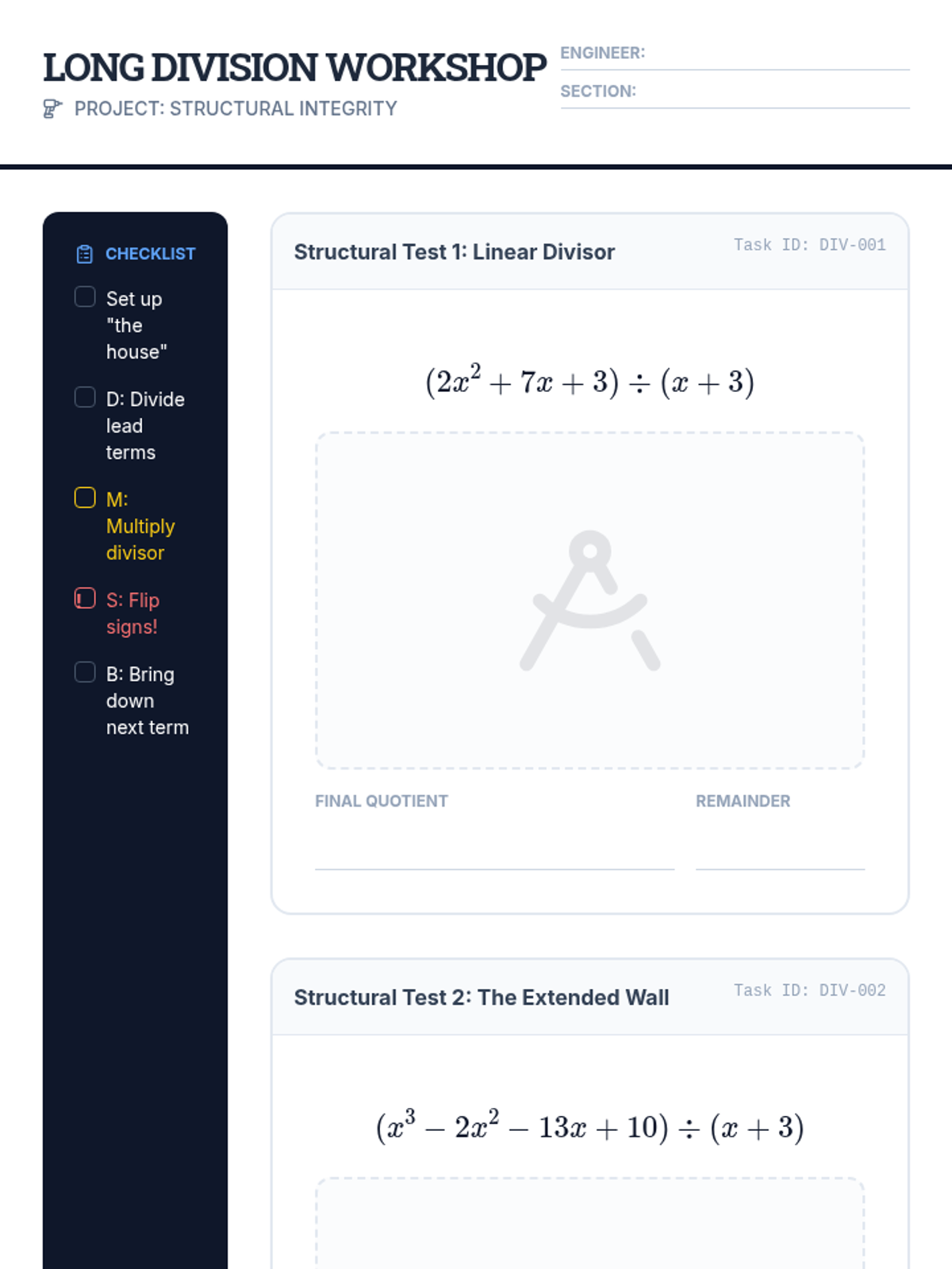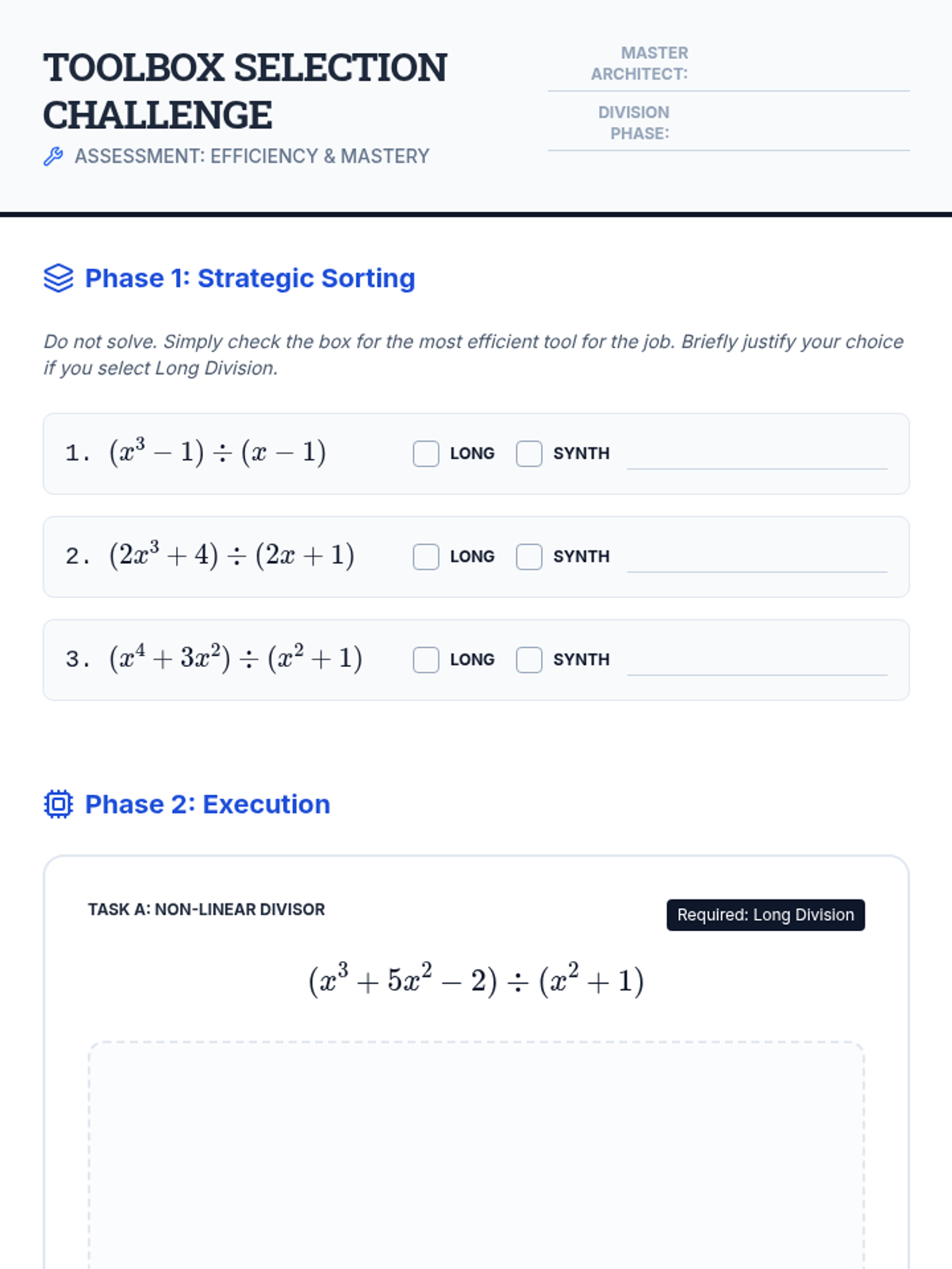 A comprehensive 5-lesson unit focusing on the algorithmic mechanics of polynomial division, bridging arithmetic knowledge with algebraic mastery. Students transition from integer long division to polynomial long division and synthetic division, culminating in method evaluation and proficiency.