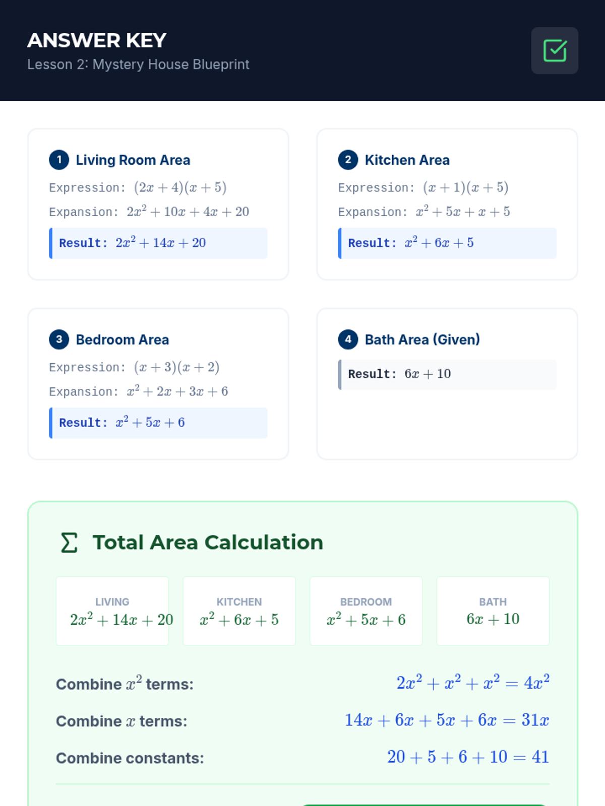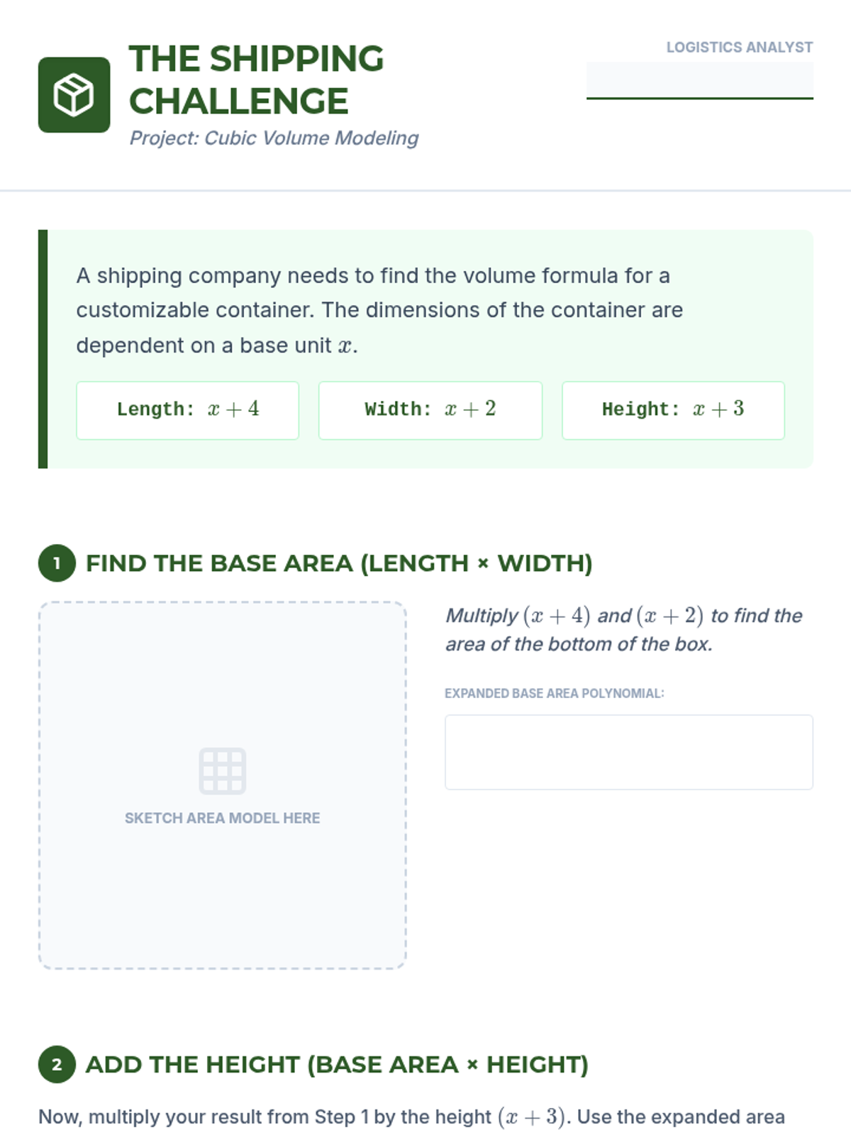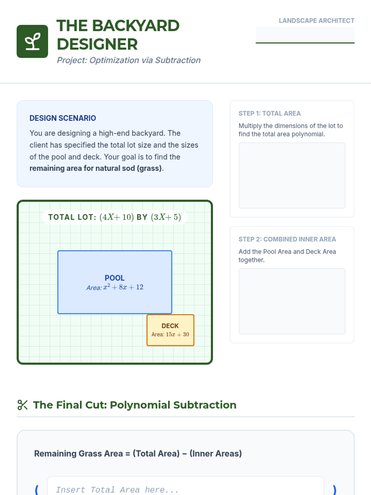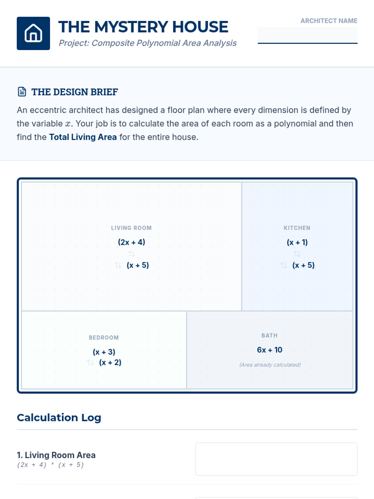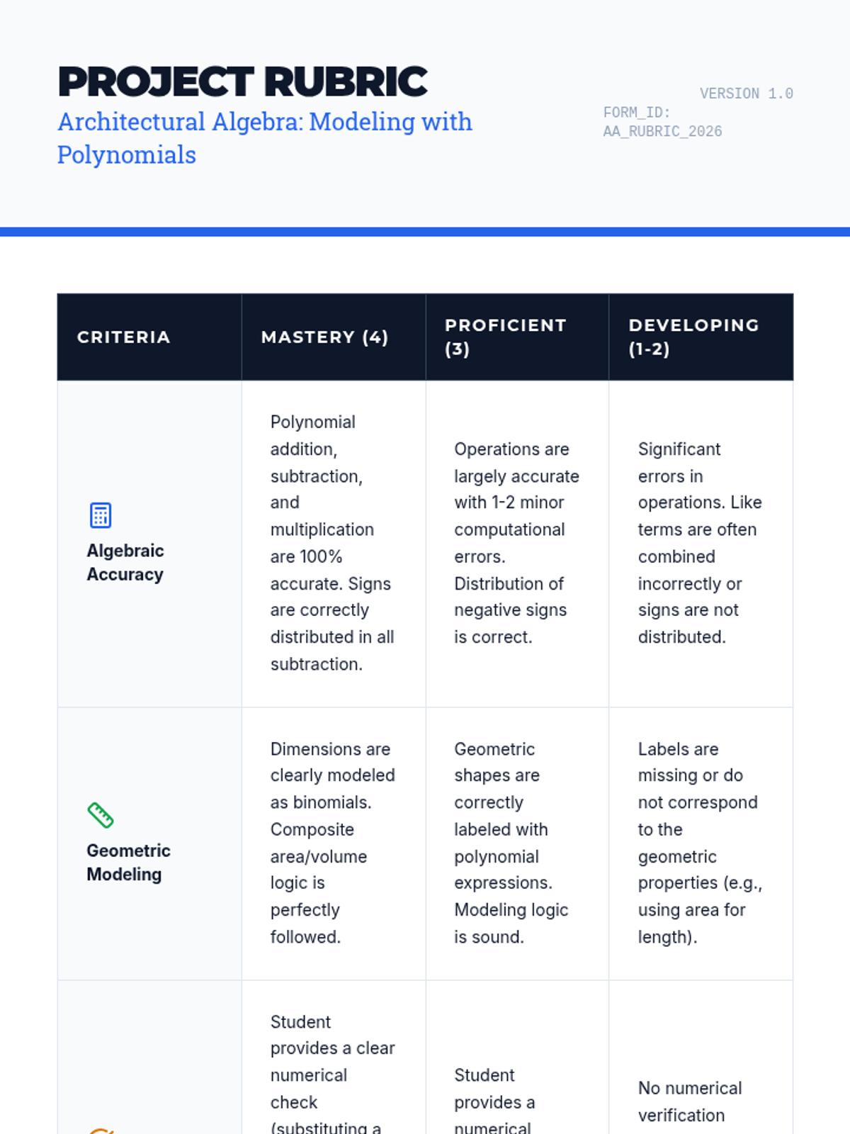 A 10th-grade algebra project where students connect polynomial operations to geometric modeling of area and volume. Students act as architectural designers, using addition, subtraction, and multiplication of polynomials to calculate dimensions for floor plans, shipping containers, and landscapes.