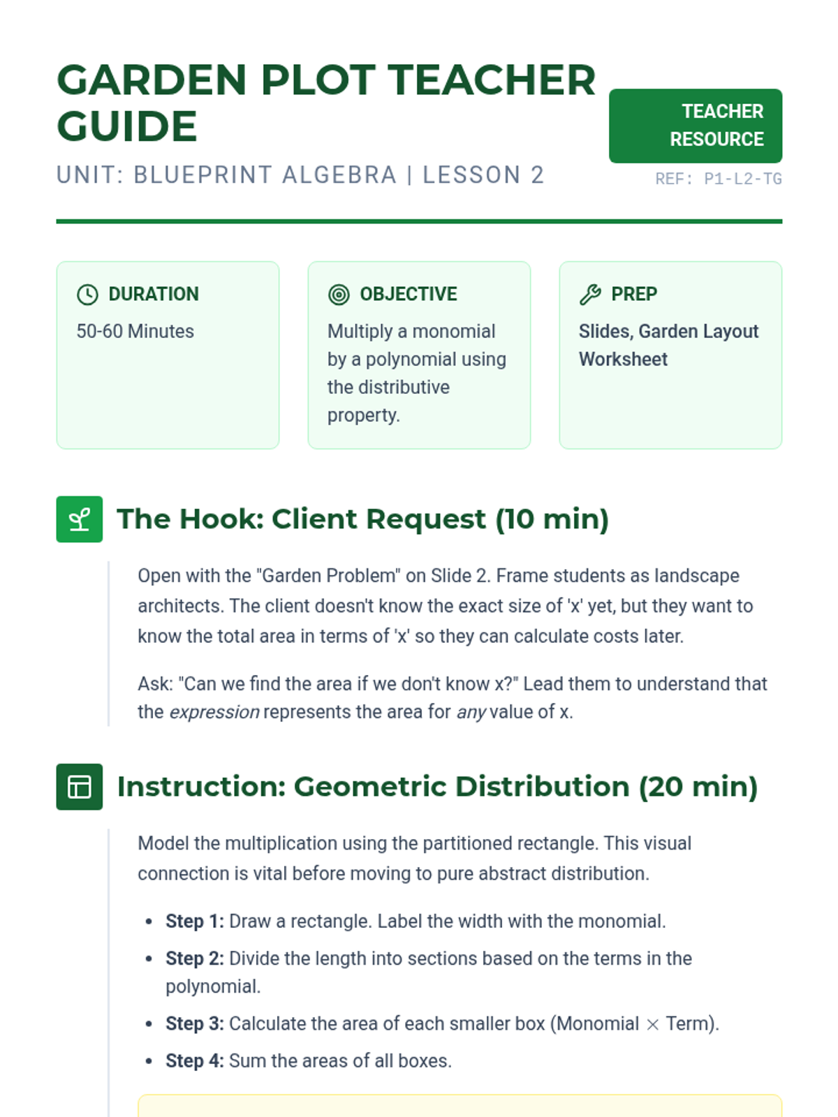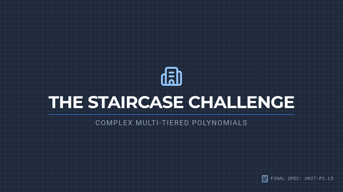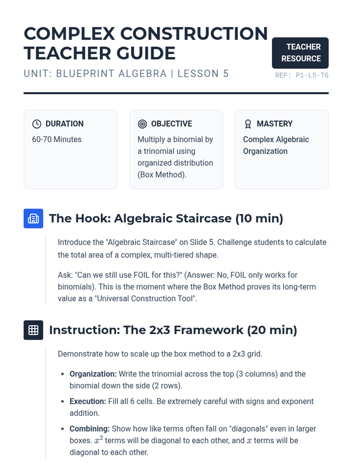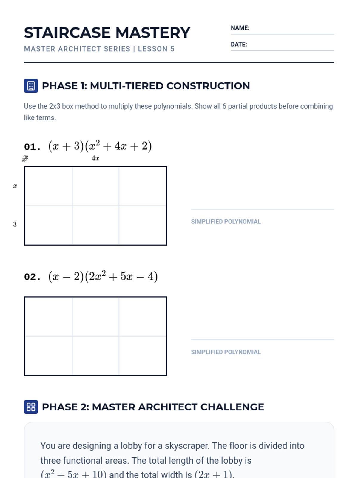 A 5-lesson unit focusing on polynomial multiplication using geometric modeling (the Area Model/Box Method). Students transition from basic exponent rules to complex binomial and trinomial interactions through a blueprint-themed construction approach.