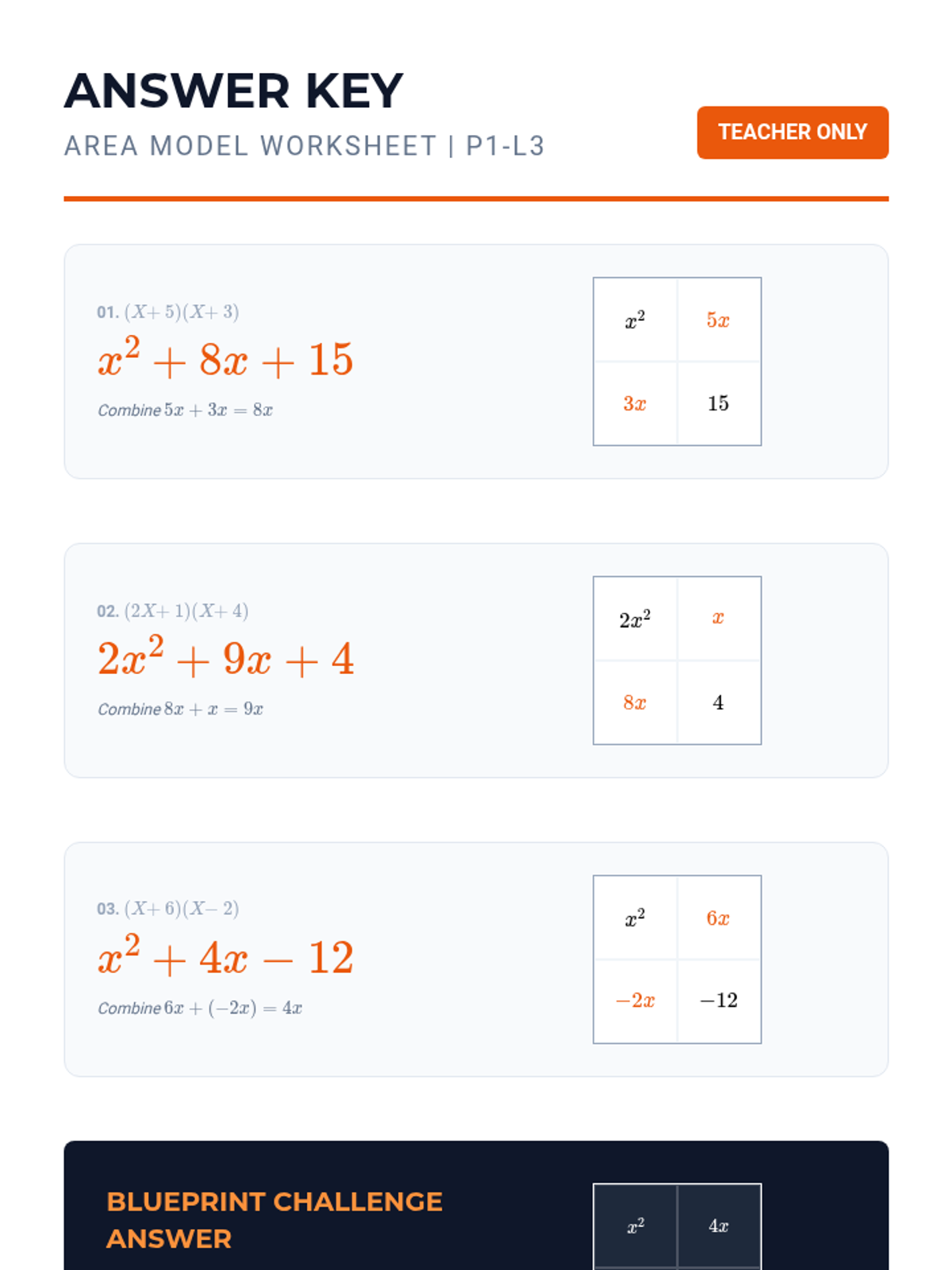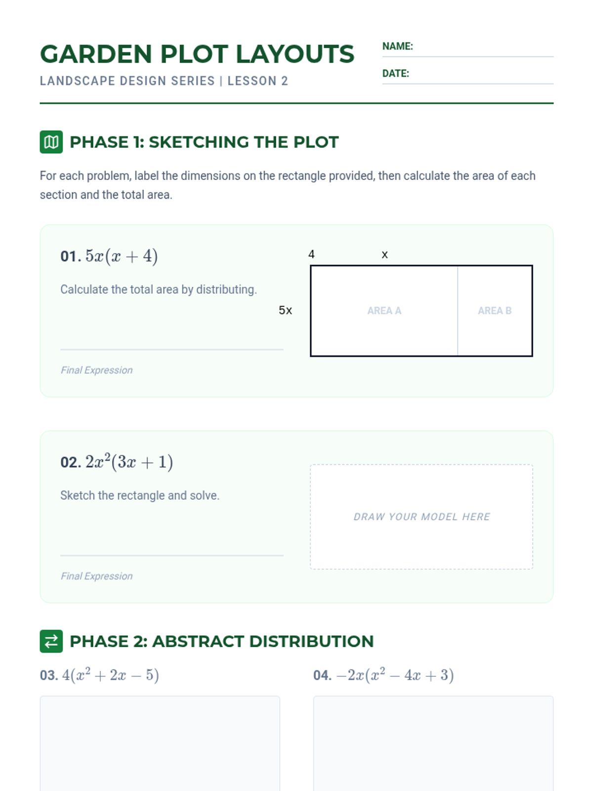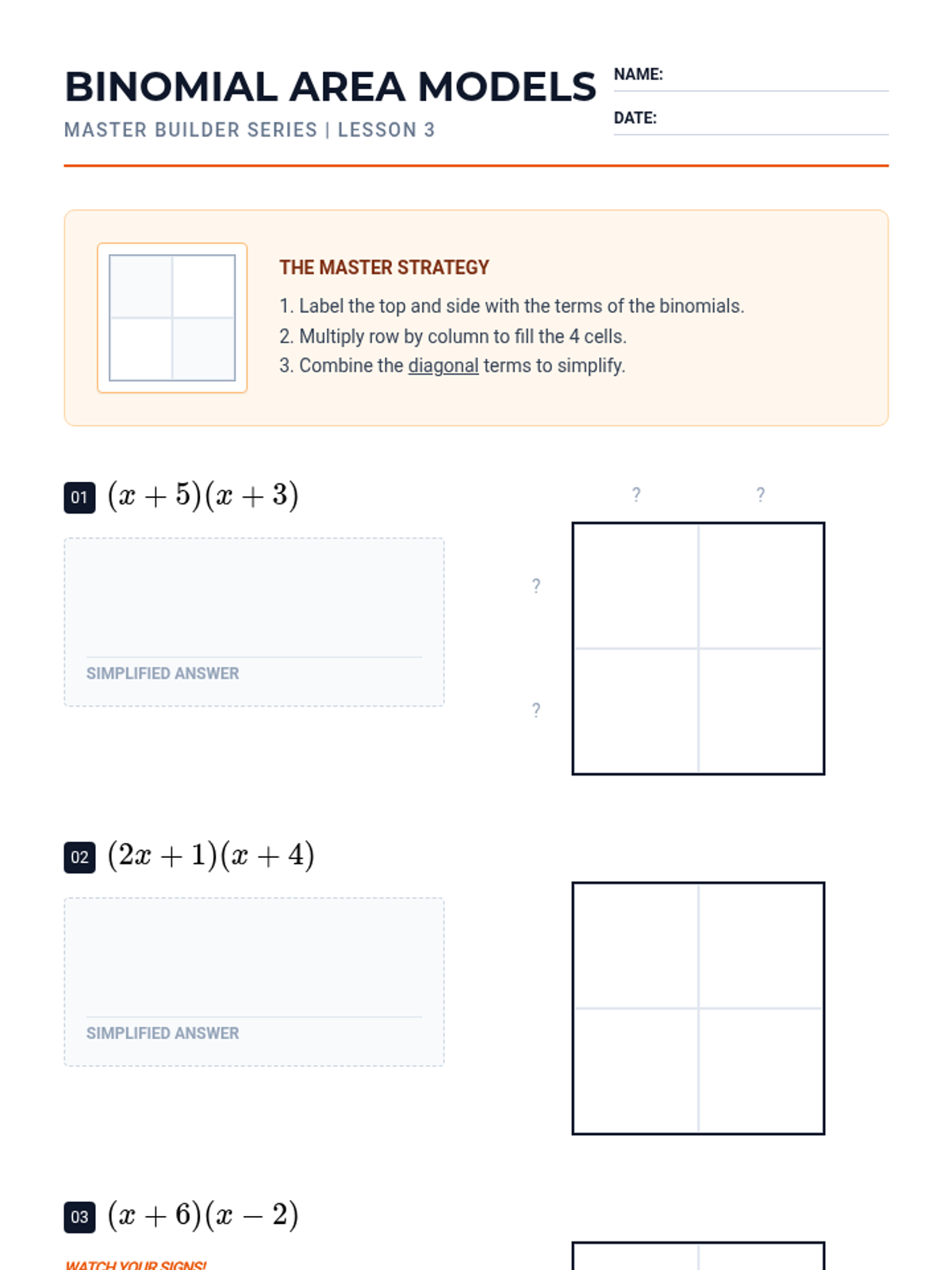A 5-lesson unit focusing on polynomial multiplication using geometric modeling (the Area Model/Box Method). Students transition from basic exponent rules to complex binomial and trinomial interactions through a blueprint-themed construction approach.