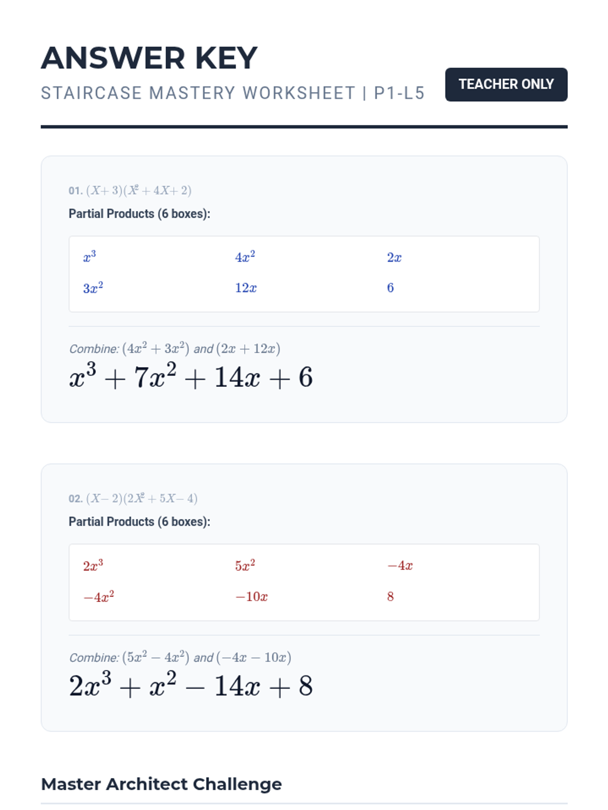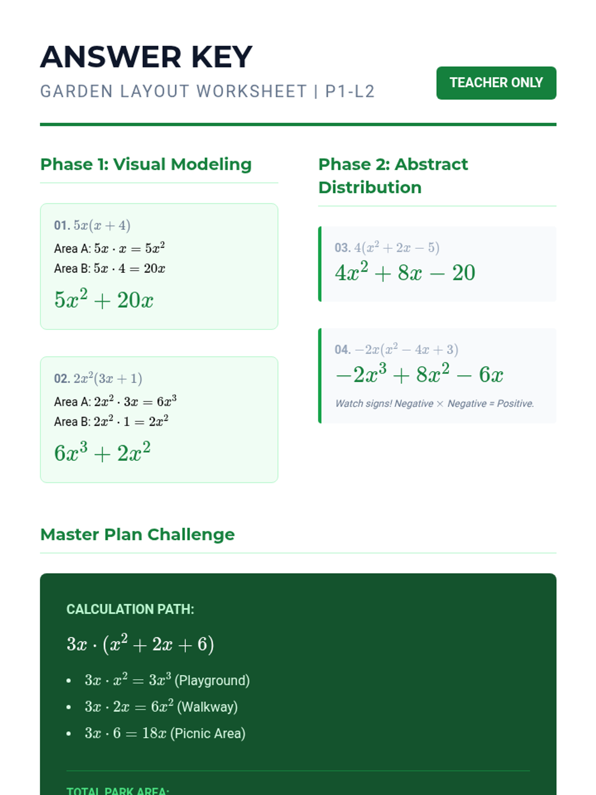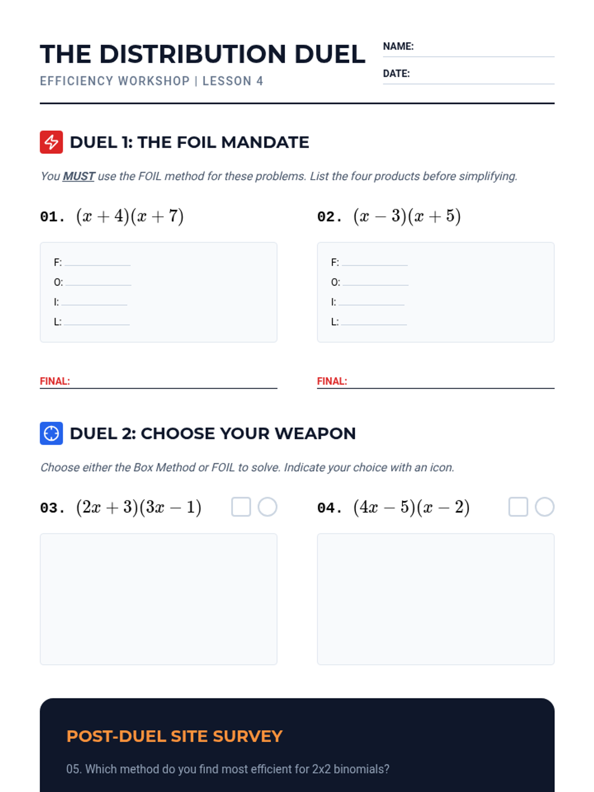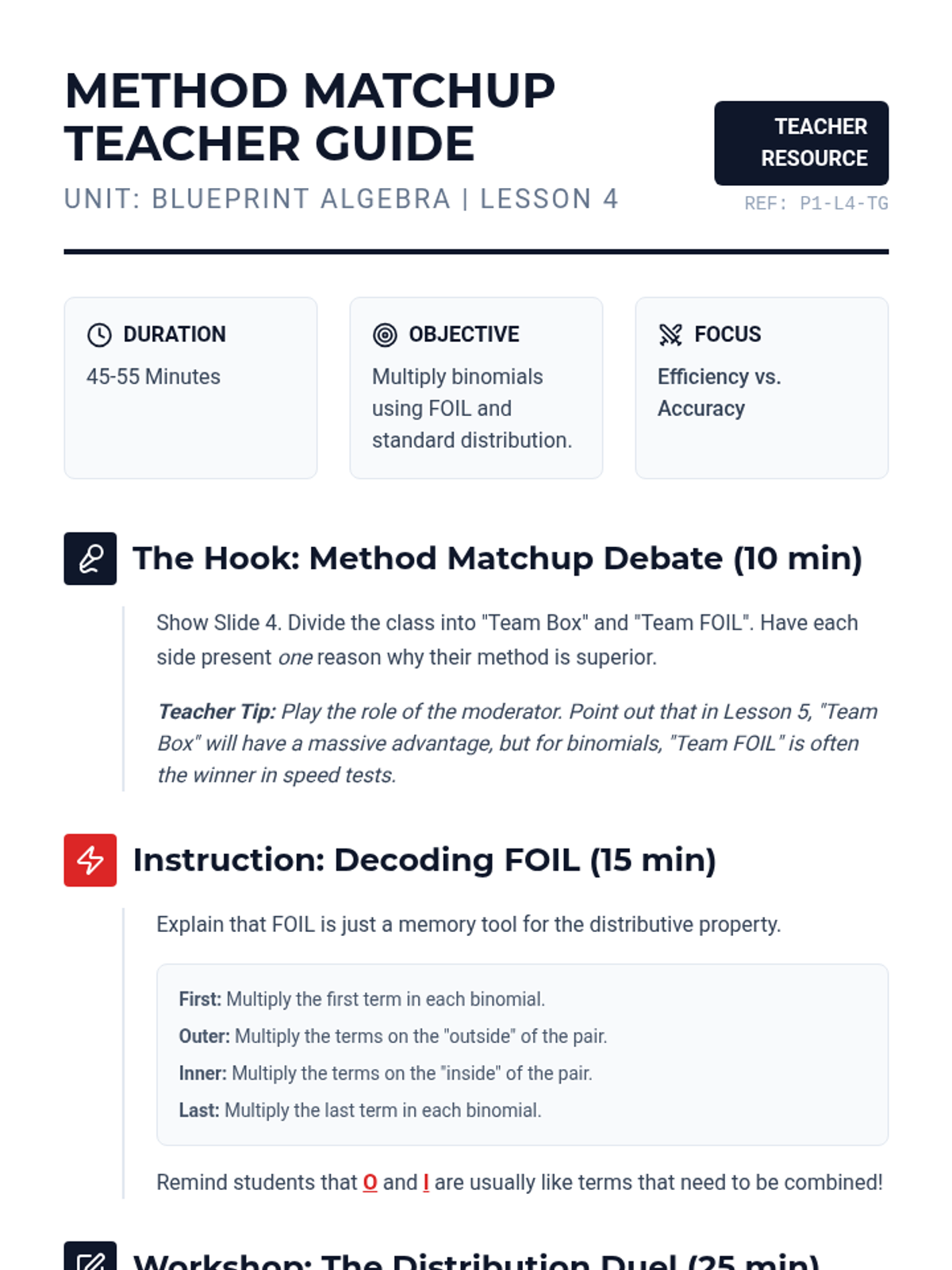 A 5-lesson unit focusing on polynomial multiplication using geometric modeling (the Area Model/Box Method). Students transition from basic exponent rules to complex binomial and trinomial interactions through a blueprint-themed construction approach.