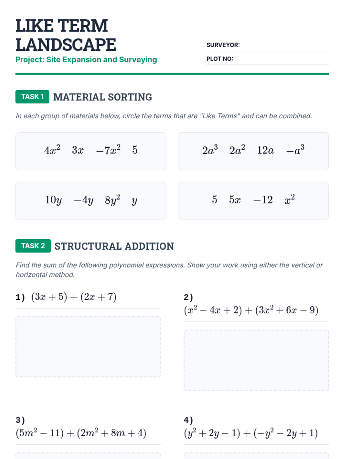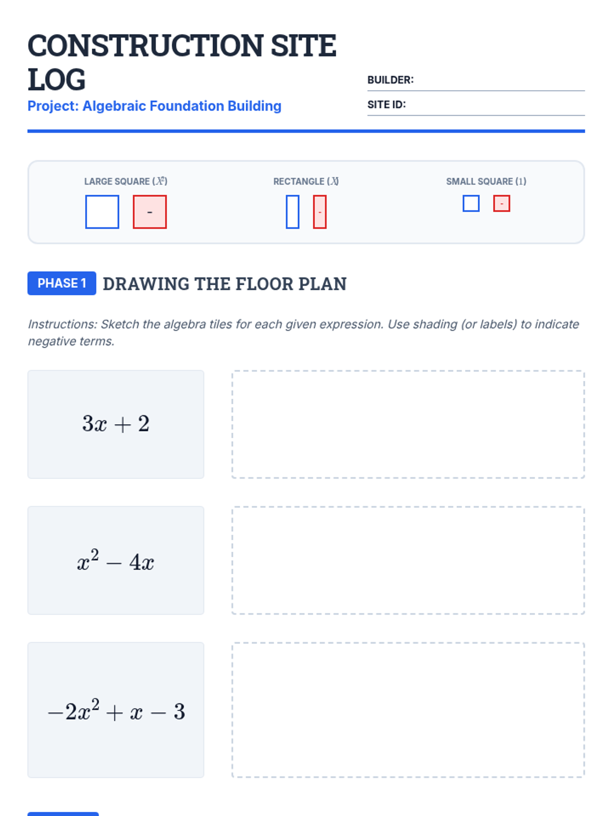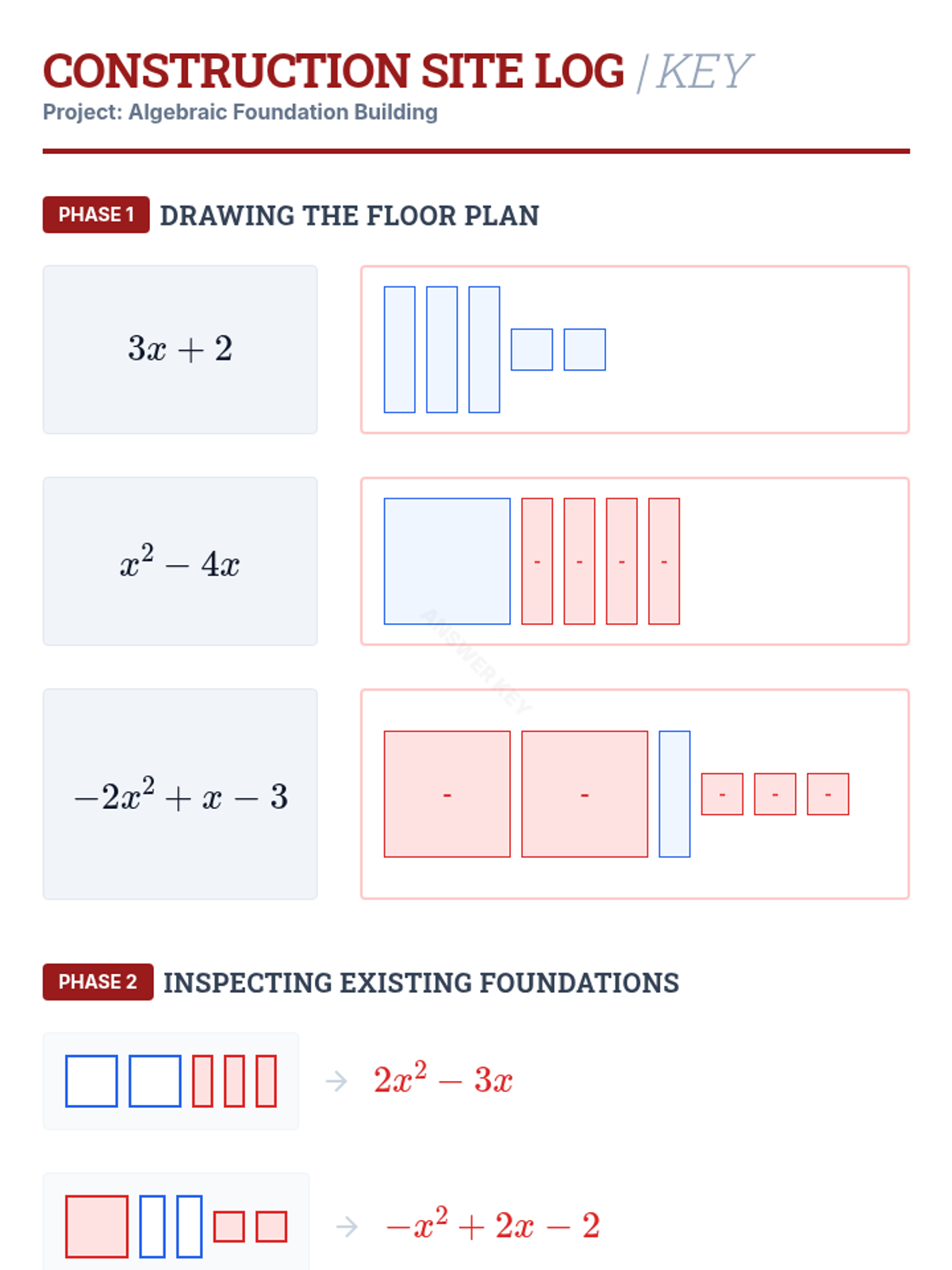 A comprehensive introduction to polynomials for 8th-grade students, covering classification, modeling with algebra tiles, addition, and subtraction using a blueprint/architectural theme.
