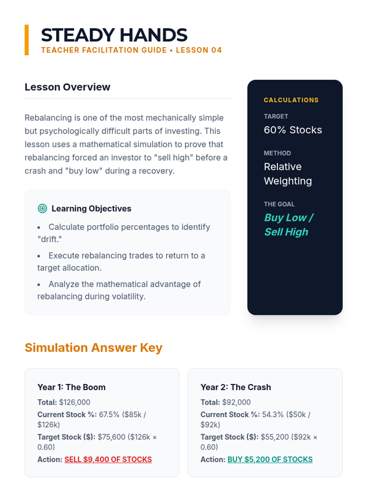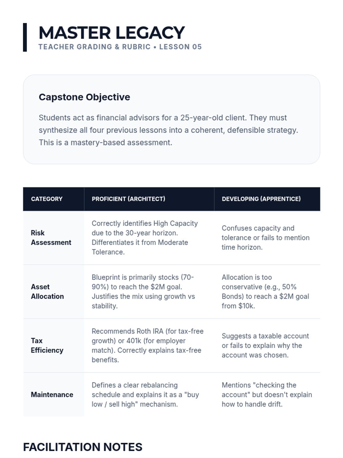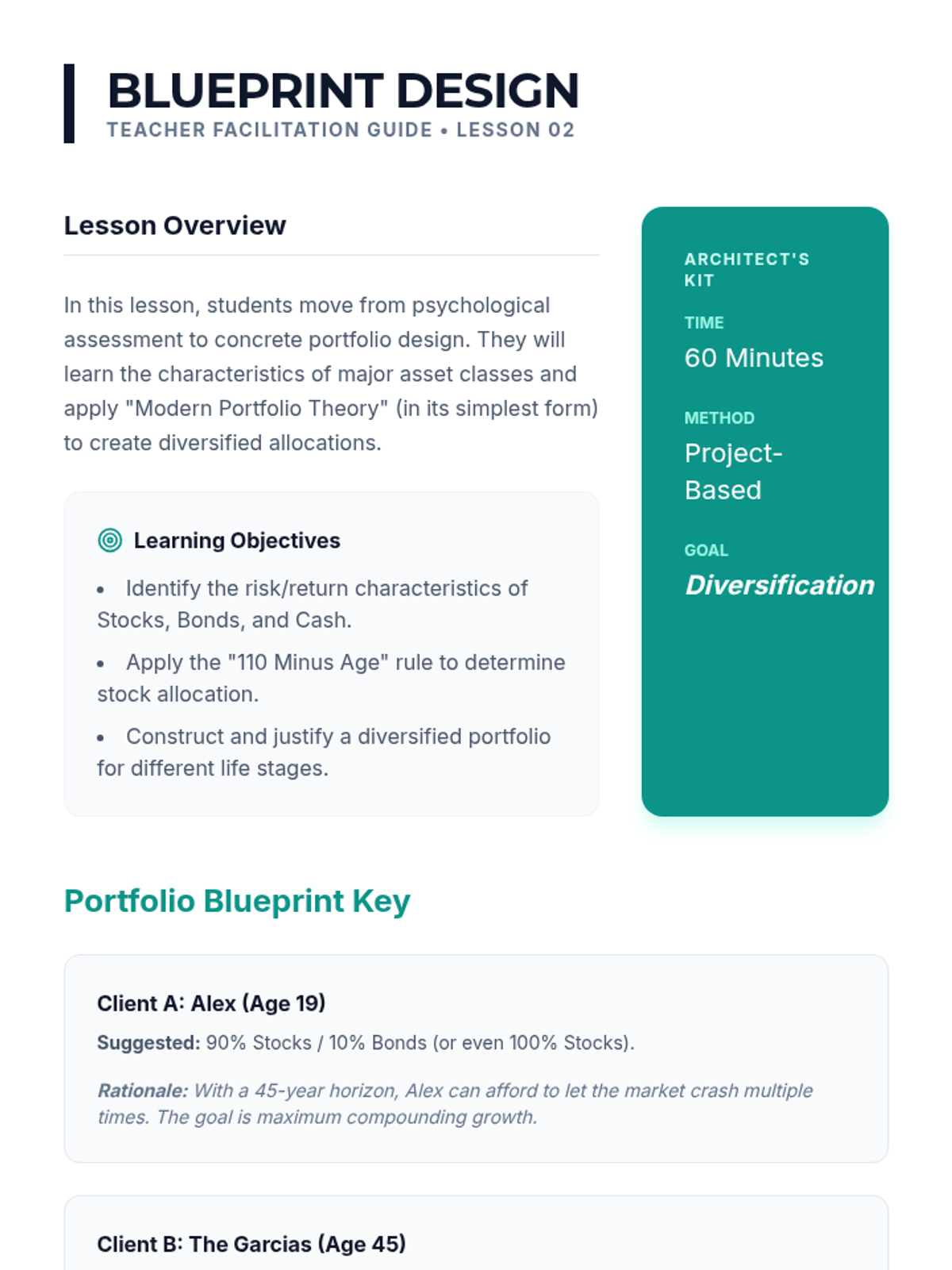 A comprehensive financial literacy sequence for 10th graders focused on asset allocation, risk management, and long-term investment planning. Students progress from understanding personal risk to designing complex portfolios and tax-advantaged strategies.