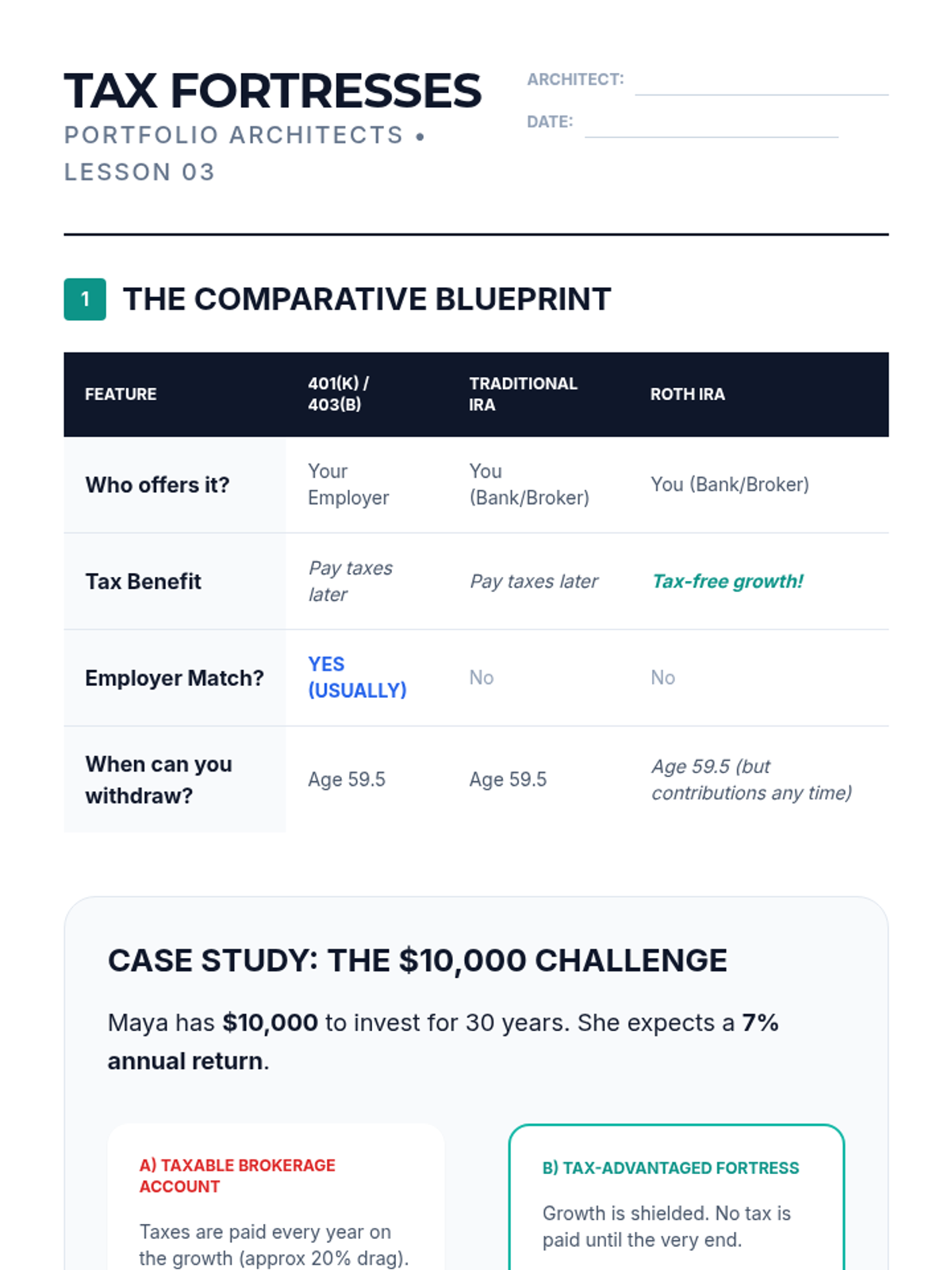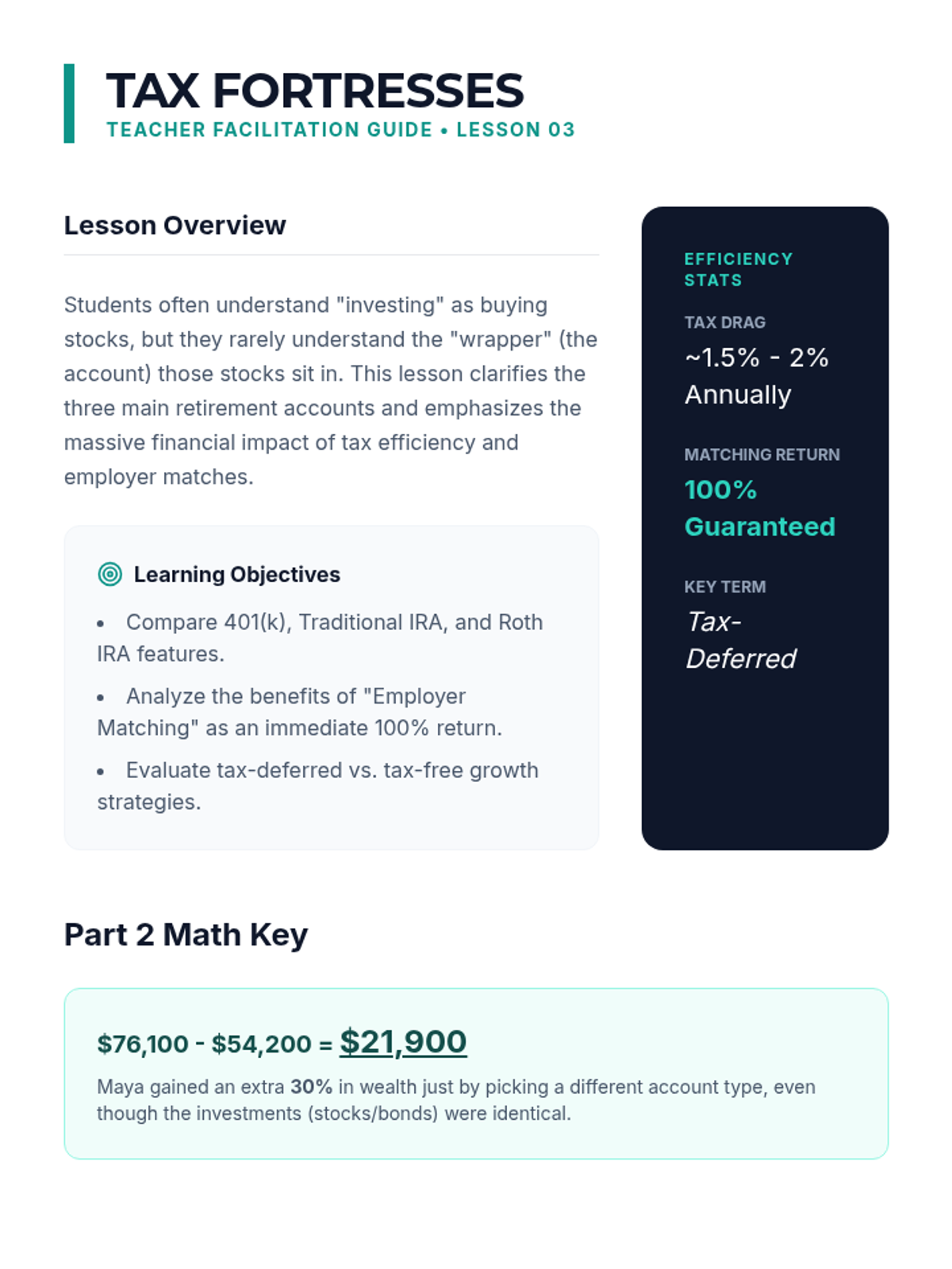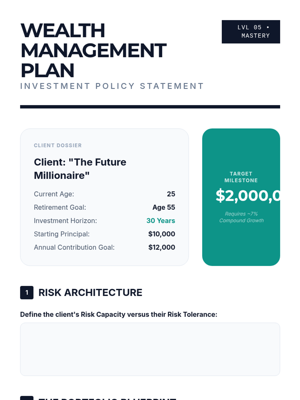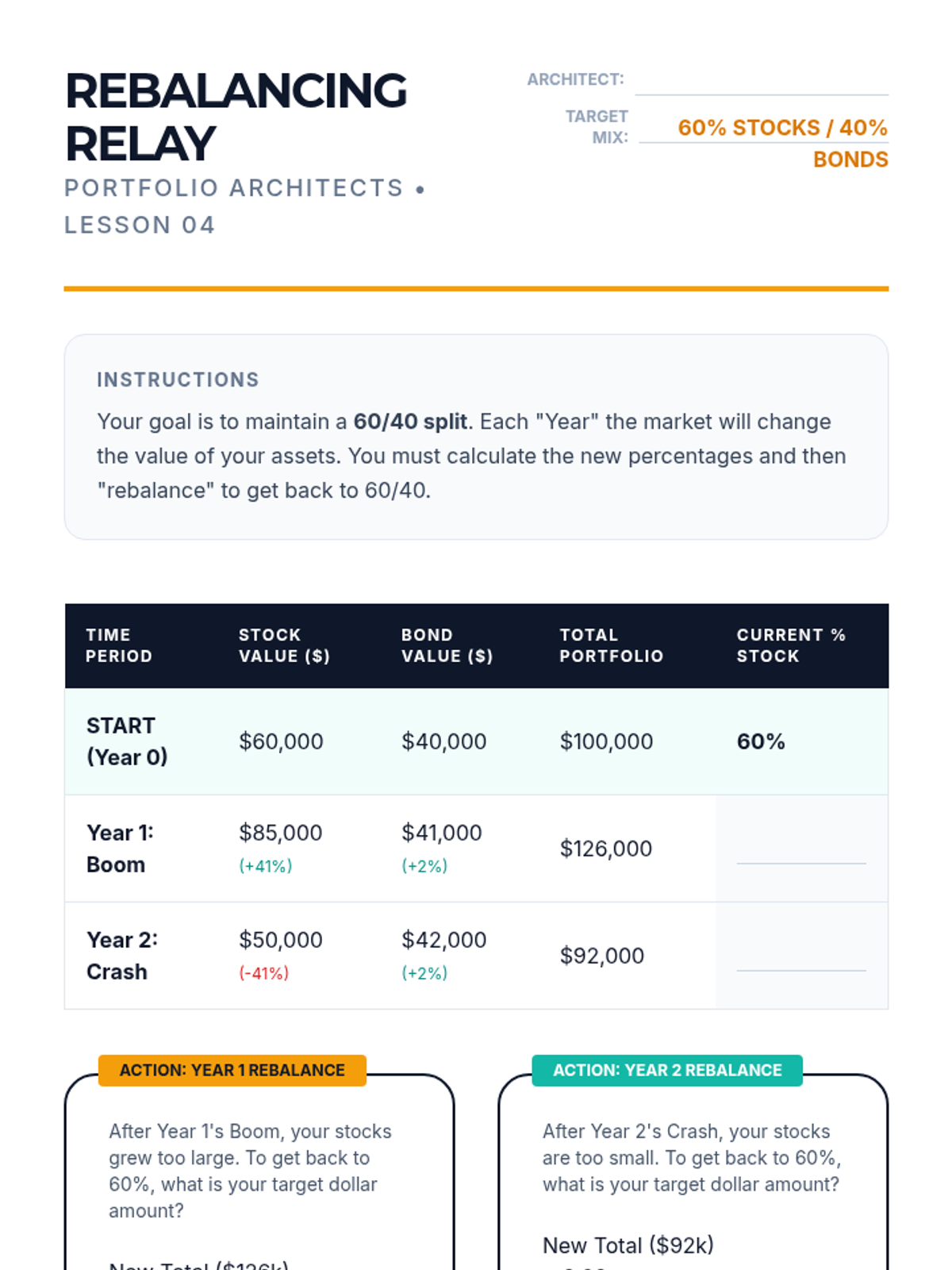 A comprehensive financial literacy sequence for 10th graders focused on asset allocation, risk management, and long-term investment planning. Students progress from understanding personal risk to designing complex portfolios and tax-advantaged strategies.