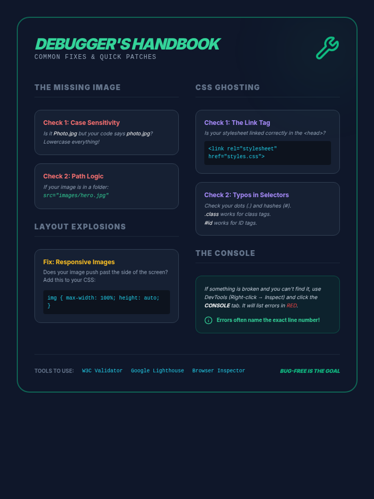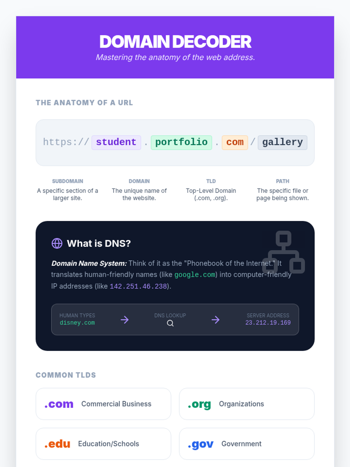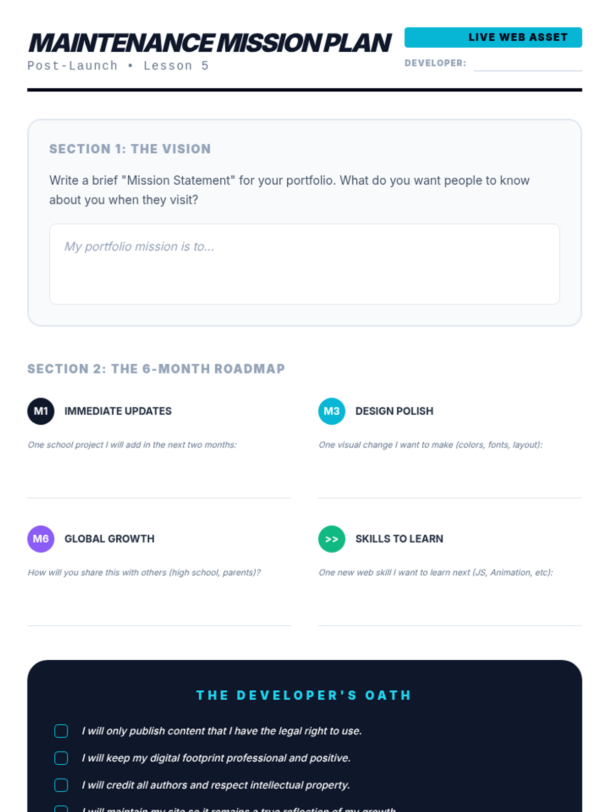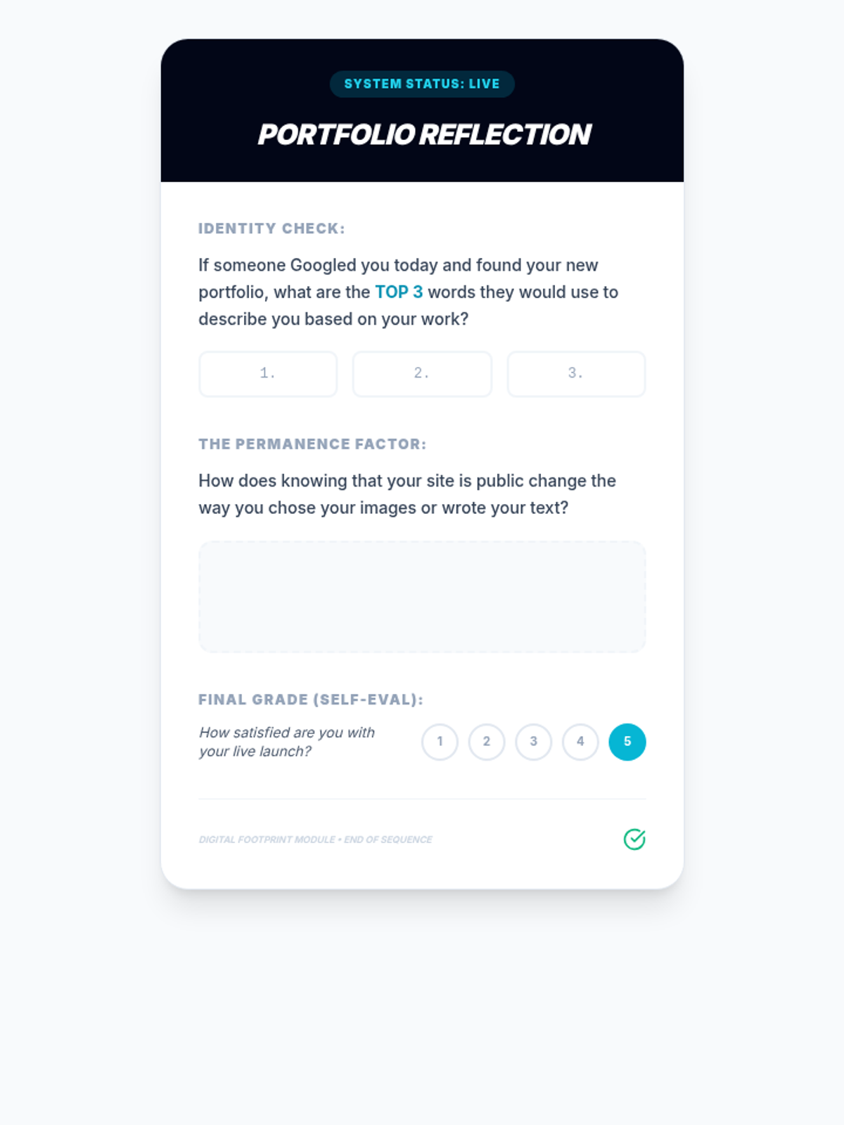 A comprehensive sequence for 7th graders on web design and publishing, focusing on digital file management, intellectual property, web hosting, quality assurance, and digital footprint management. Students move from local development to a live, professional web presence.