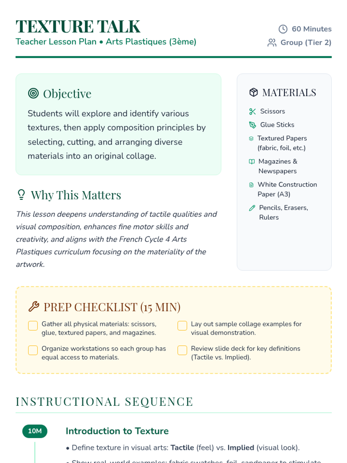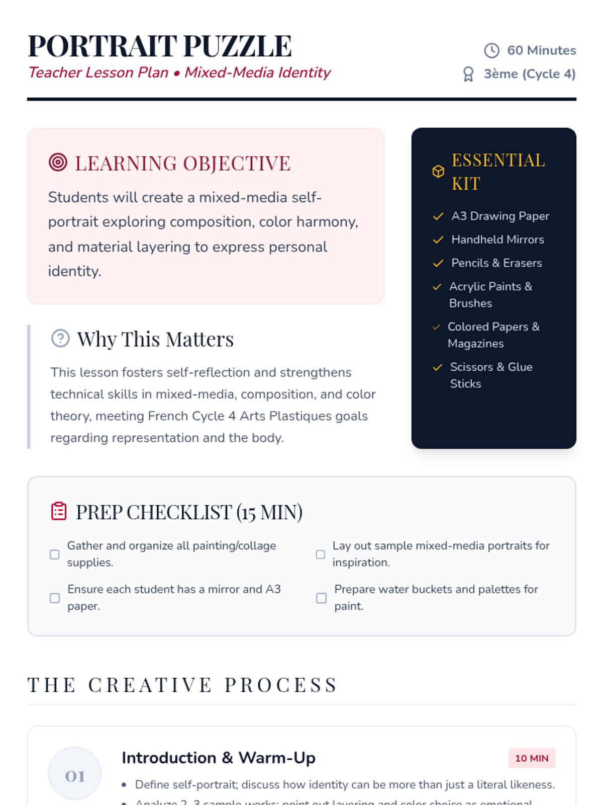 A creative art sequence for 9th-grade students focusing on the exploration of texture, collage, and mixed-media self-portraiture to express personal identity. Students progress from foundational tactile experimentation to a complex, multi-layered final project.