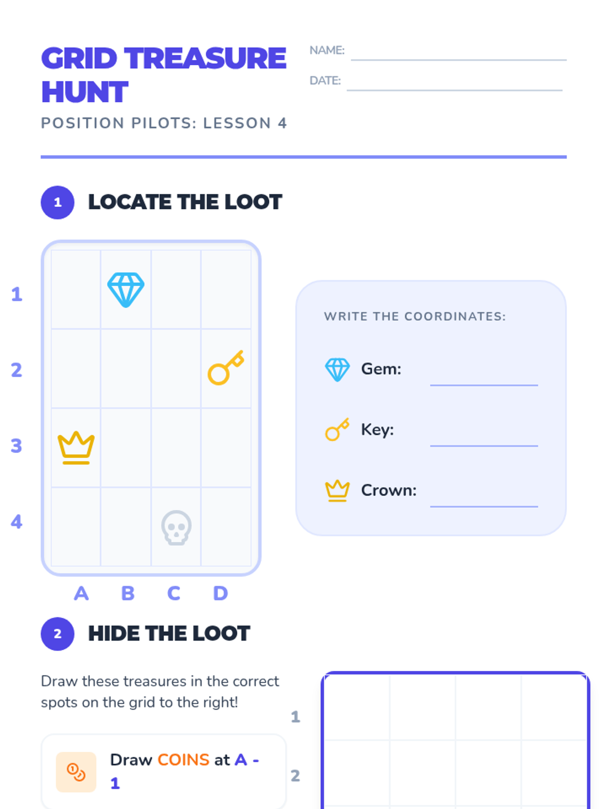 A 1st-grade sequence exploring spatial relationships and coordinate geometry through positional language. Students progress from physical movement to map-making, grid navigation, and basic algorithmic thinking.