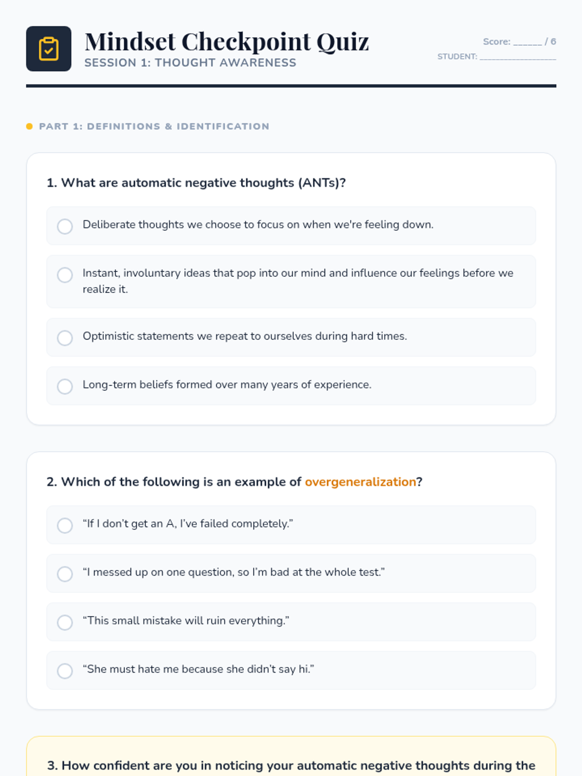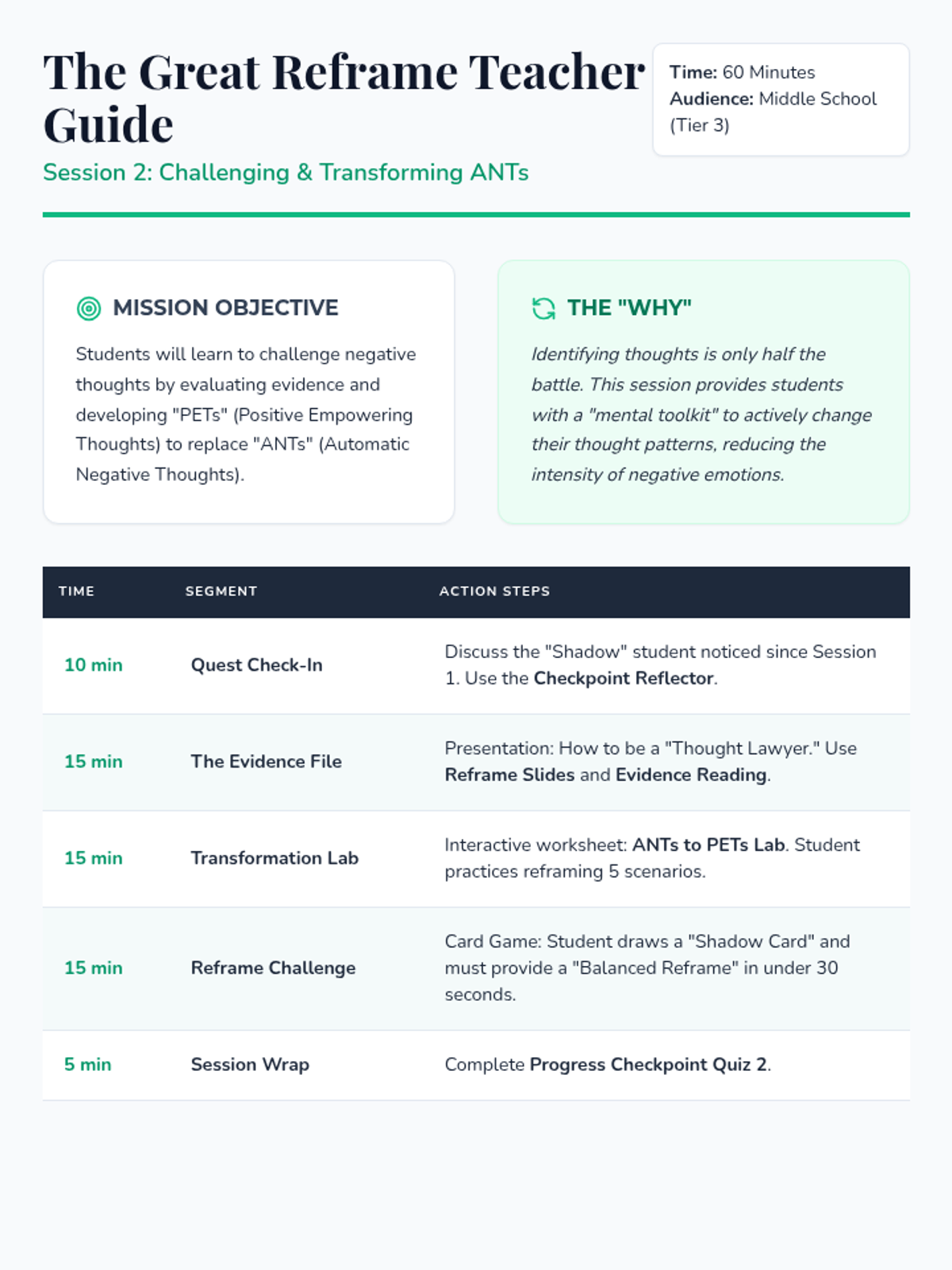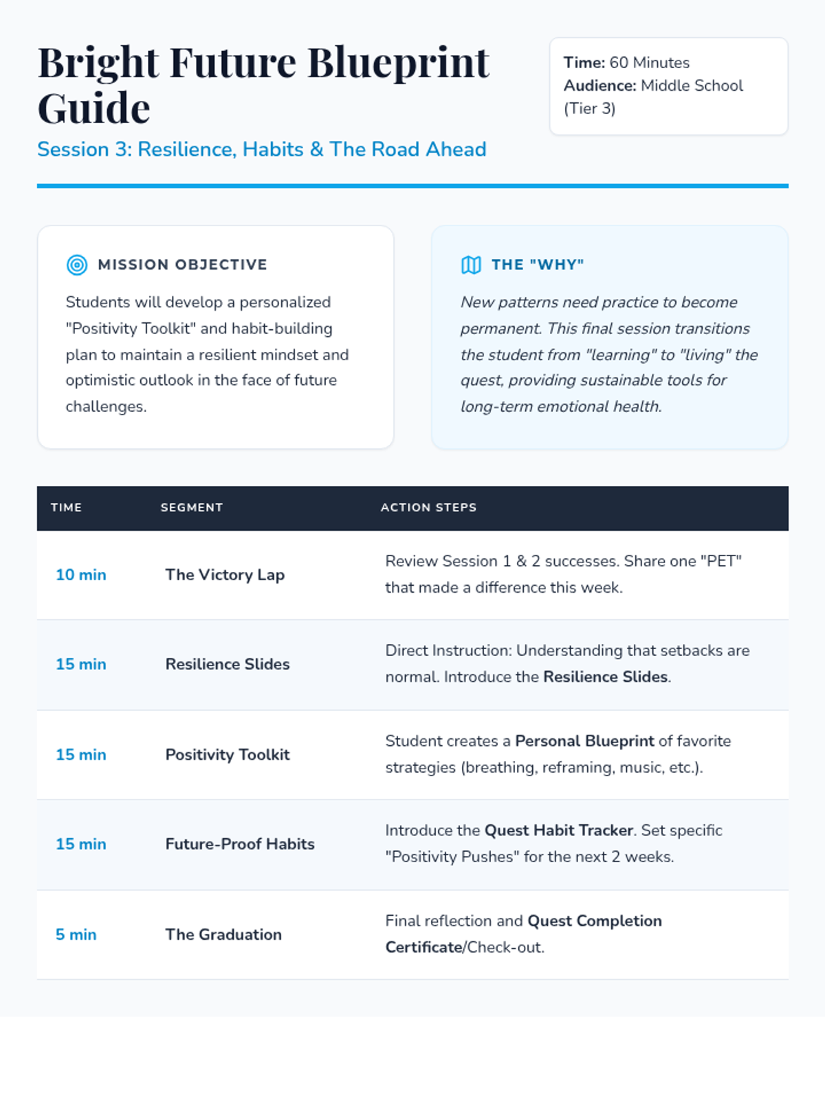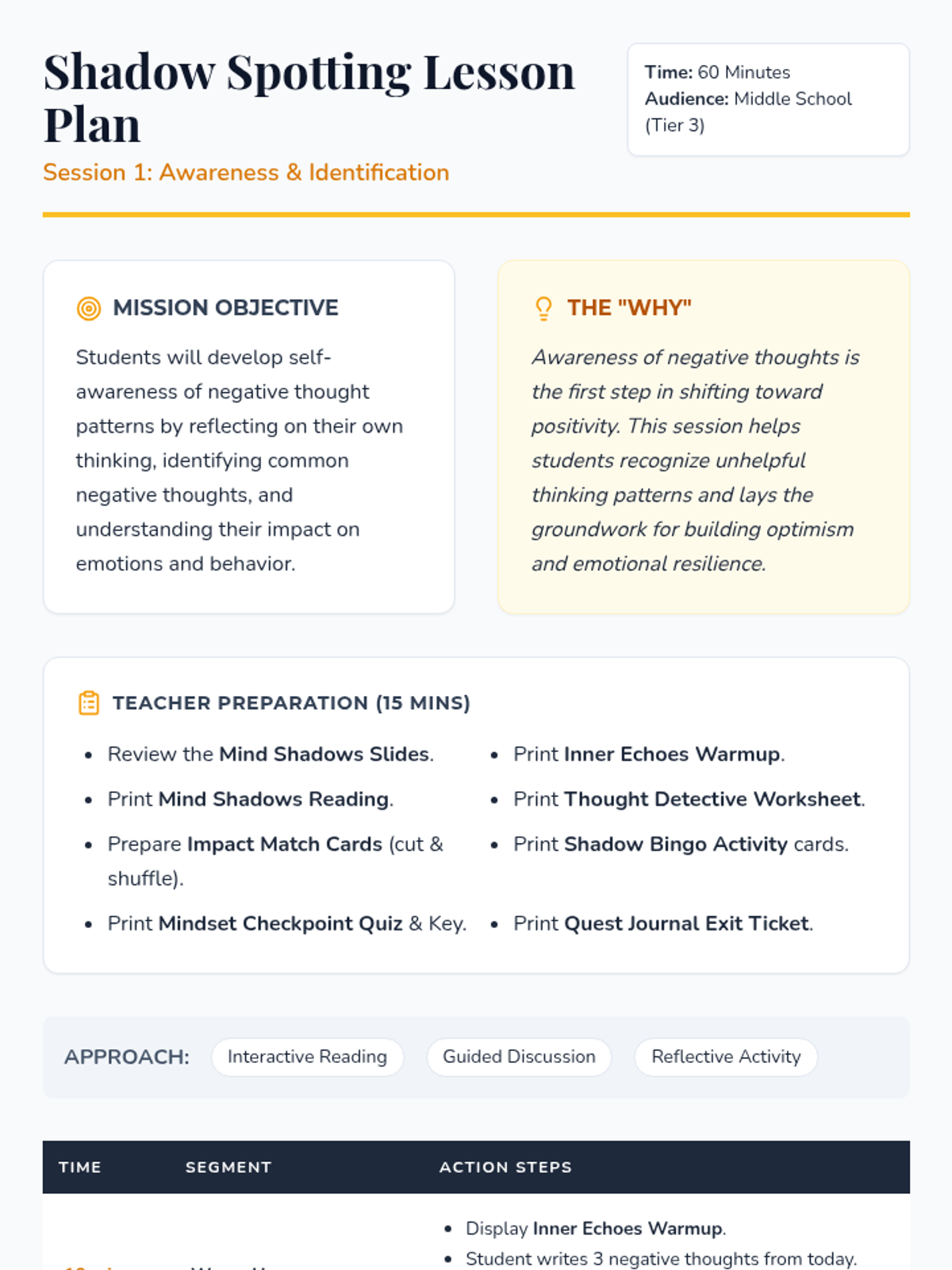 A three-session individualized program for middle school students to transition from negative thought patterns to a positive, resilient mindset through self-awareness and reframing strategies.