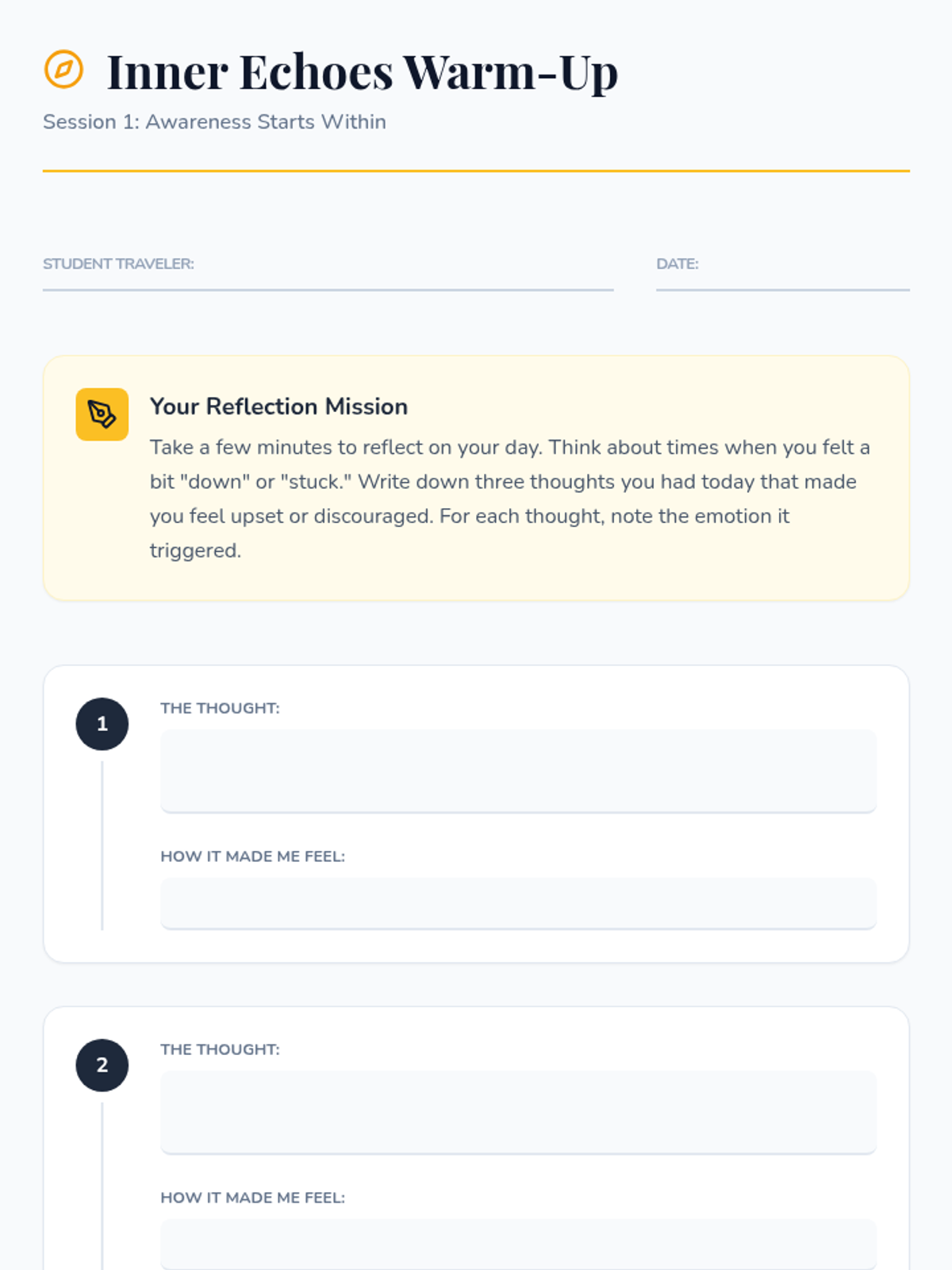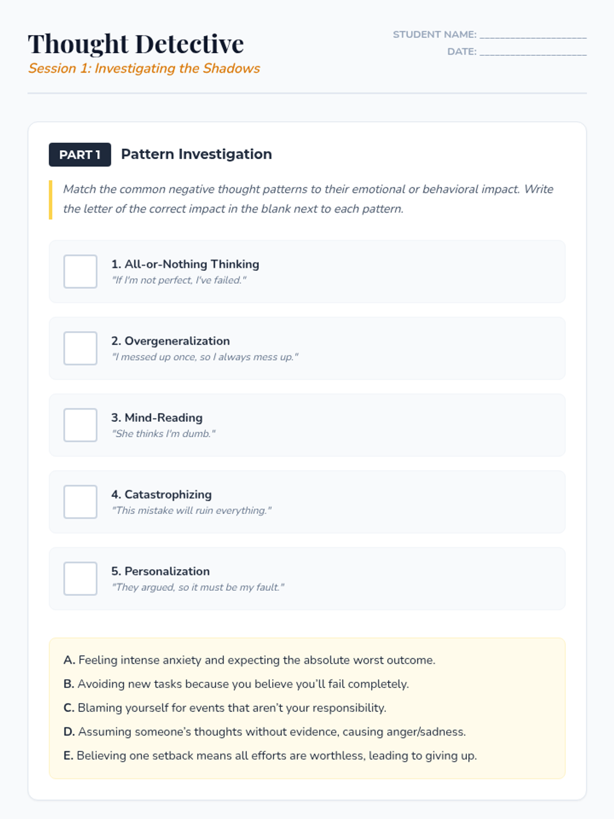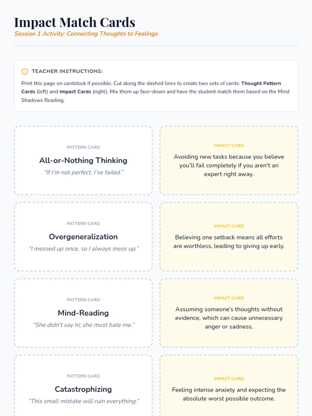 A three-session individualized program for middle school students to transition from negative thought patterns to a positive, resilient mindset through self-awareness and reframing strategies.