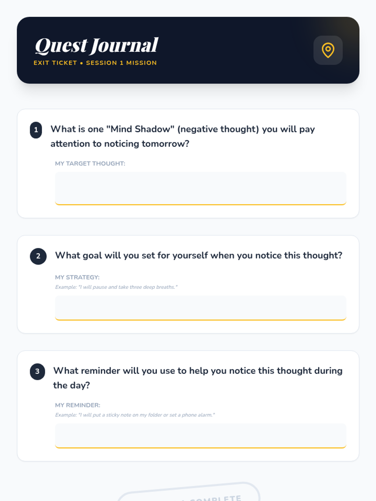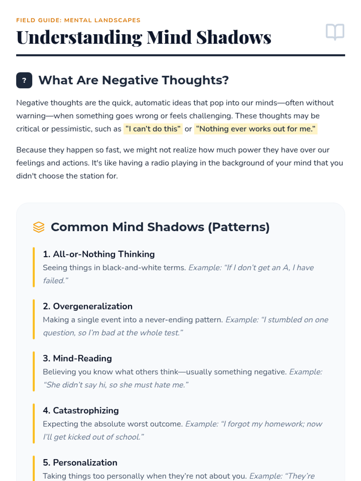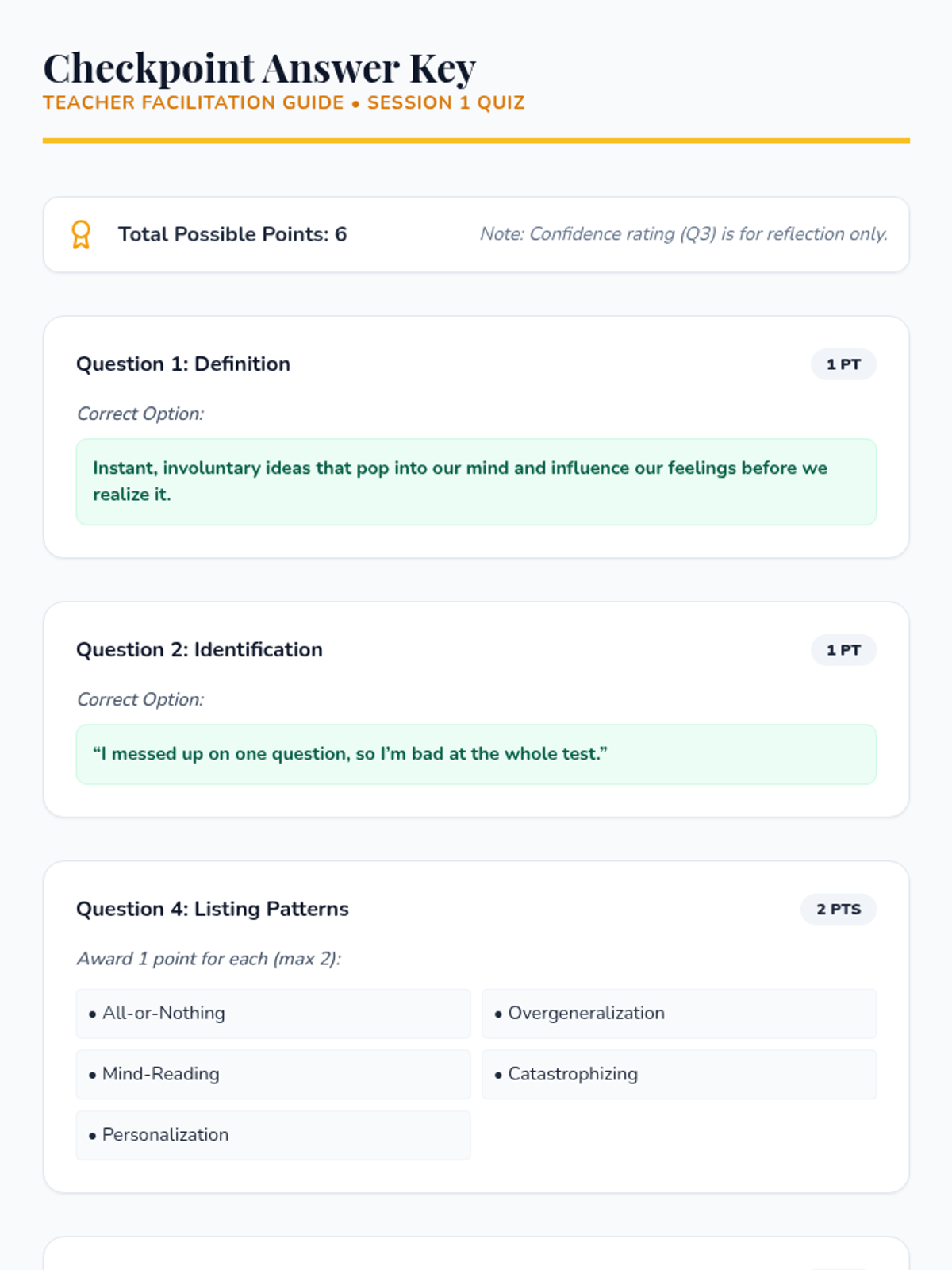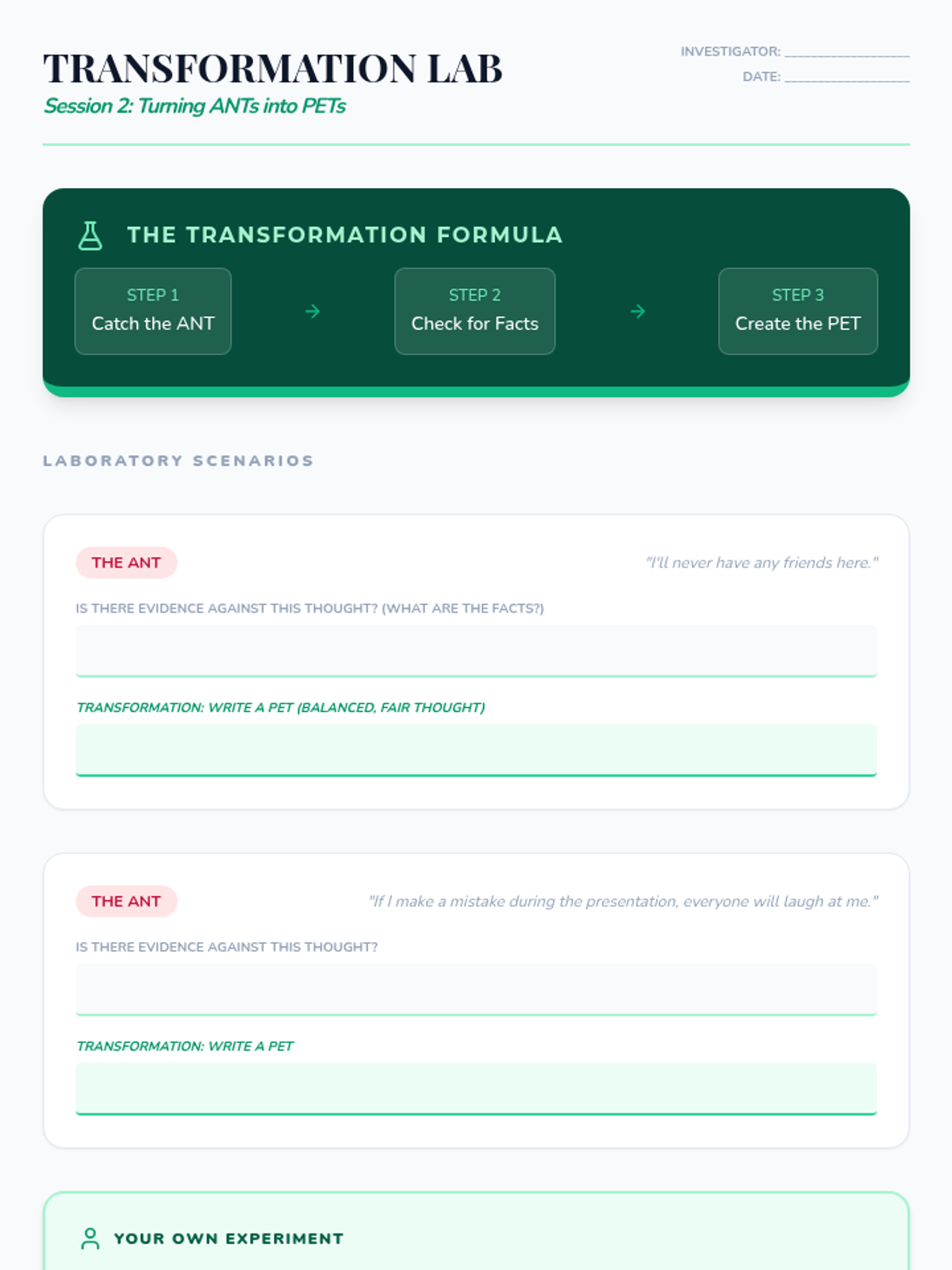 A three-session individualized program for middle school students to transition from negative thought patterns to a positive, resilient mindset through self-awareness and reframing strategies.
