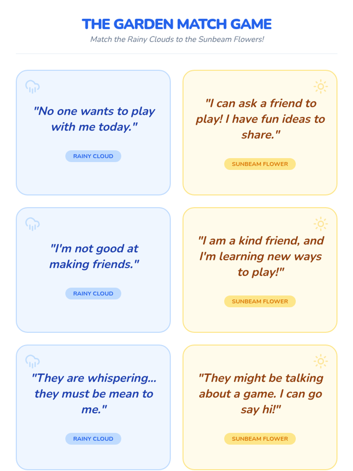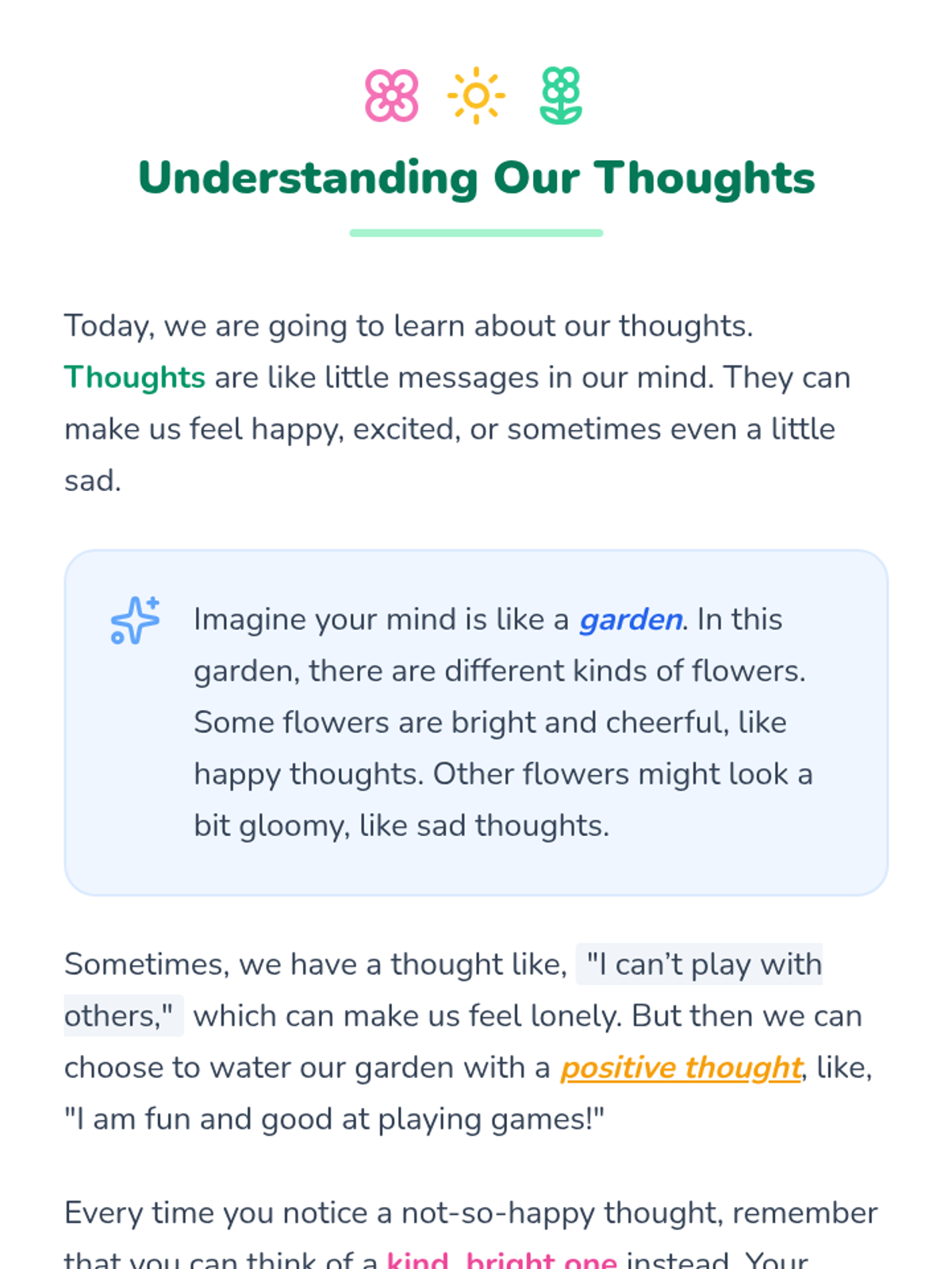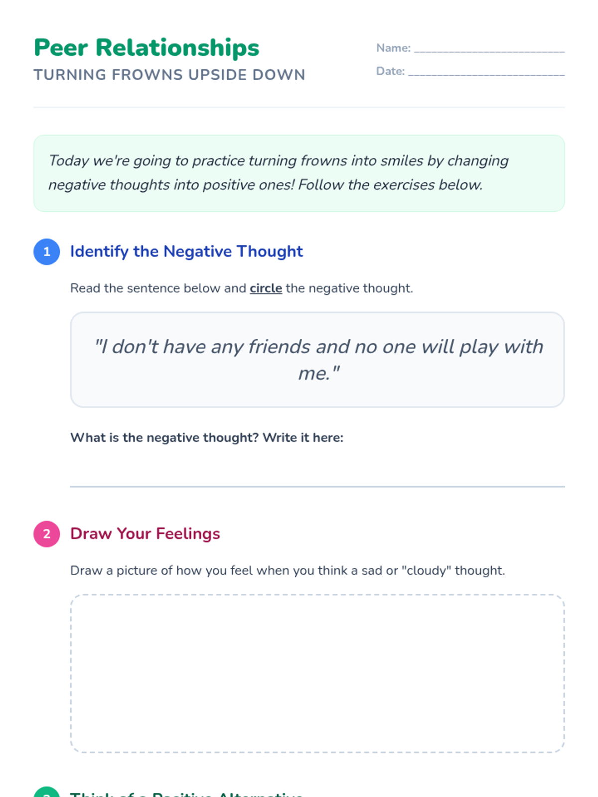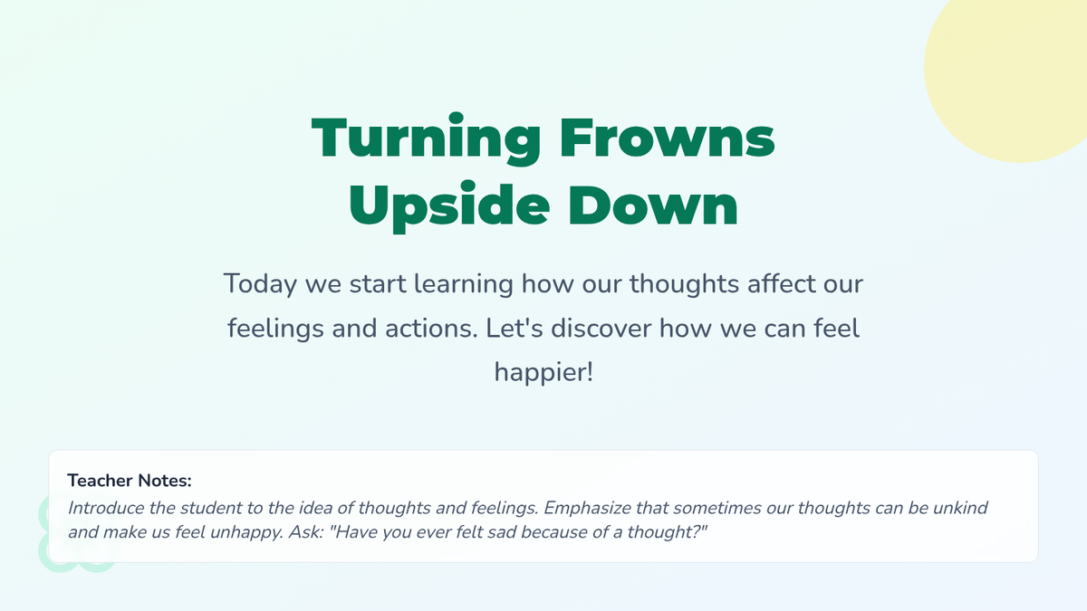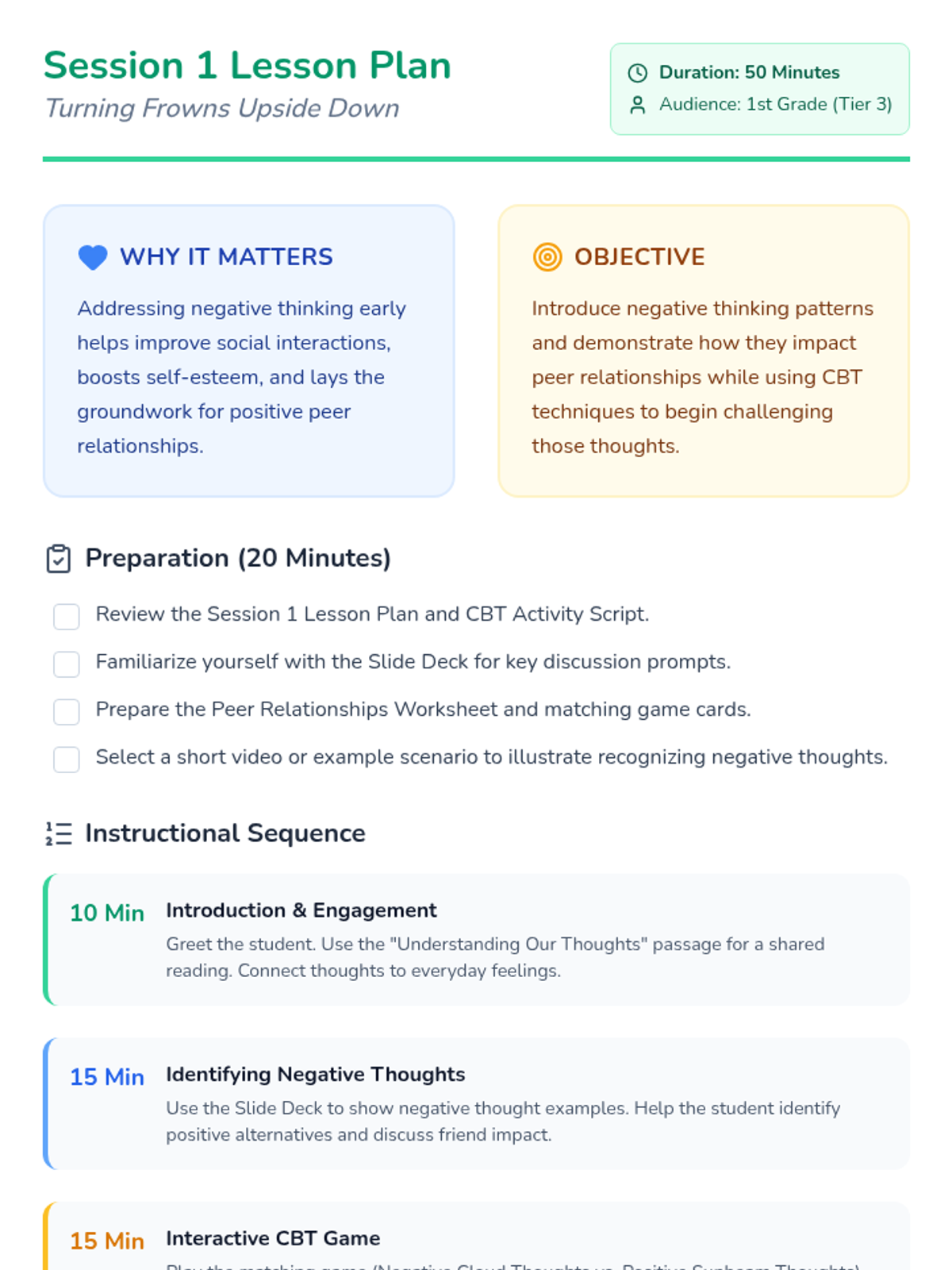 A two-session CBT-based intervention for a 1st-grade student focused on identifying negative thinking patterns and building positive peer relationships through a garden-themed metaphor.