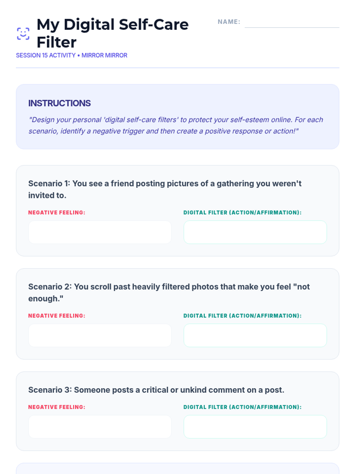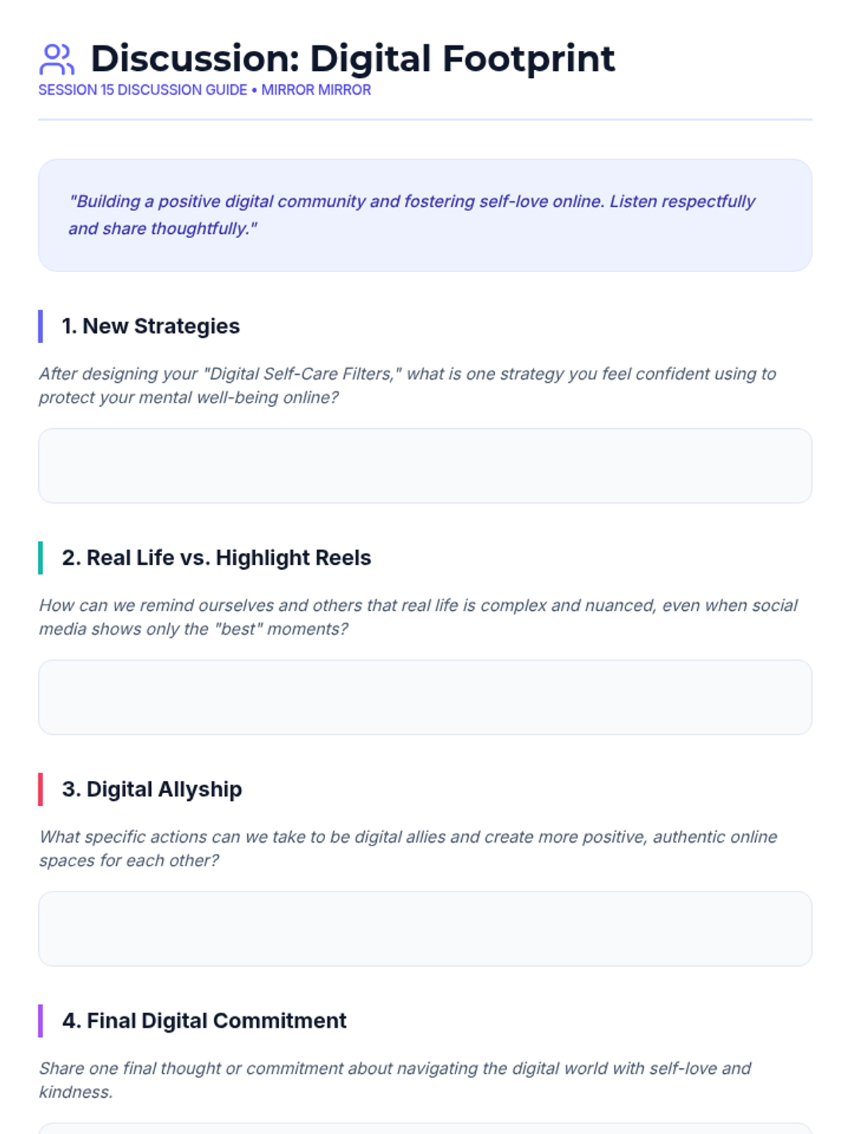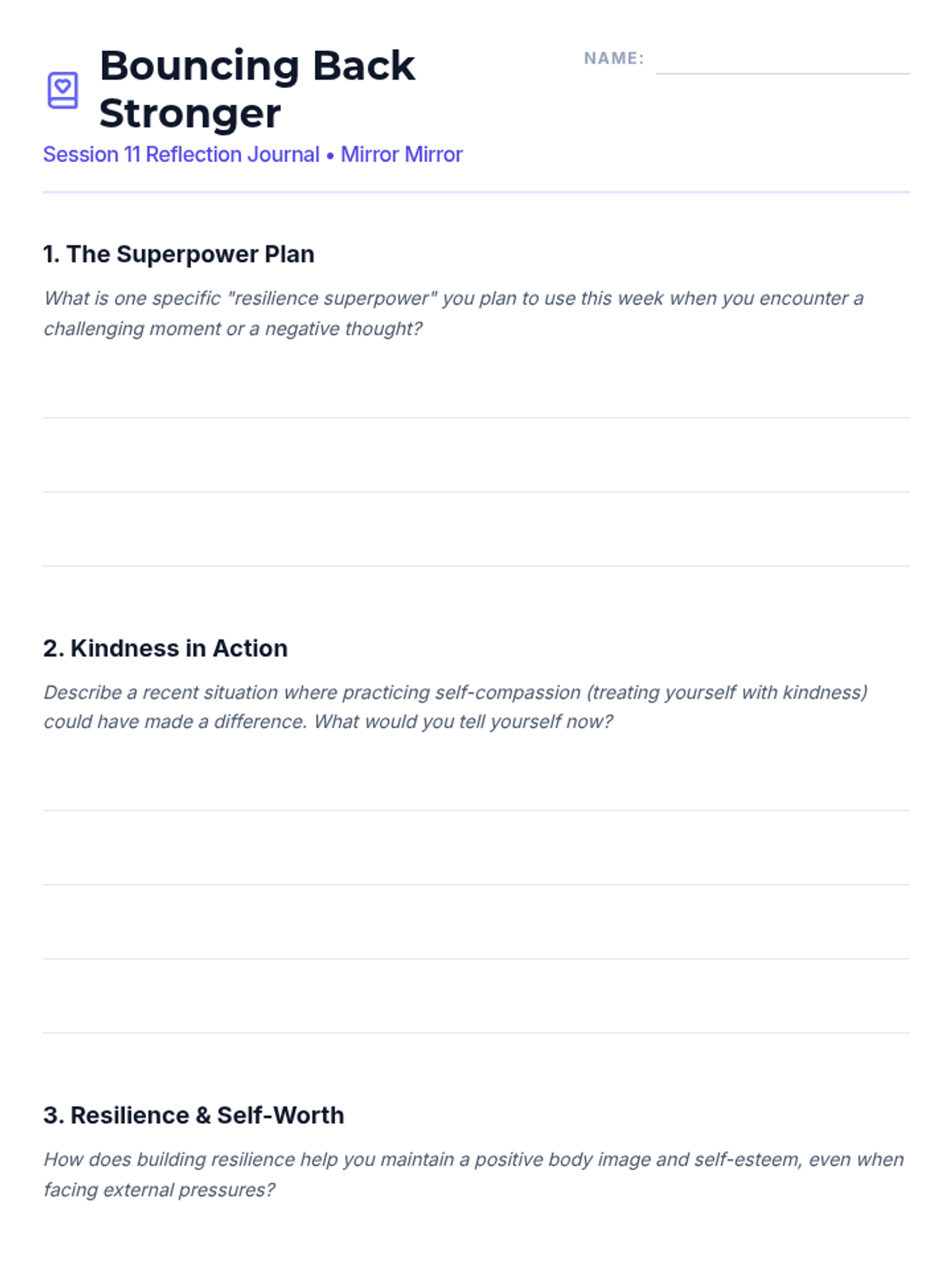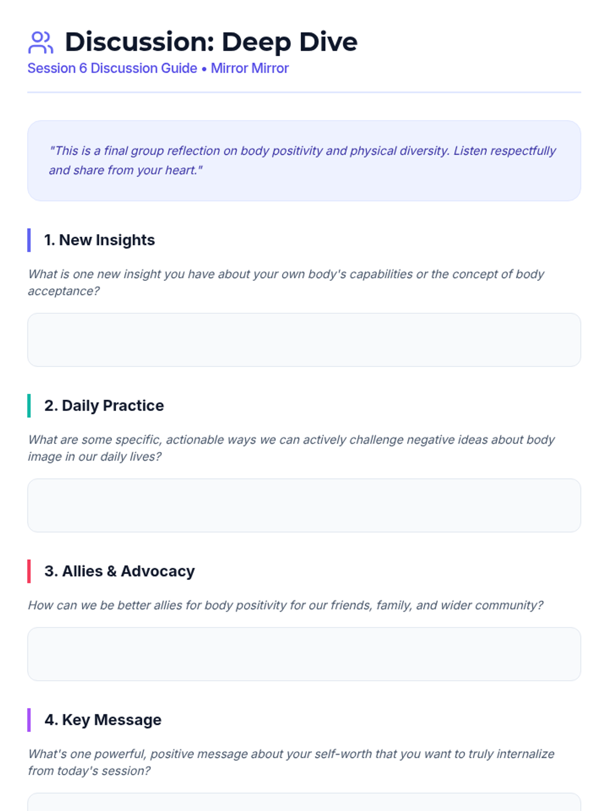 A 15-session empowerment program for 7th-grade girls focused on body image, self-esteem, and positive self-talk. Through creative activities and group discussions, students build resilience and a strong sense of inner worth.