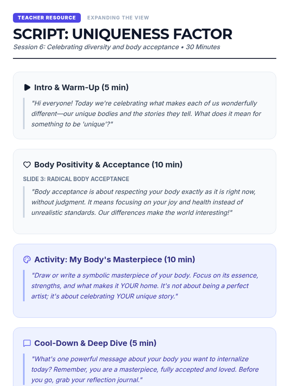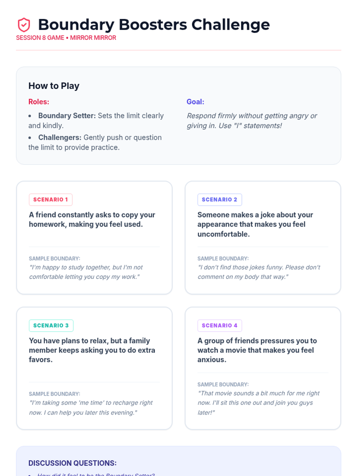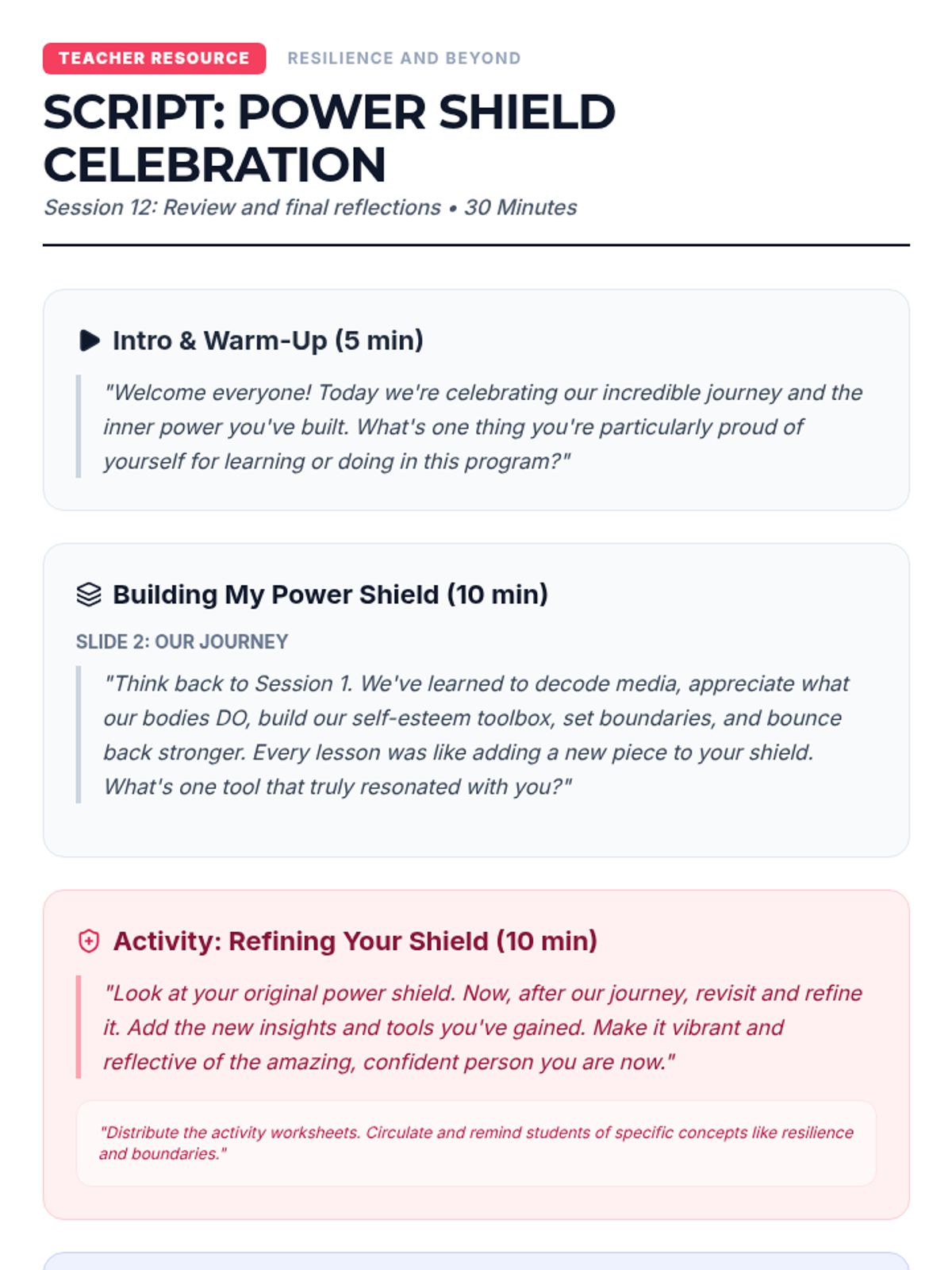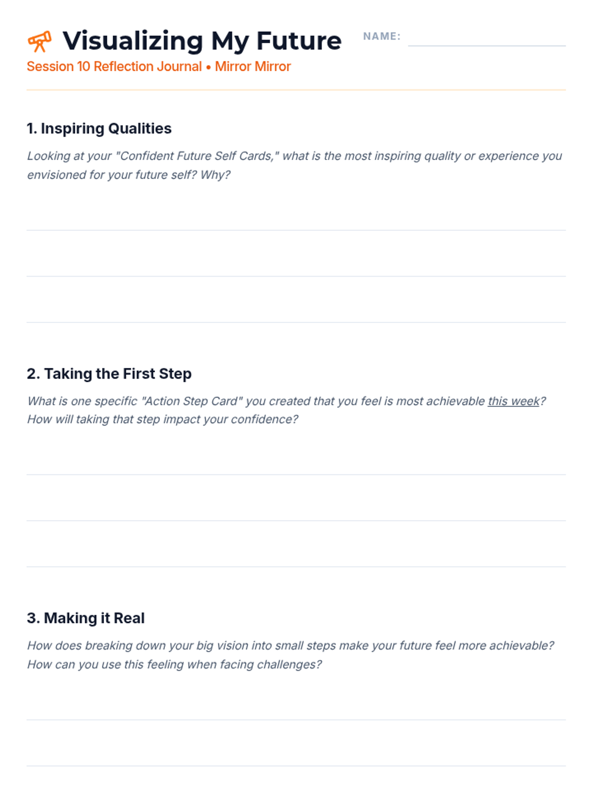 A 15-session empowerment program for 7th-grade girls focused on body image, self-esteem, and positive self-talk. Through creative activities and group discussions, students build resilience and a strong sense of inner worth.