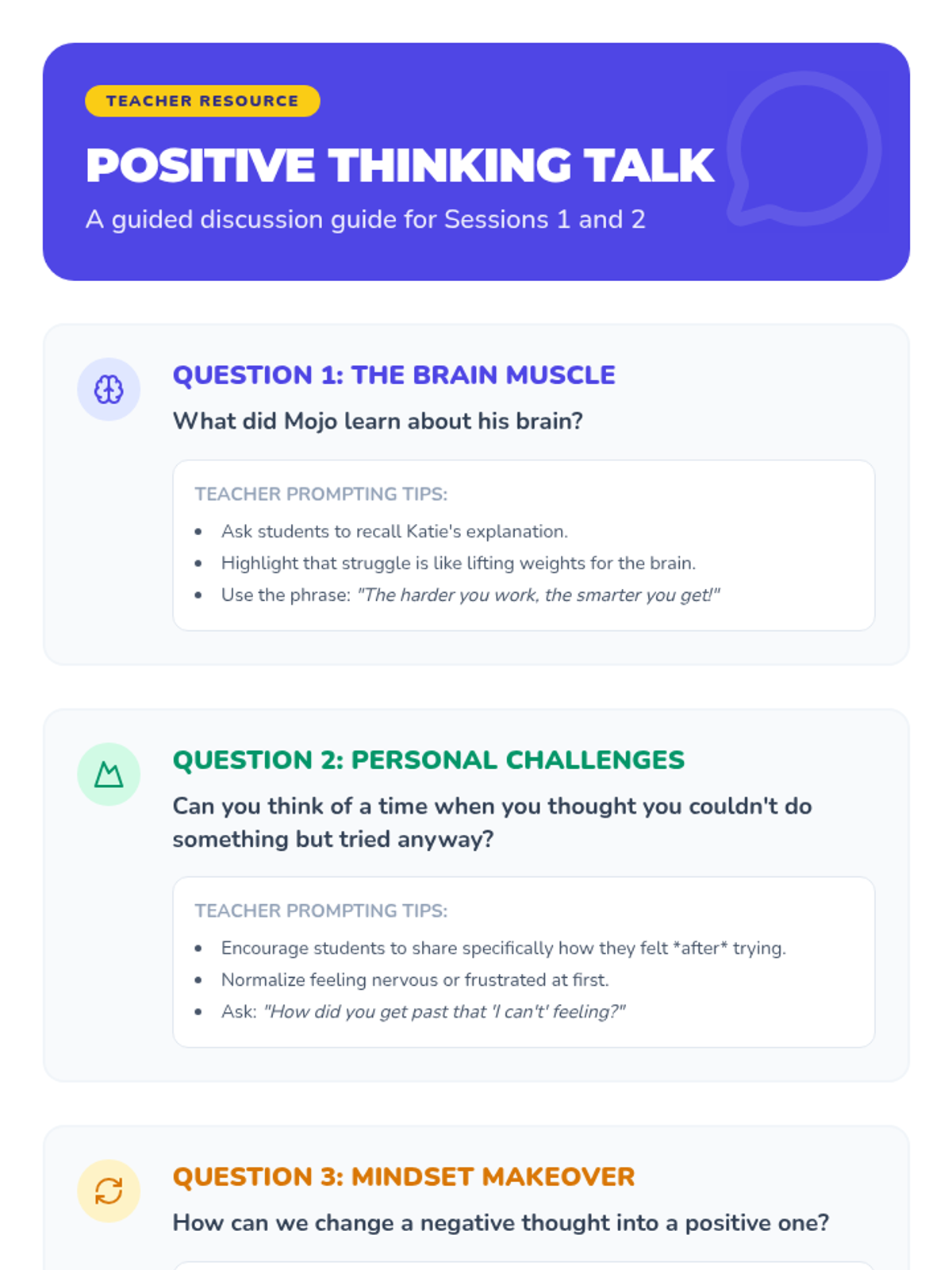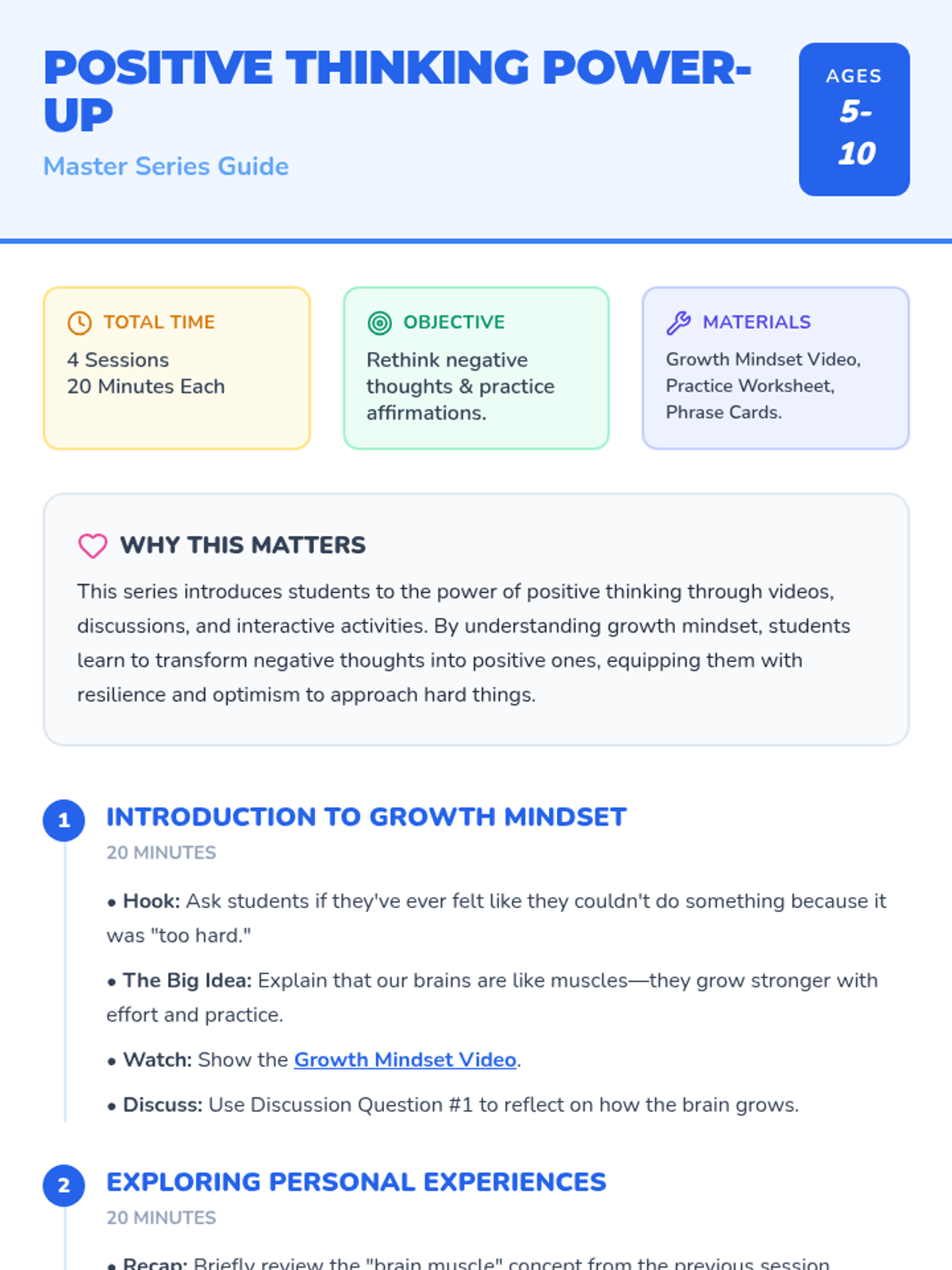 A four-part series designed for elementary students to develop a growth mindset. Through engaging videos, personal storytelling, and interactive games, students learn to transform negative self-talk into positive affirmations and resilient thinking.
