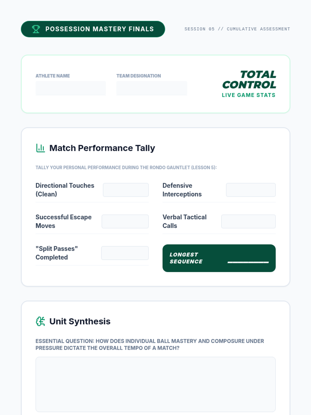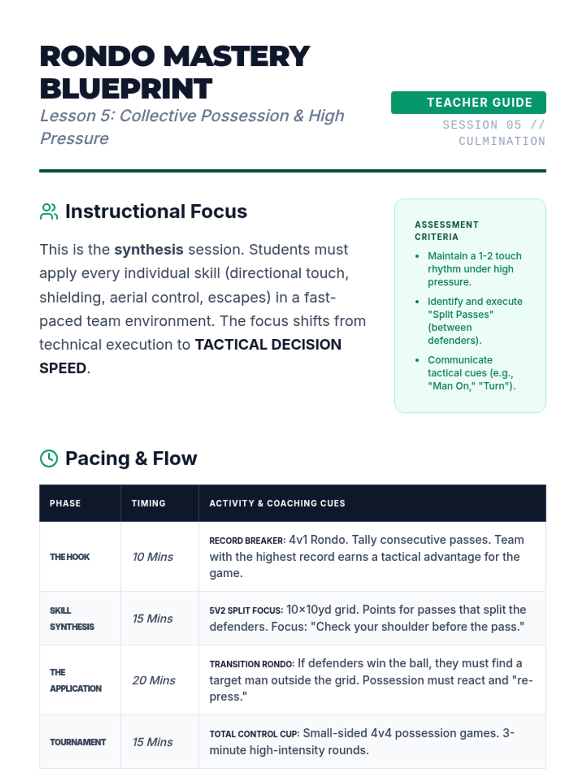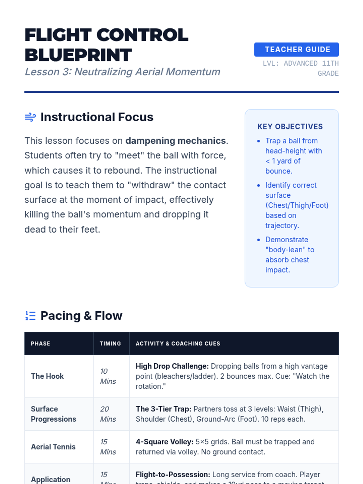 An advanced physical education sequence for 11th-grade students focusing on technical ball mastery, possession tactics, and the biomechanics of football. Students move from individual touch mastery to high-pressure collective possession games.