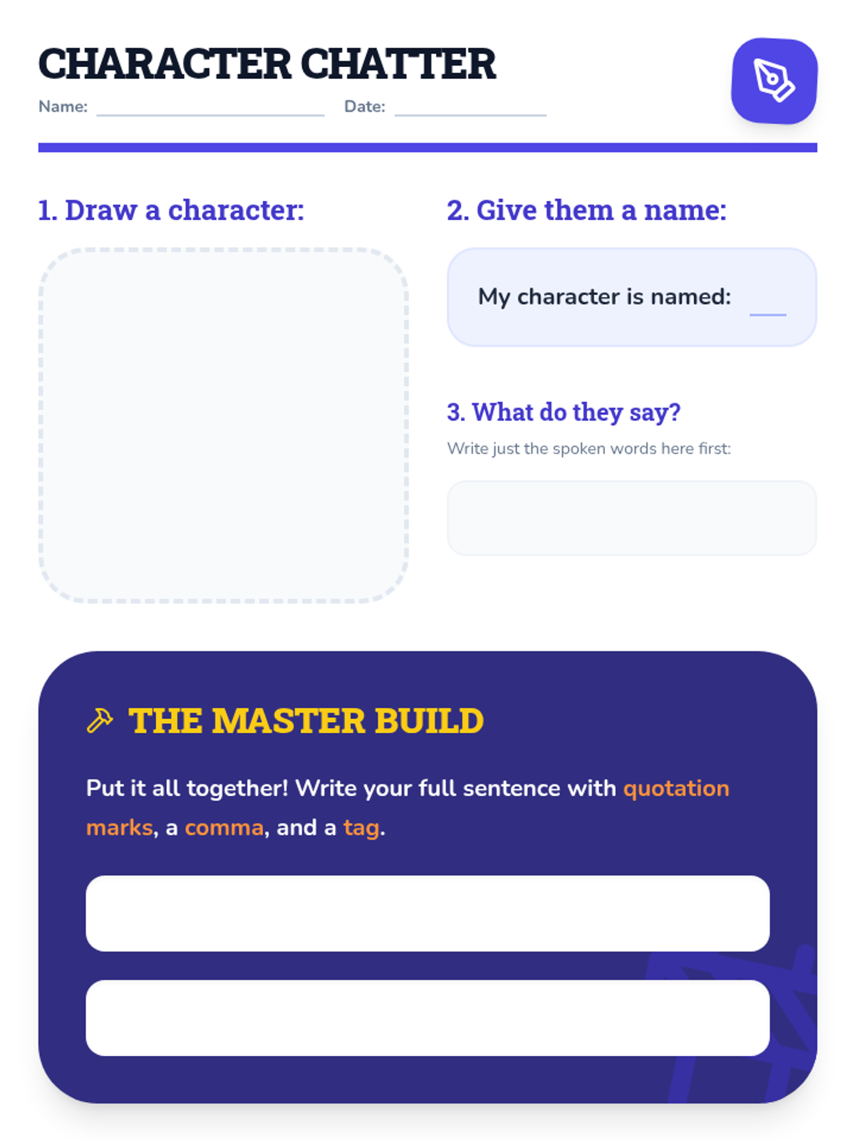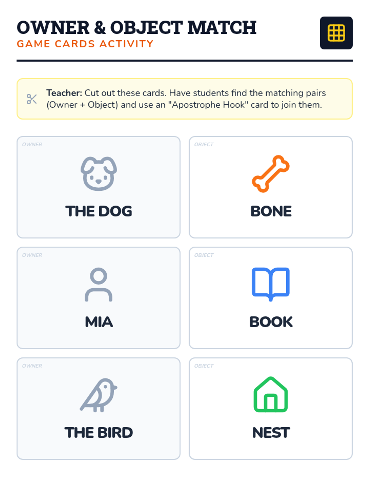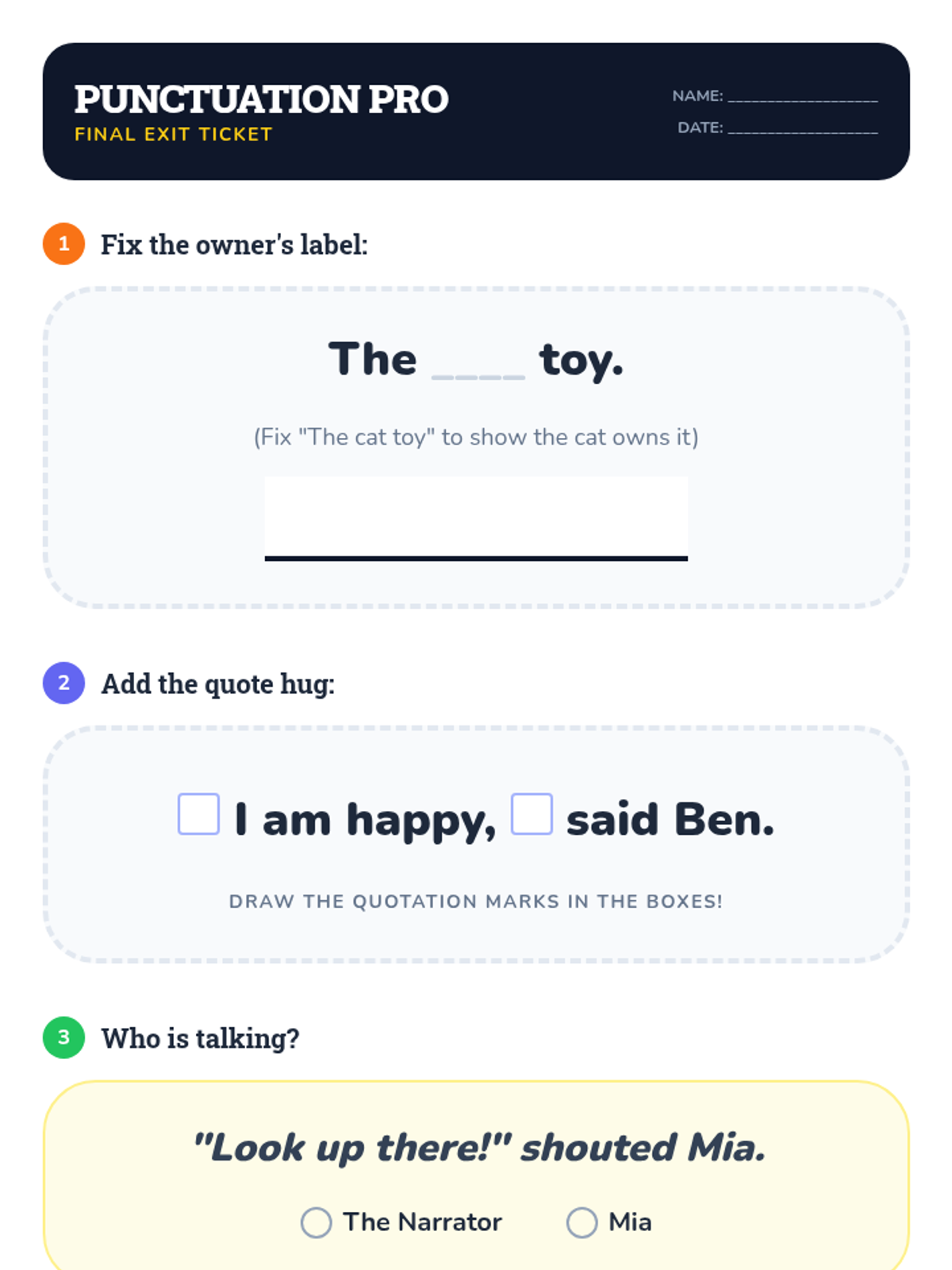 A comprehensive 1st Grade sequence introducing possessive apostrophes and quotation marks through concrete visuals and hands-on construction themes. Students learn to show 'who owns it' and 'who said it' using 'Punctuation Builder' motifs.