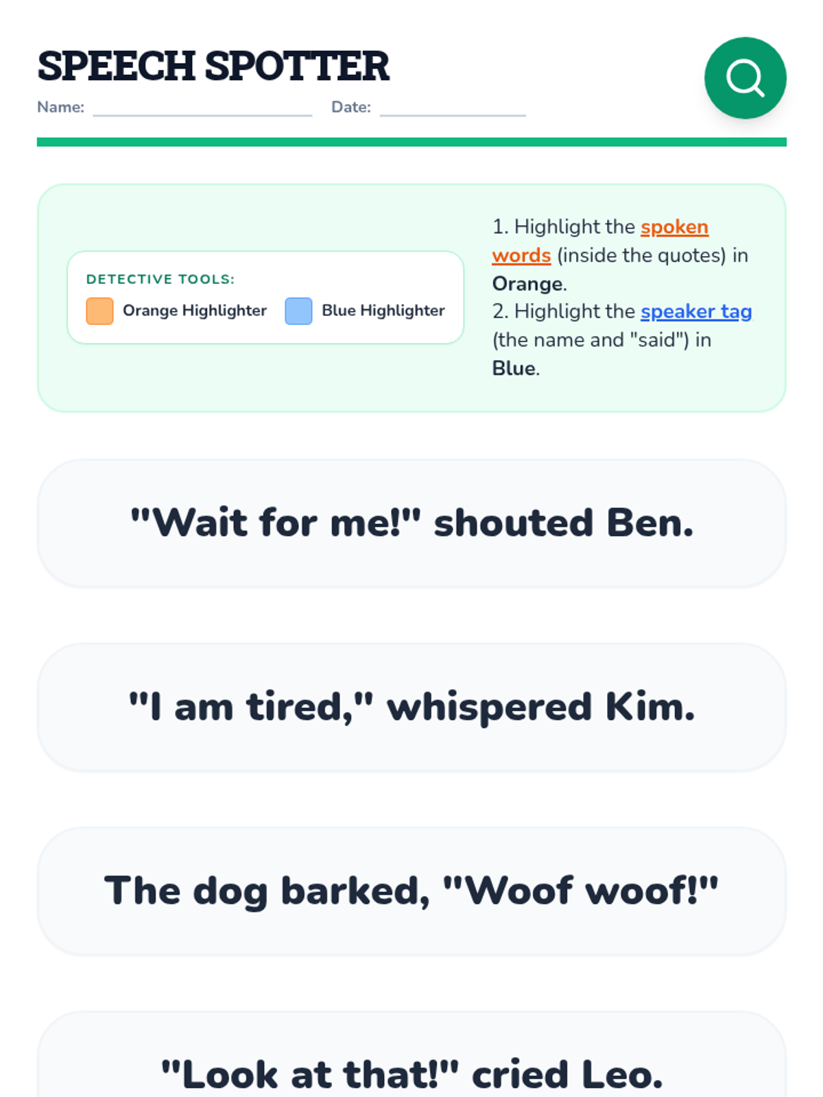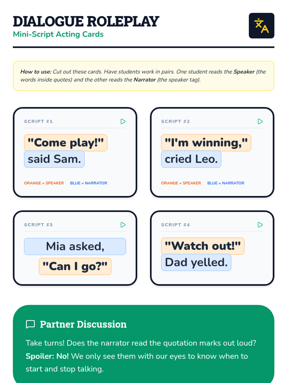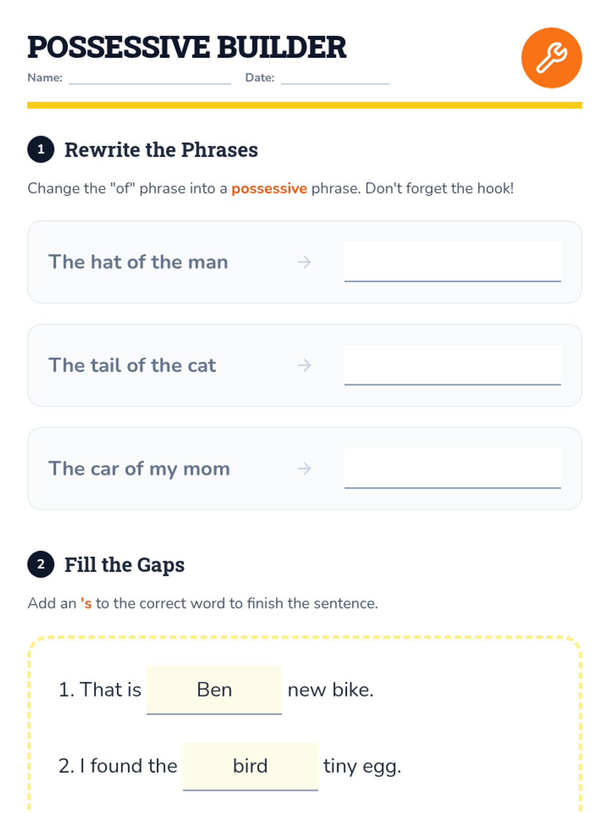 A comprehensive 1st Grade sequence introducing possessive apostrophes and quotation marks through concrete visuals and hands-on construction themes. Students learn to show 'who owns it' and 'who said it' using 'Punctuation Builder' motifs.