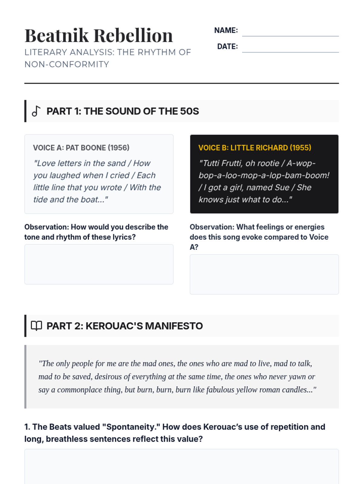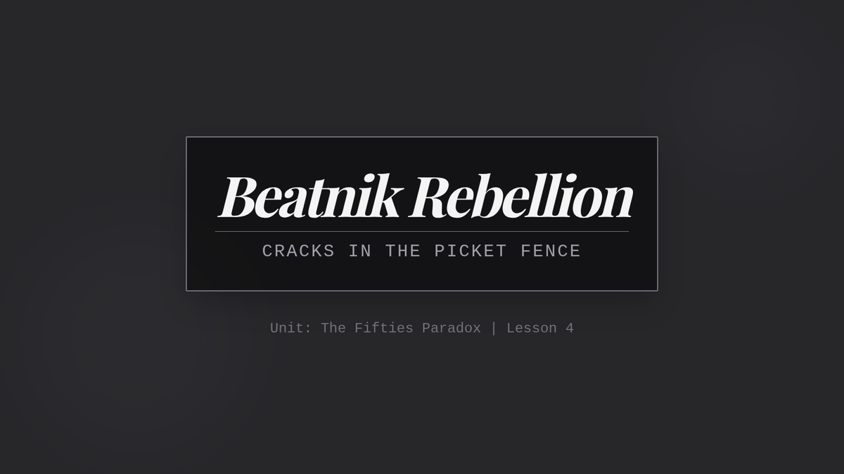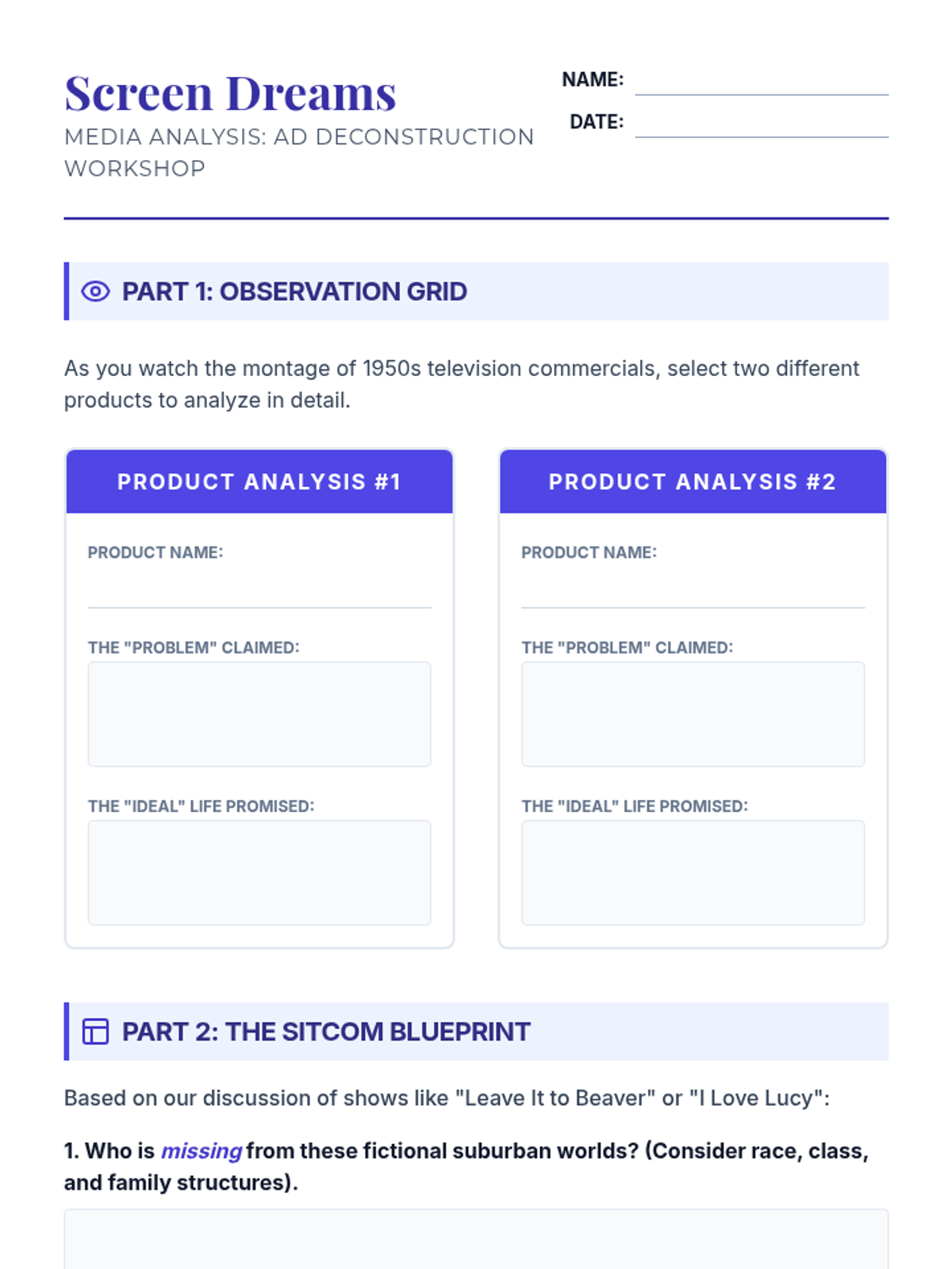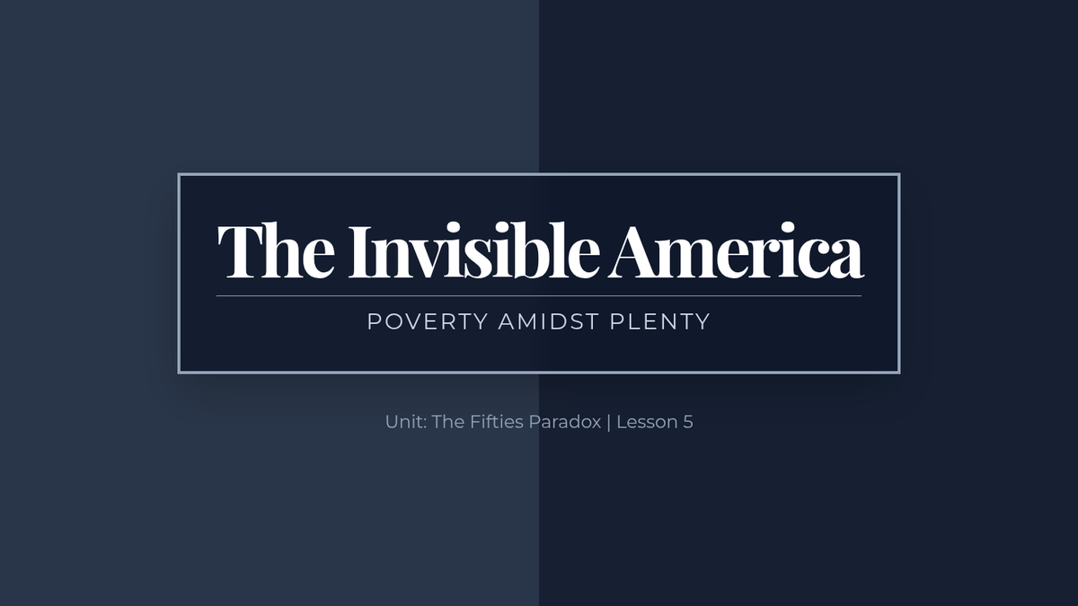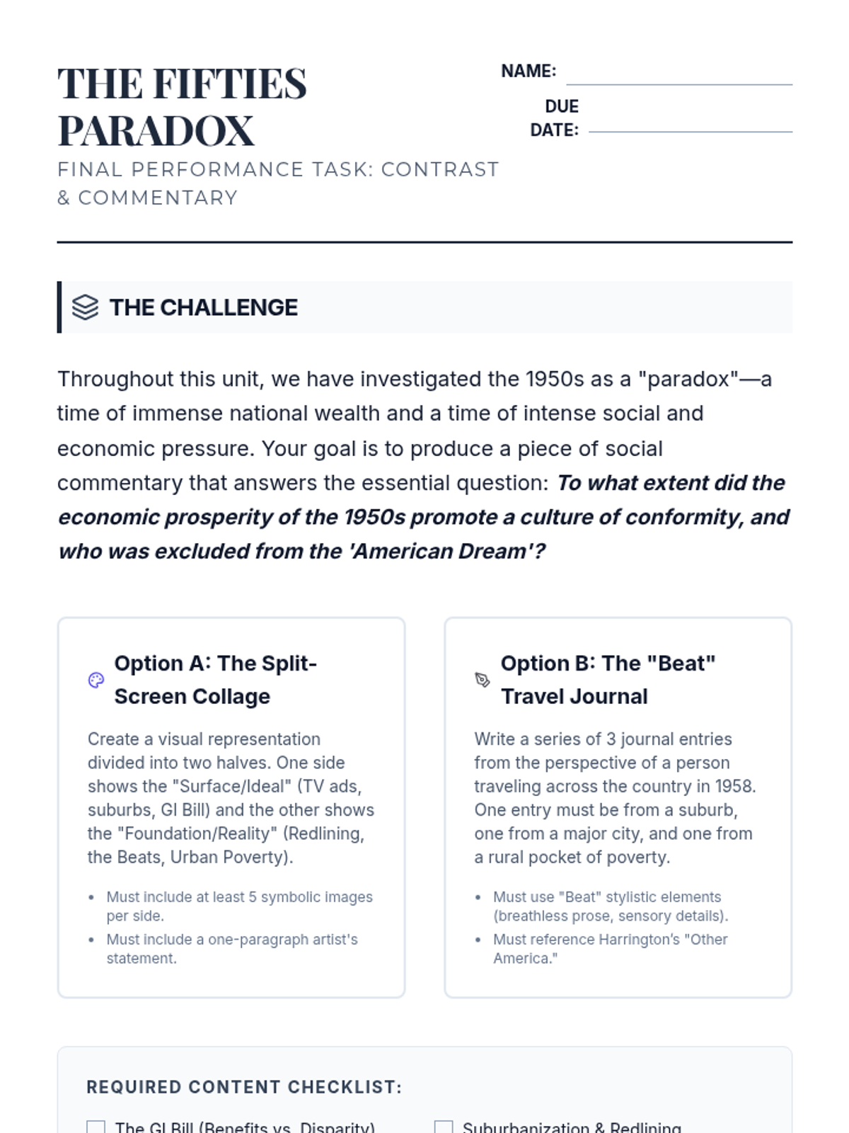 A 9th-grade US History sequence exploring the 1950s post-war boom, suburbanization, and the tension between social conformity and rebellion. Students analyze the 'American Dream' through economic data, media, and counter-culture narratives to understand who was included and who was left behind.