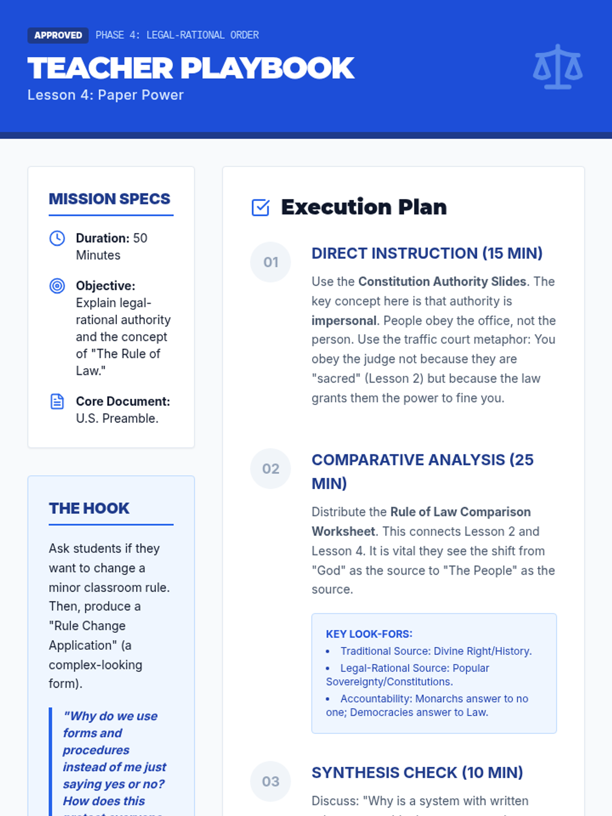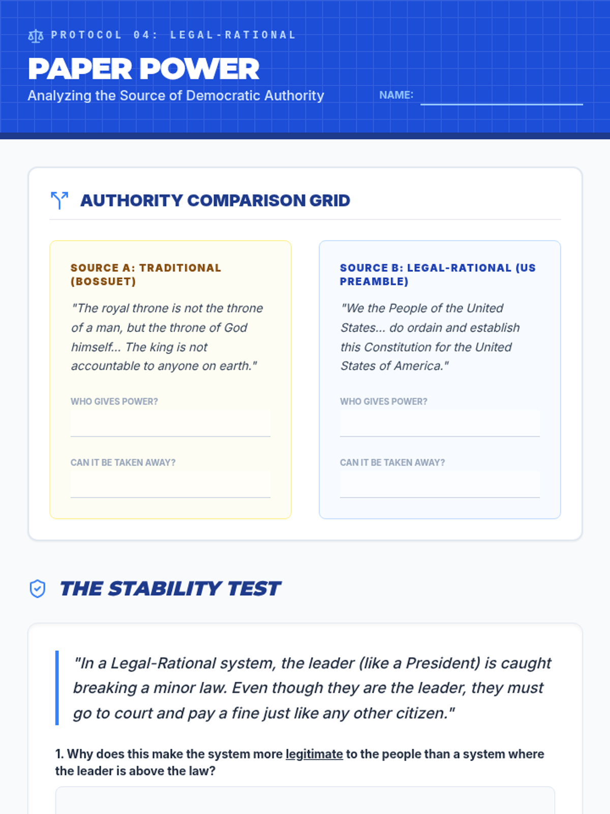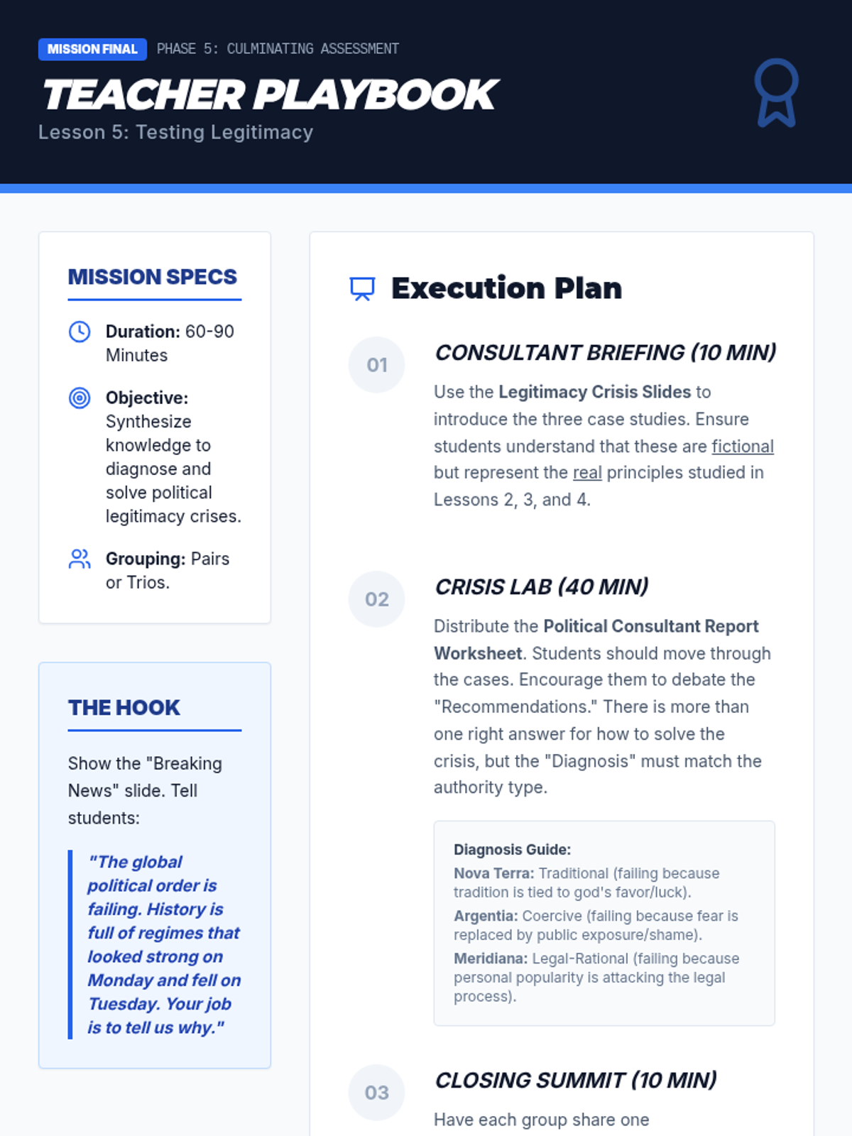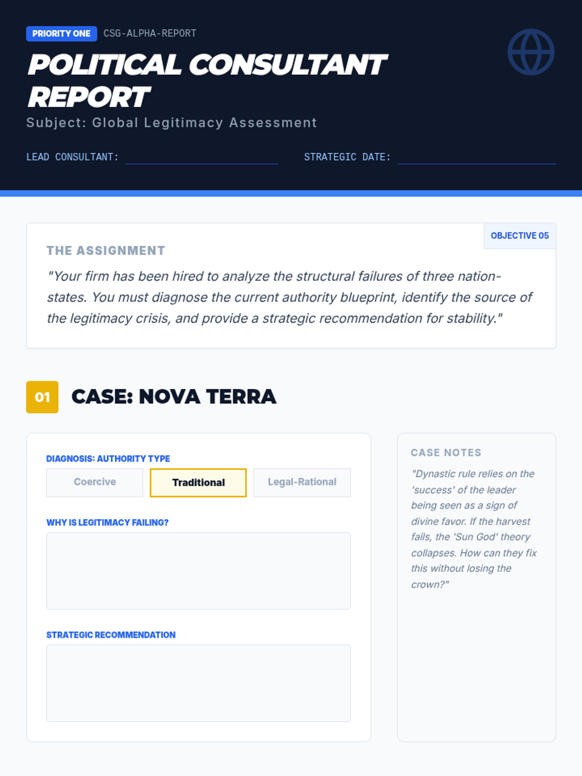 A comprehensive civics unit for 8th grade students exploring the concepts of power, authority, and political legitimacy. Students compare different forms of governance—from traditional monarchies and coercive dictatorships to legal-rational democracies—to understand how governments justify their right to rule.