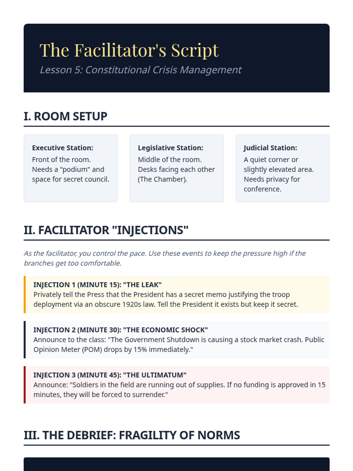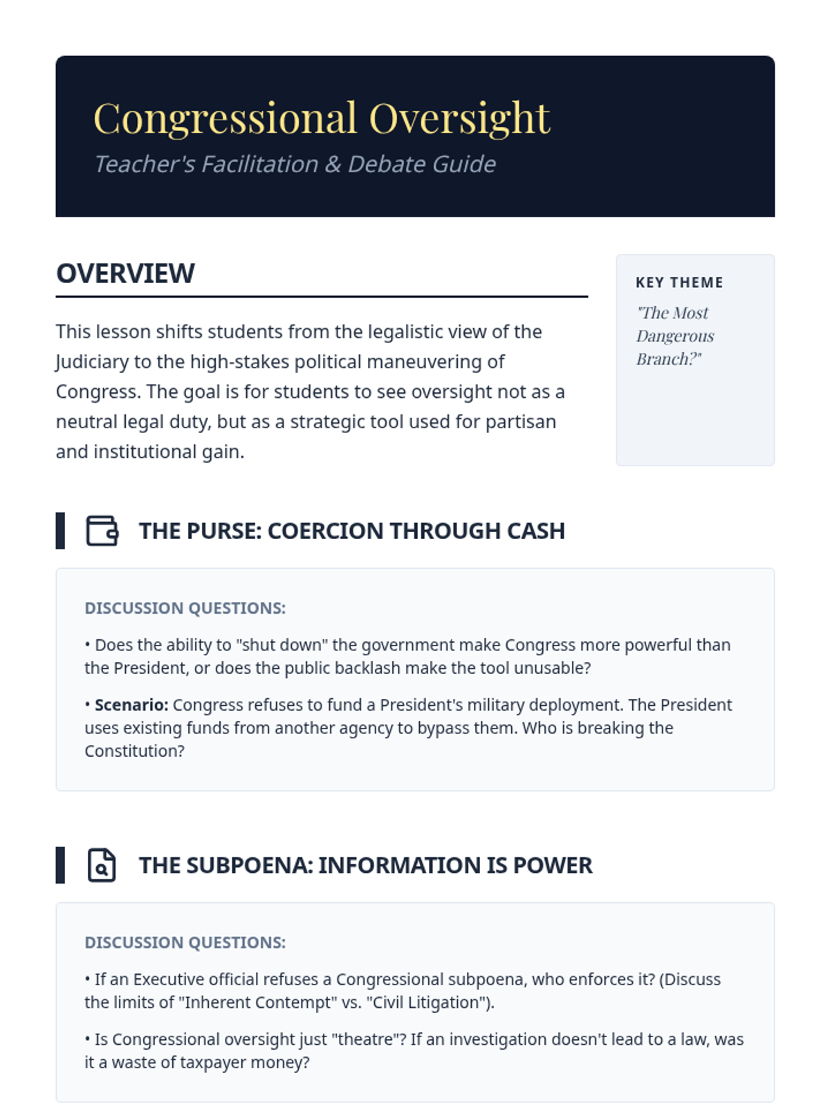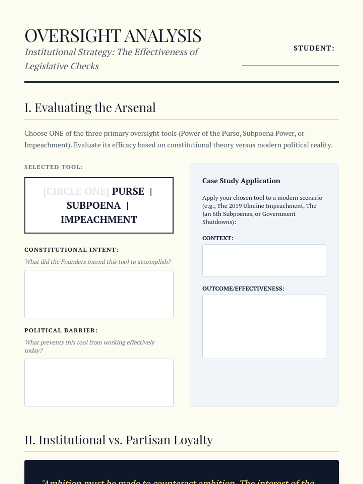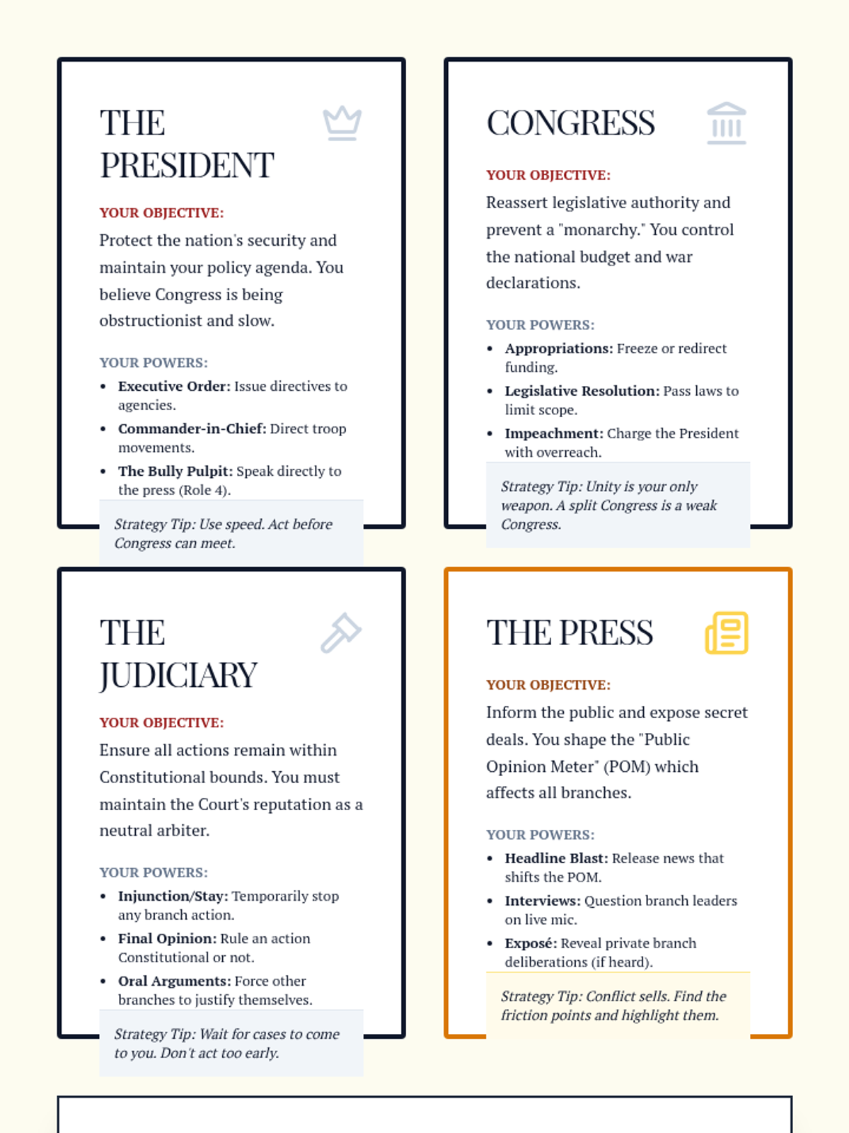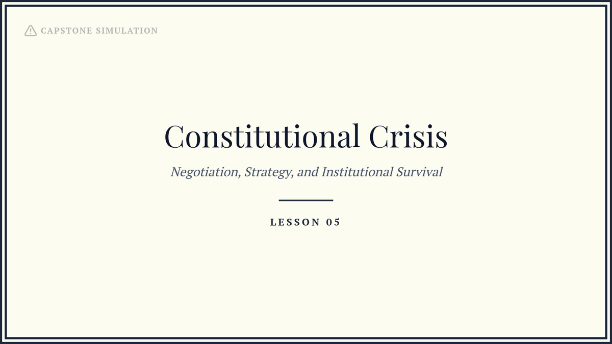 An undergraduate-level exploration of the U.S. government's structural design, focusing on the separation of powers and checks and balances through historical case studies and simulations. Students analyze the transition from the Articles of Confederation to the Constitution and examine the evolving powers of the three branches.