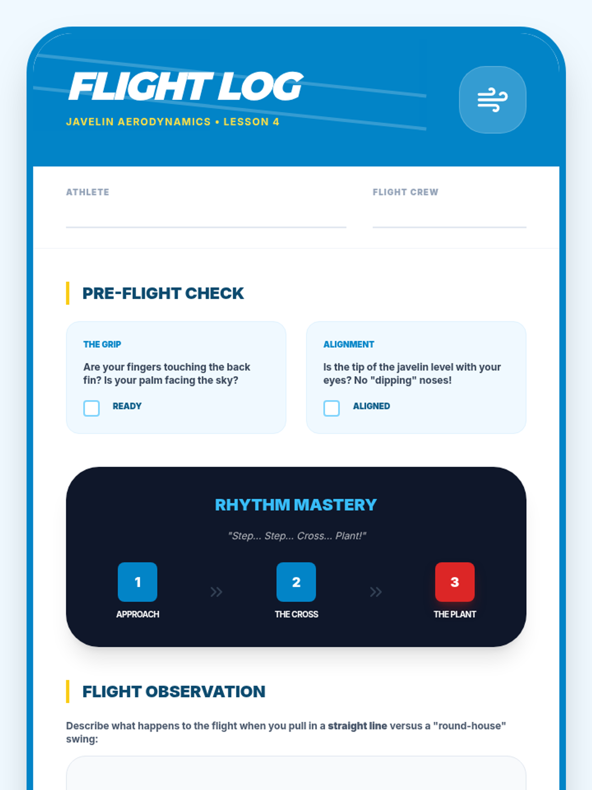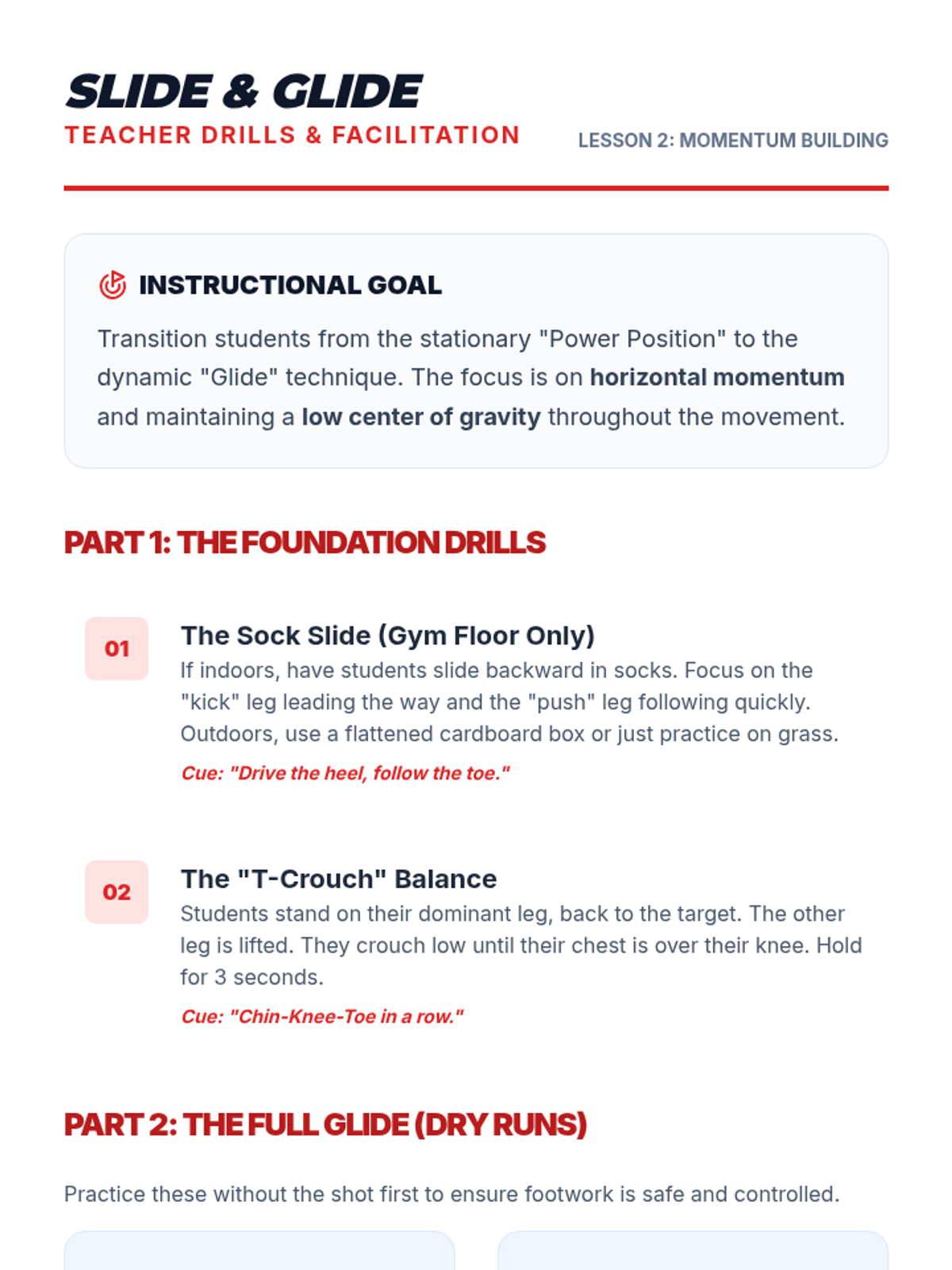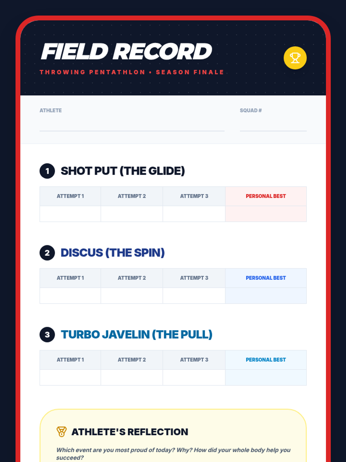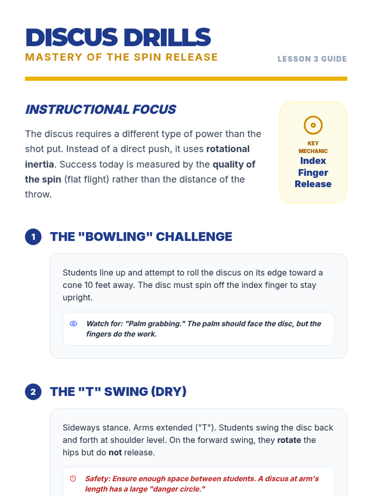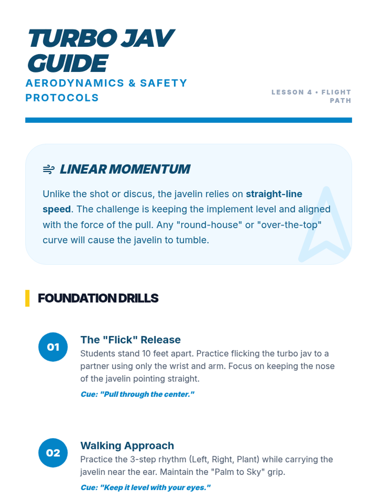 This sequence introduces 5th-grade students to the mechanics of shot put, discus, and javelin throwing. Students explore the physics of power generation through leg drive, rotation, and momentum while prioritizing safety in the throwing sector.