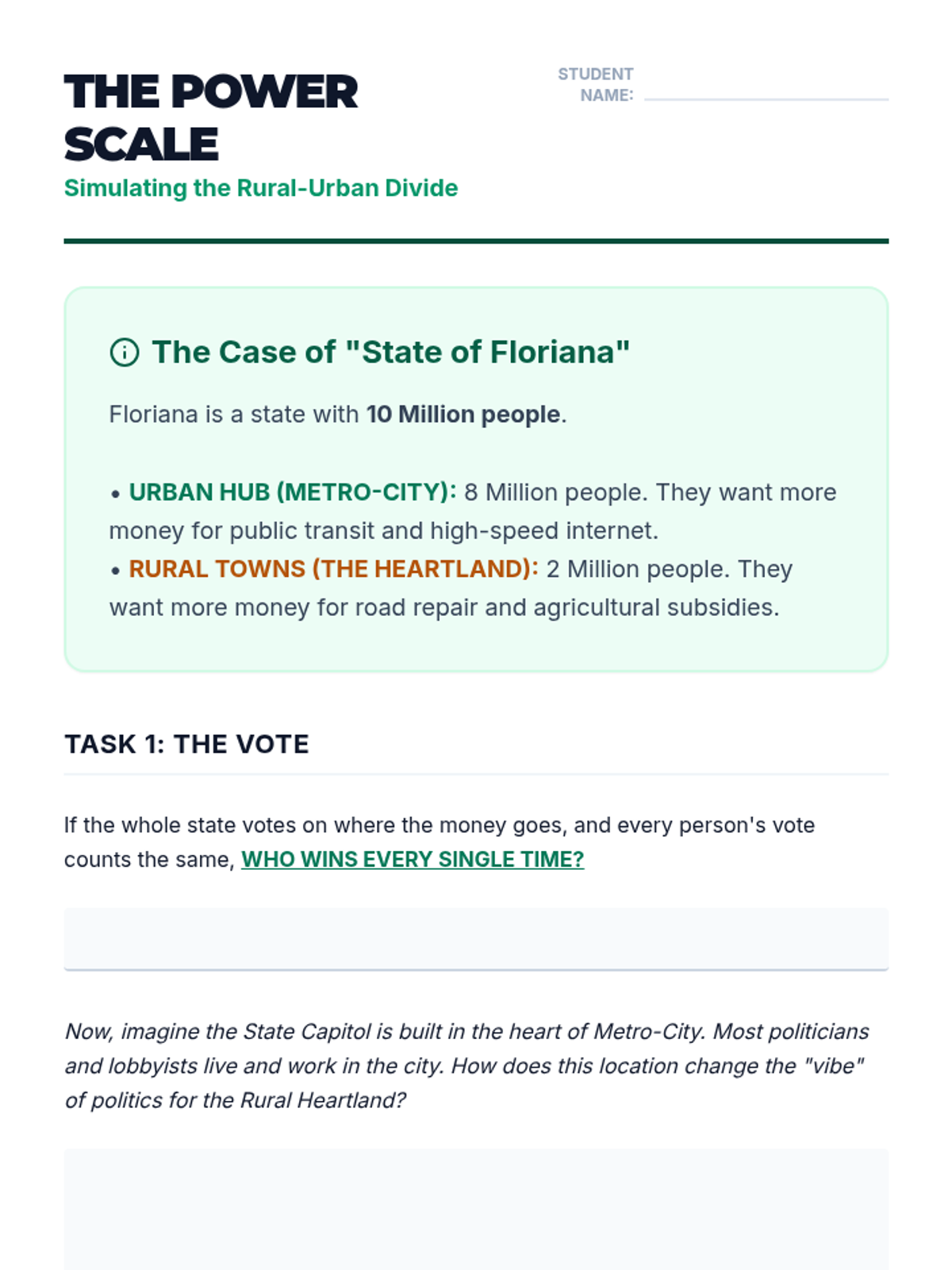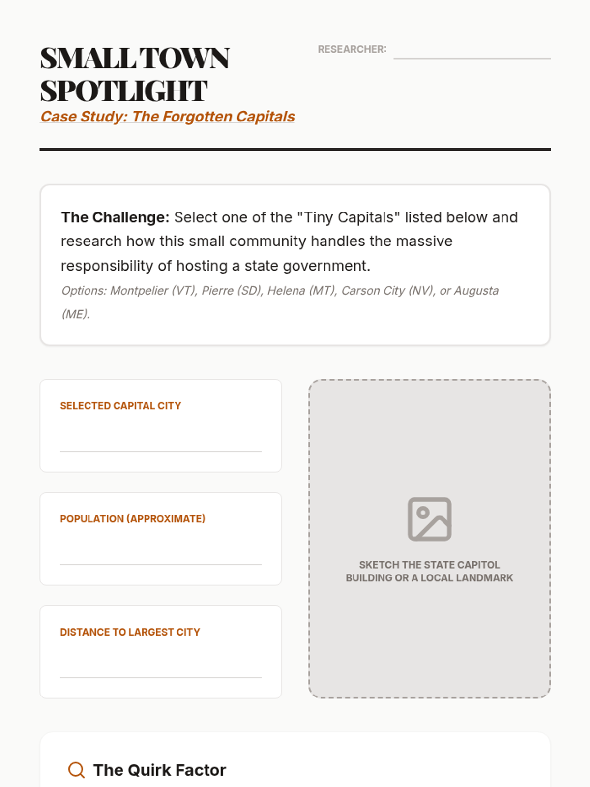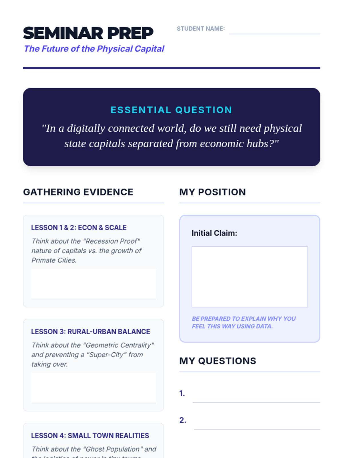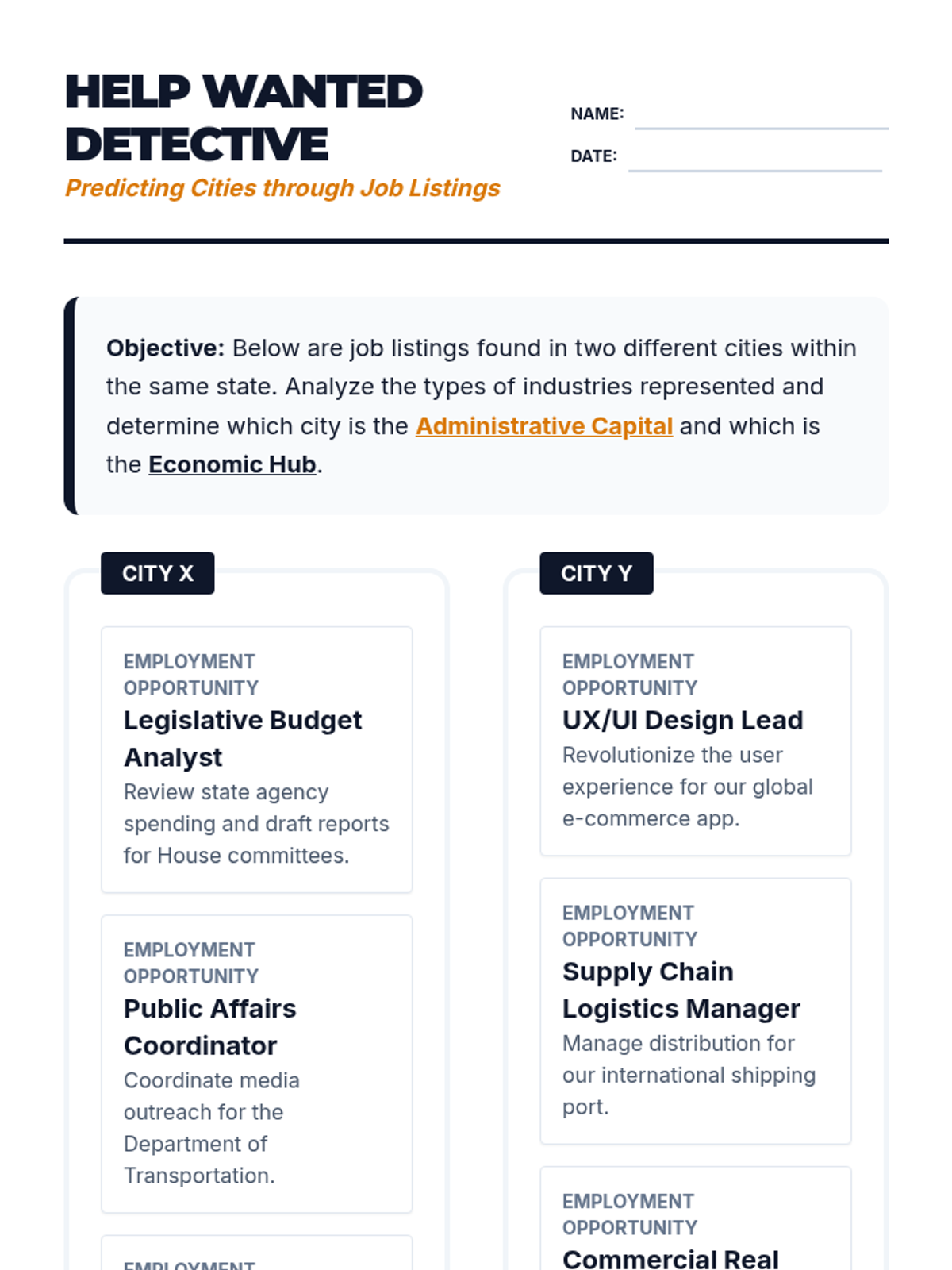This 8th-grade Social Studies sequence explores the geographic, economic, and political distinctions between state capitals (administrative centers) and primate cities (economic hubs). Students analyze why state power is often geographically separated from economic power and the resulting impacts on representation and resource distribution.