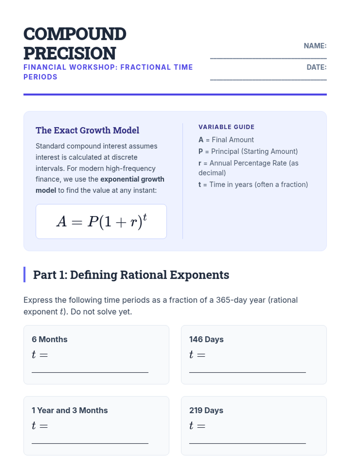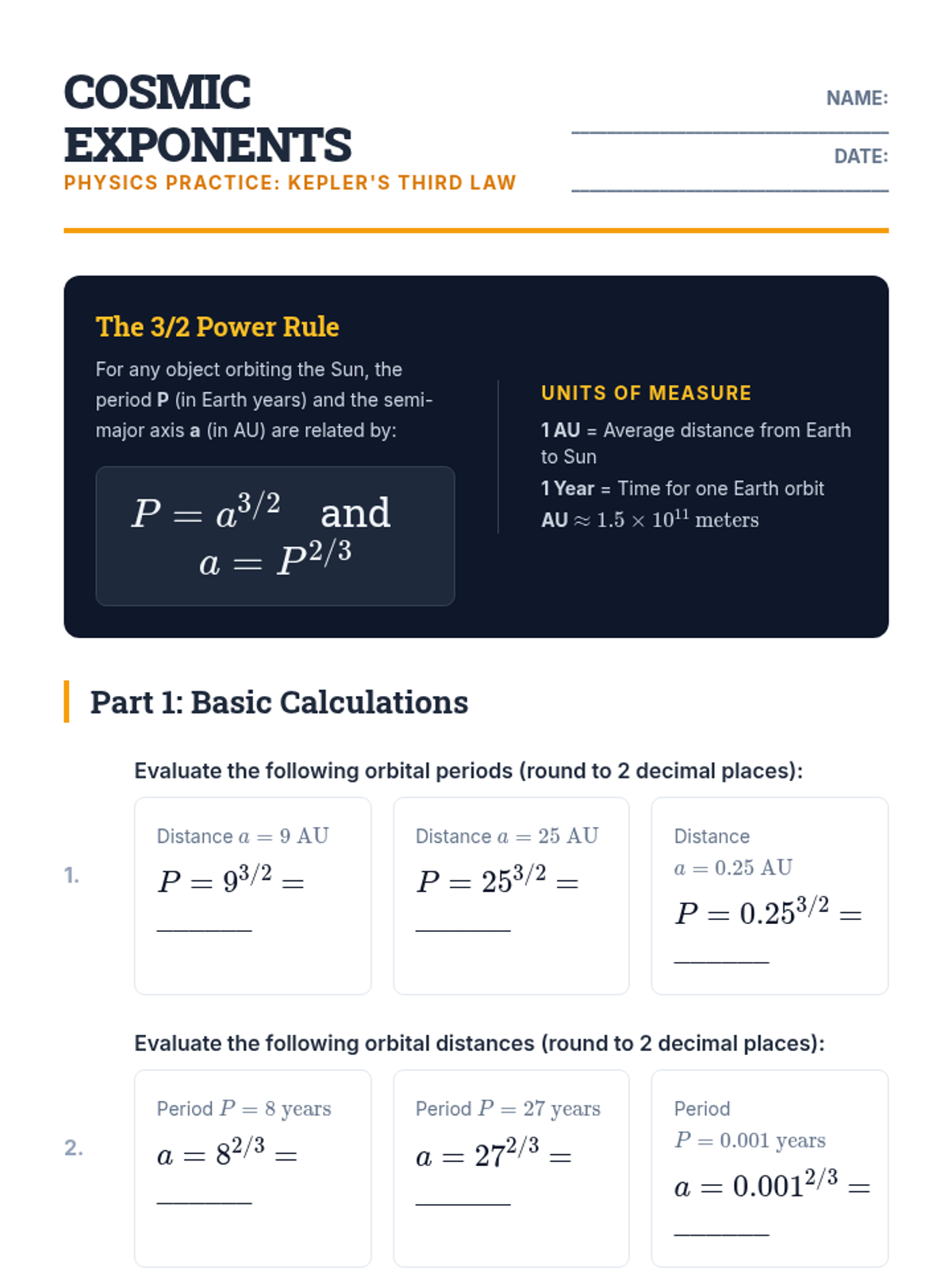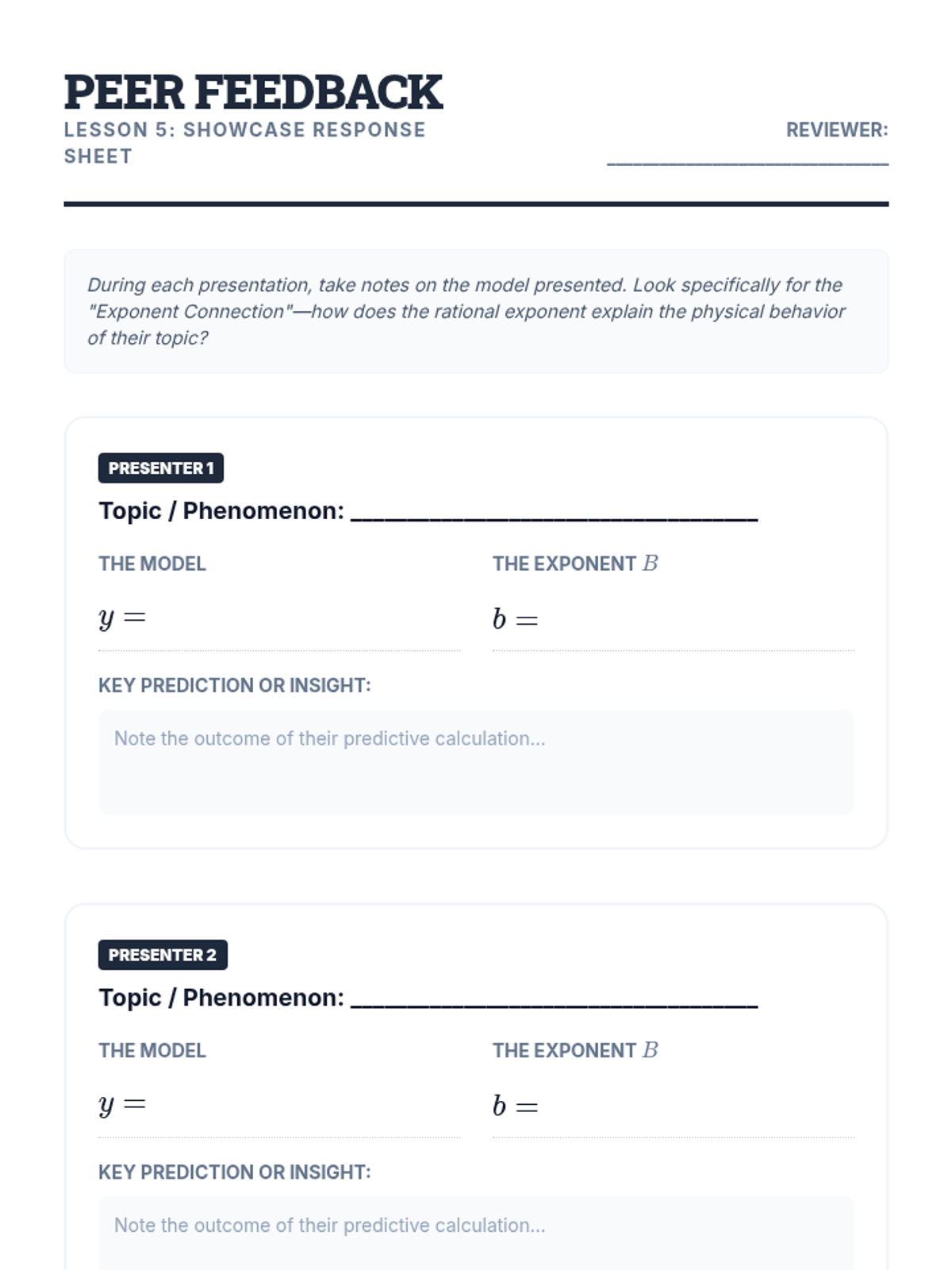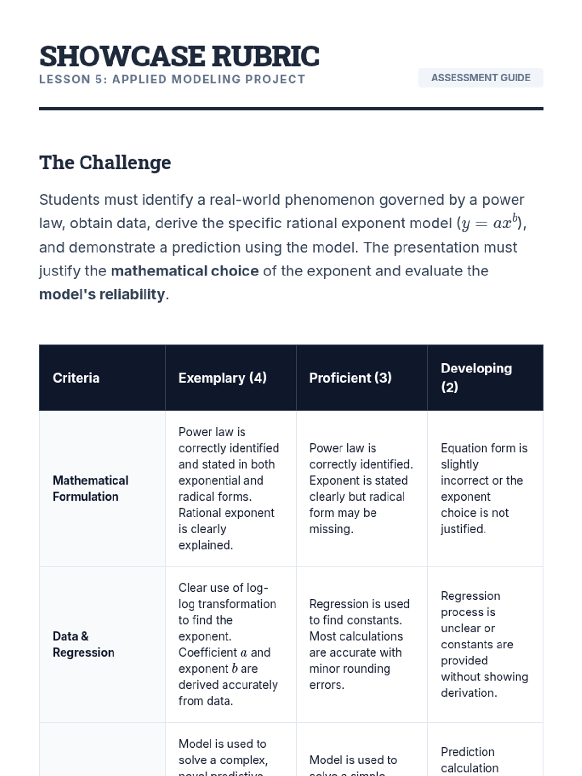 This sequence explores the practical application of rational exponents and power functions in biology, physics, and finance. Students will progress from evaluating existing models like Kleiber's Law and Kepler's Third Law to constructing their own mathematical models from empirical data.