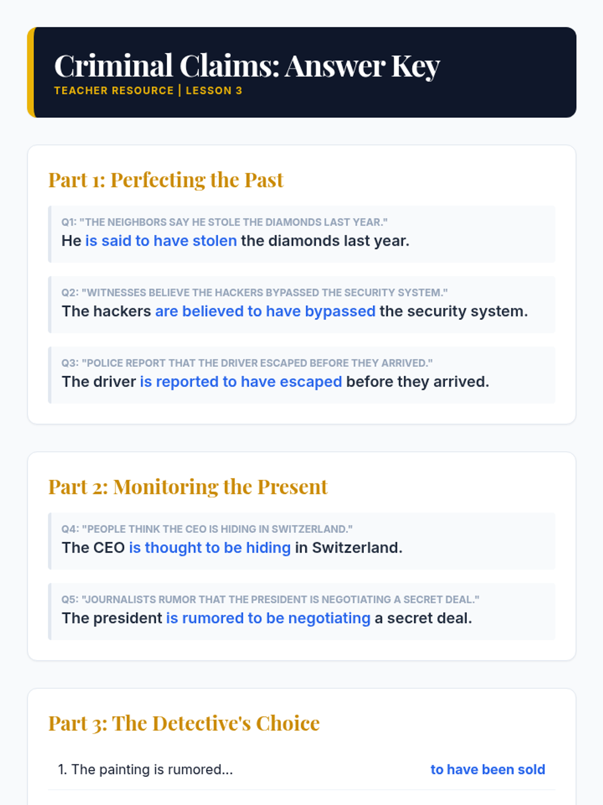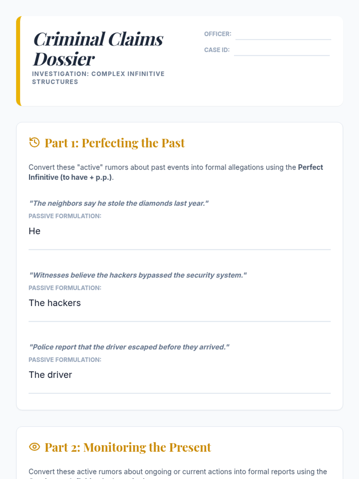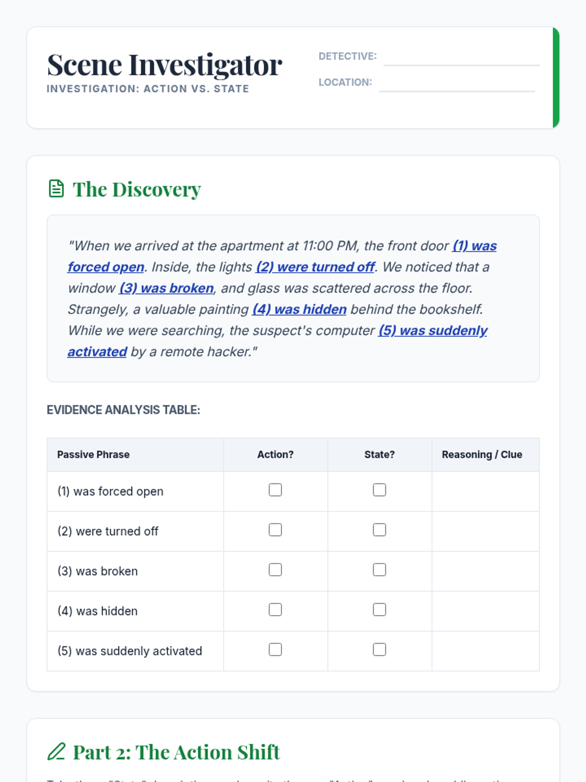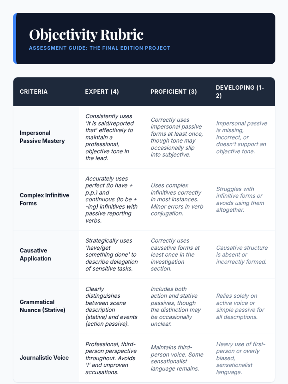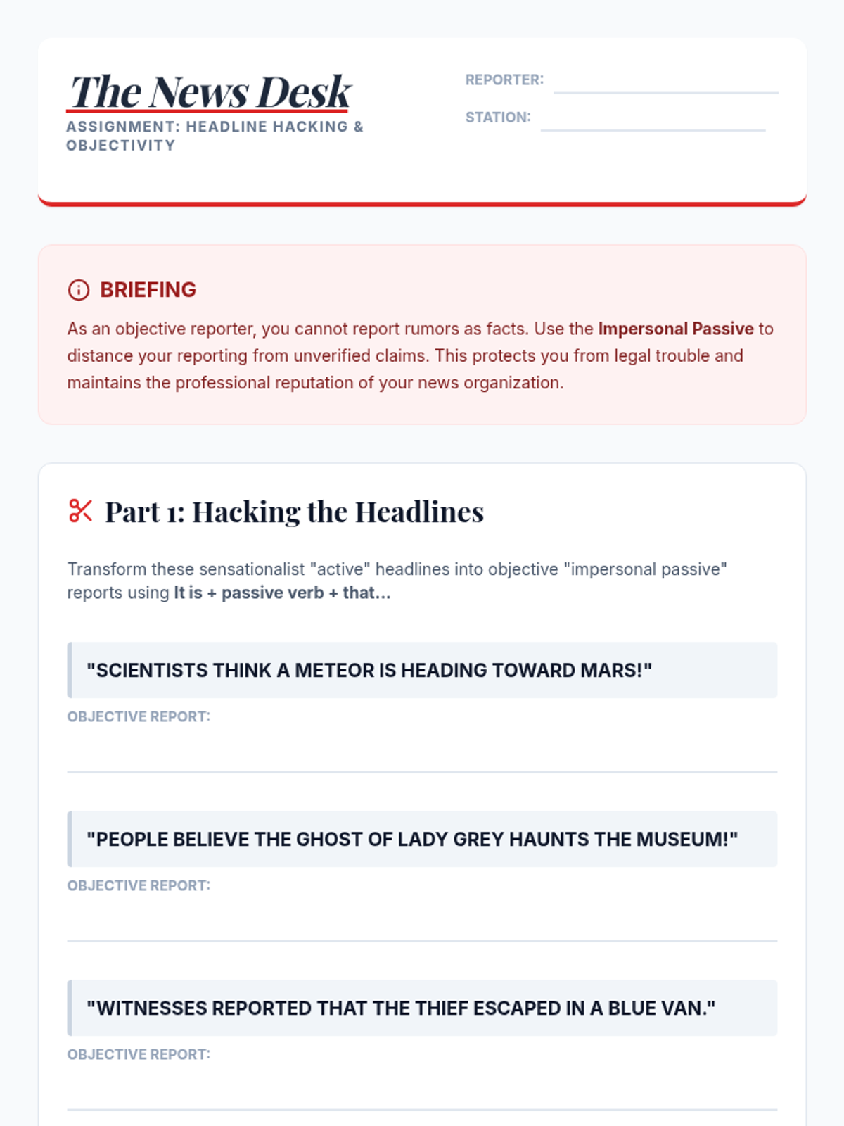 An advanced English grammar sequence for 8th graders focusing on the nuances of agency and objectivity through advanced passive voice structures, culminating in an investigative journalism project.