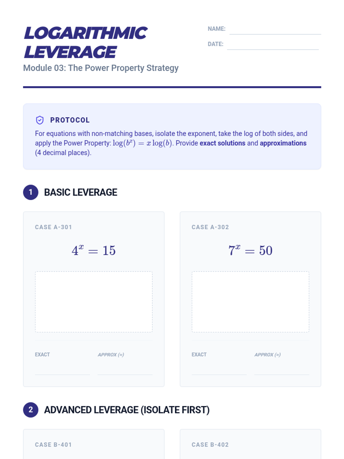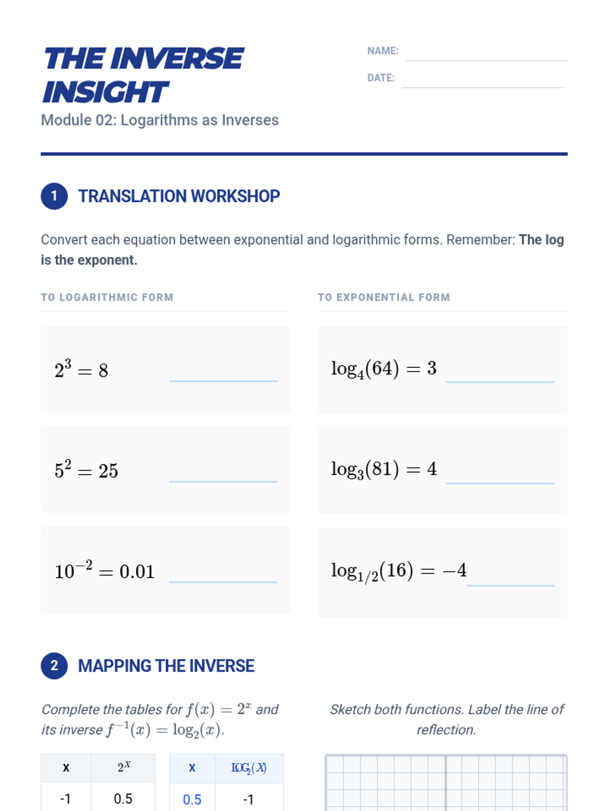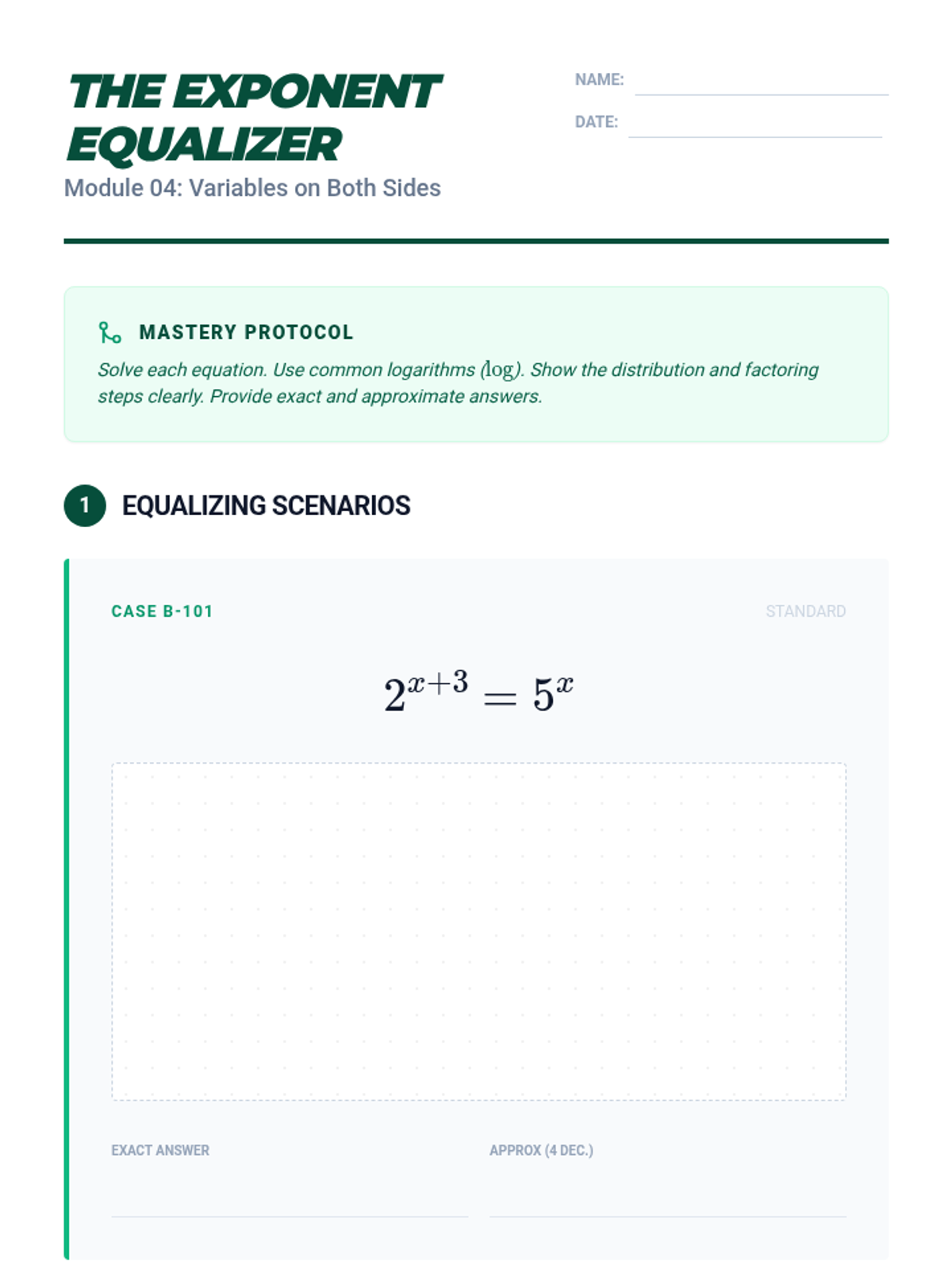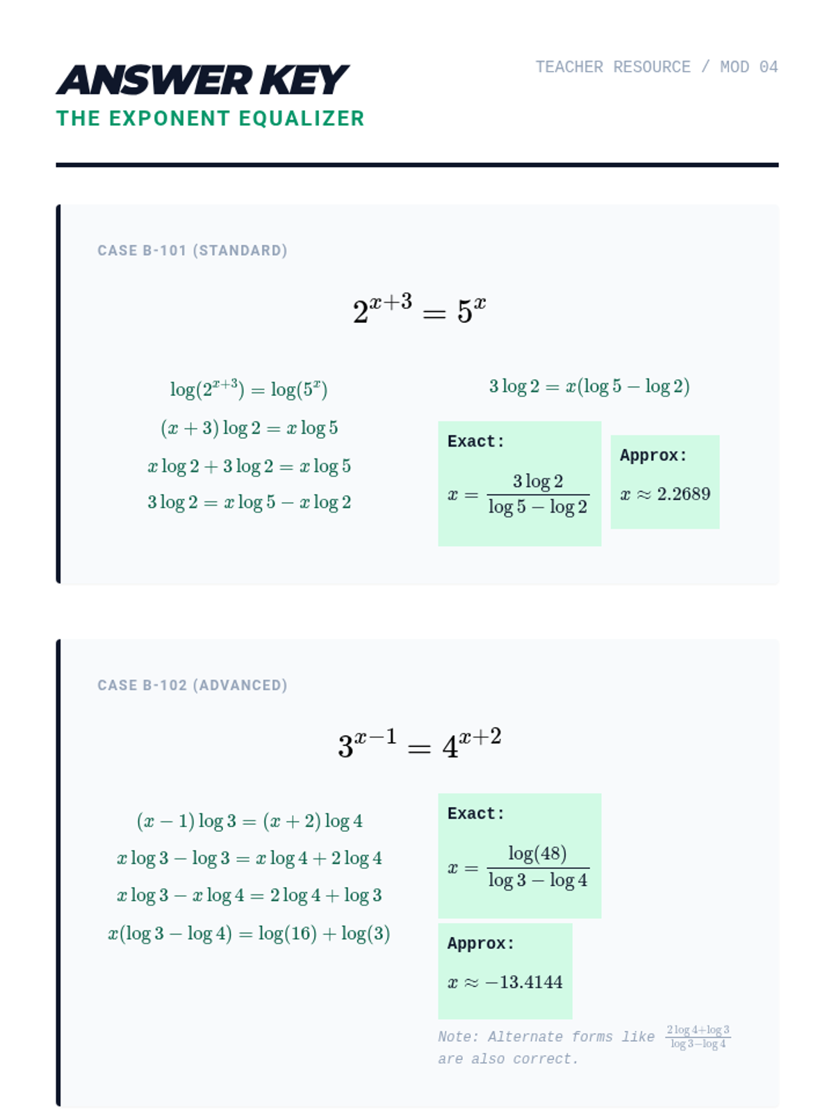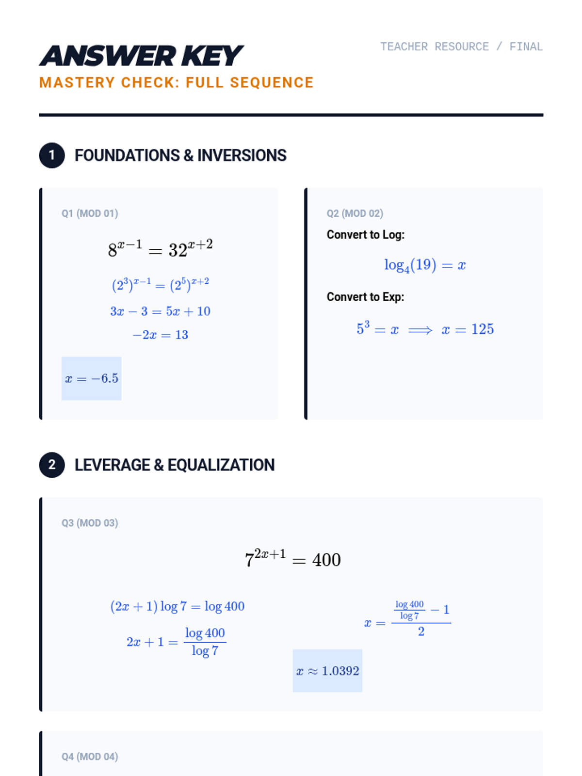 This sequence guides 10th-grade students through the algebraic mechanics of solving exponential equations, moving from common base properties to logarithmic inversions and quadratic structures. Students develop a deep conceptual understanding of logs as inverses and master the precision needed for complex algebraic manipulation.
