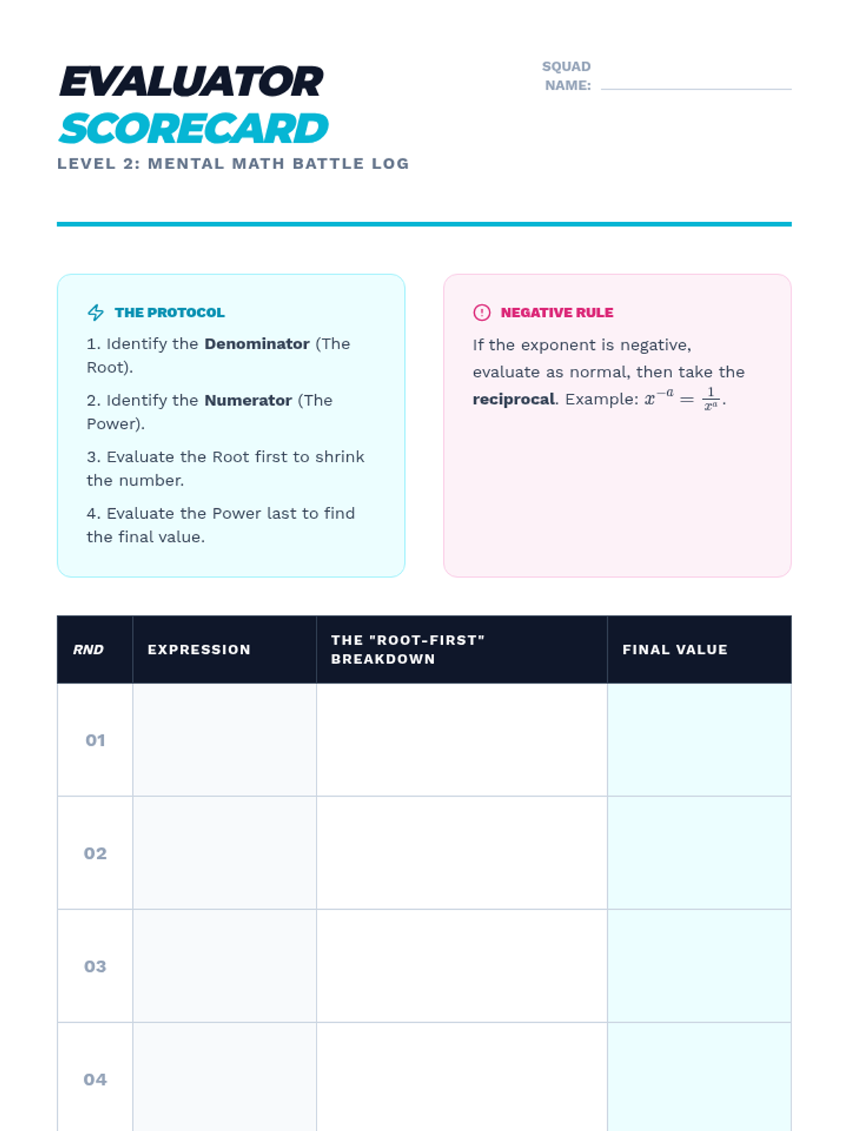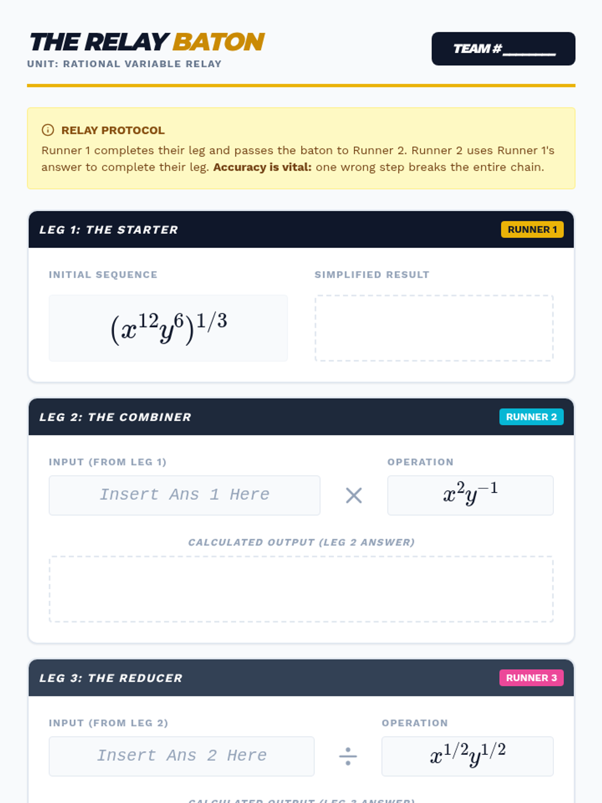 A gamified approach to mastering rational exponents through competition, collaboration, and high-stakes simulations. Students move from basic radical conversions to complex multi-variable simplification in a fast-paced 'Power Play' environment.