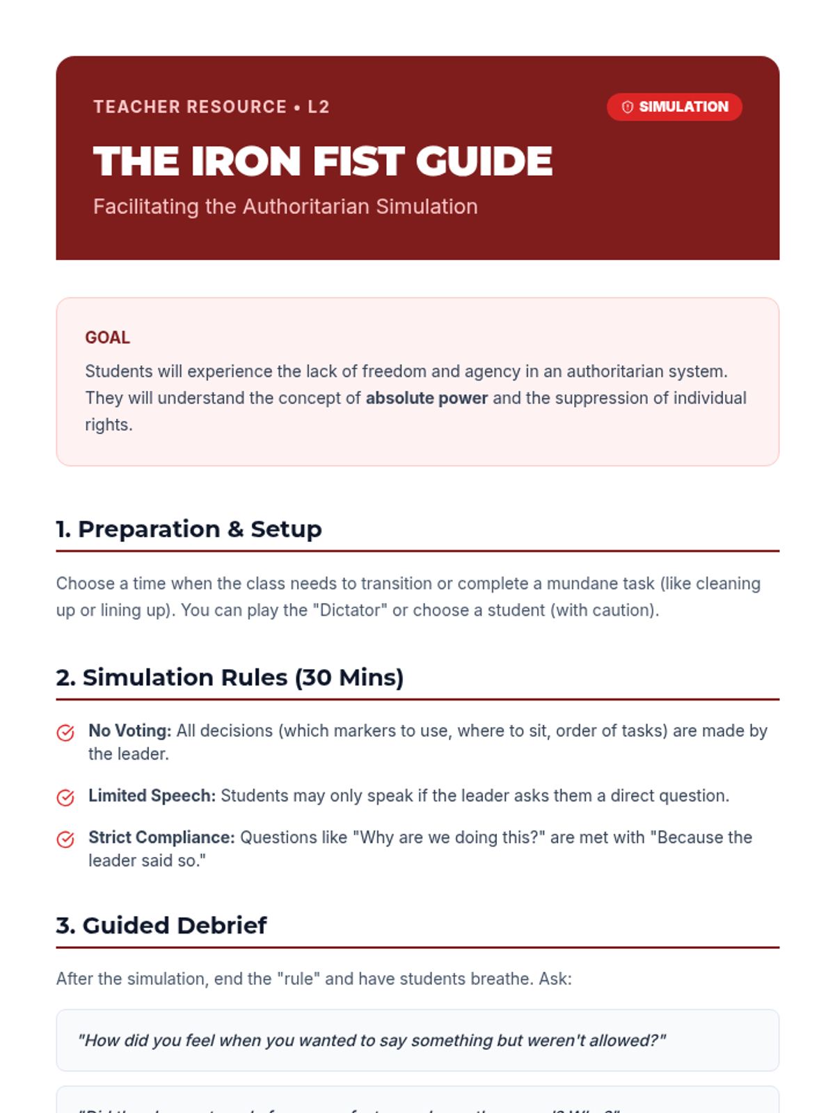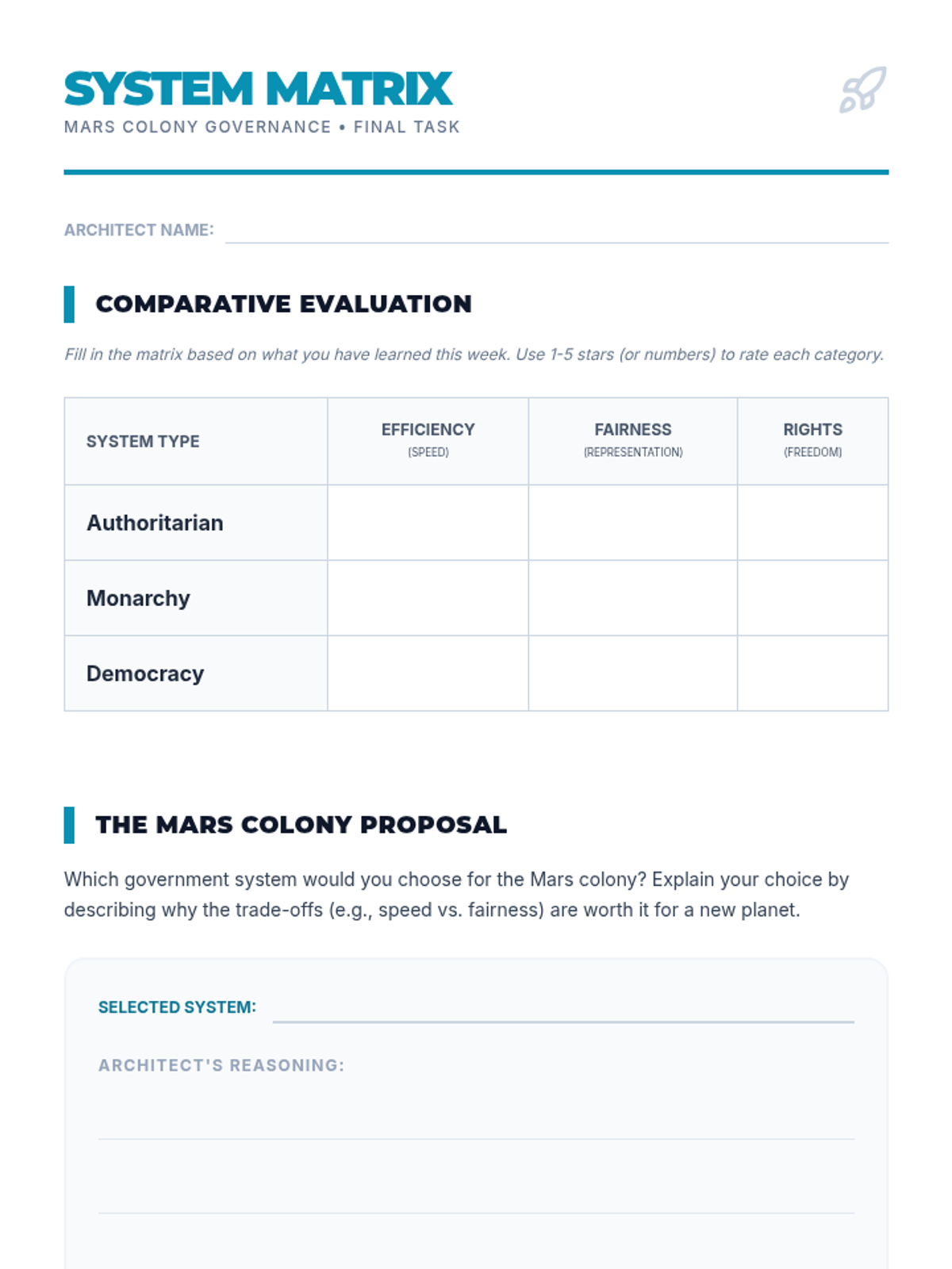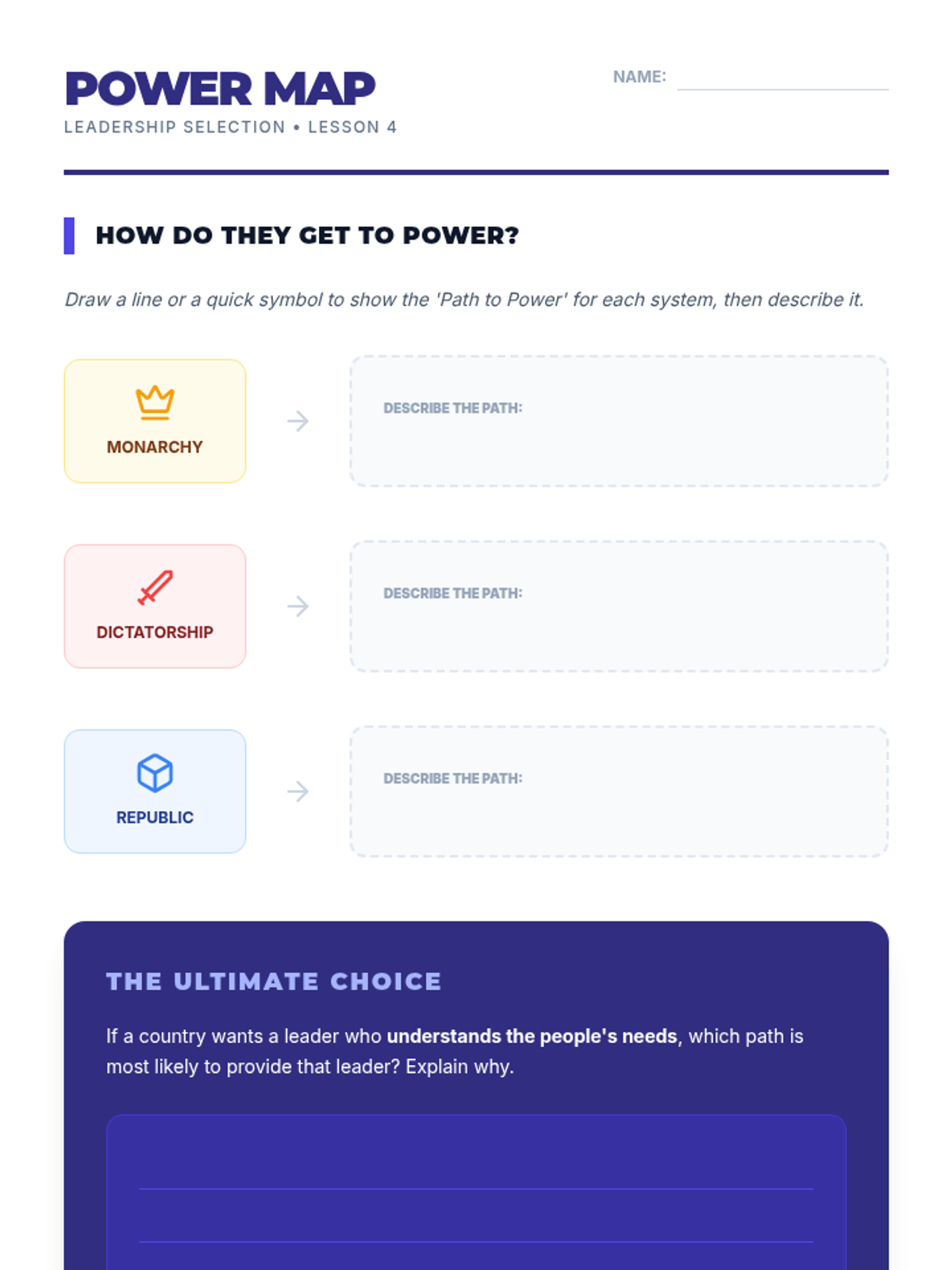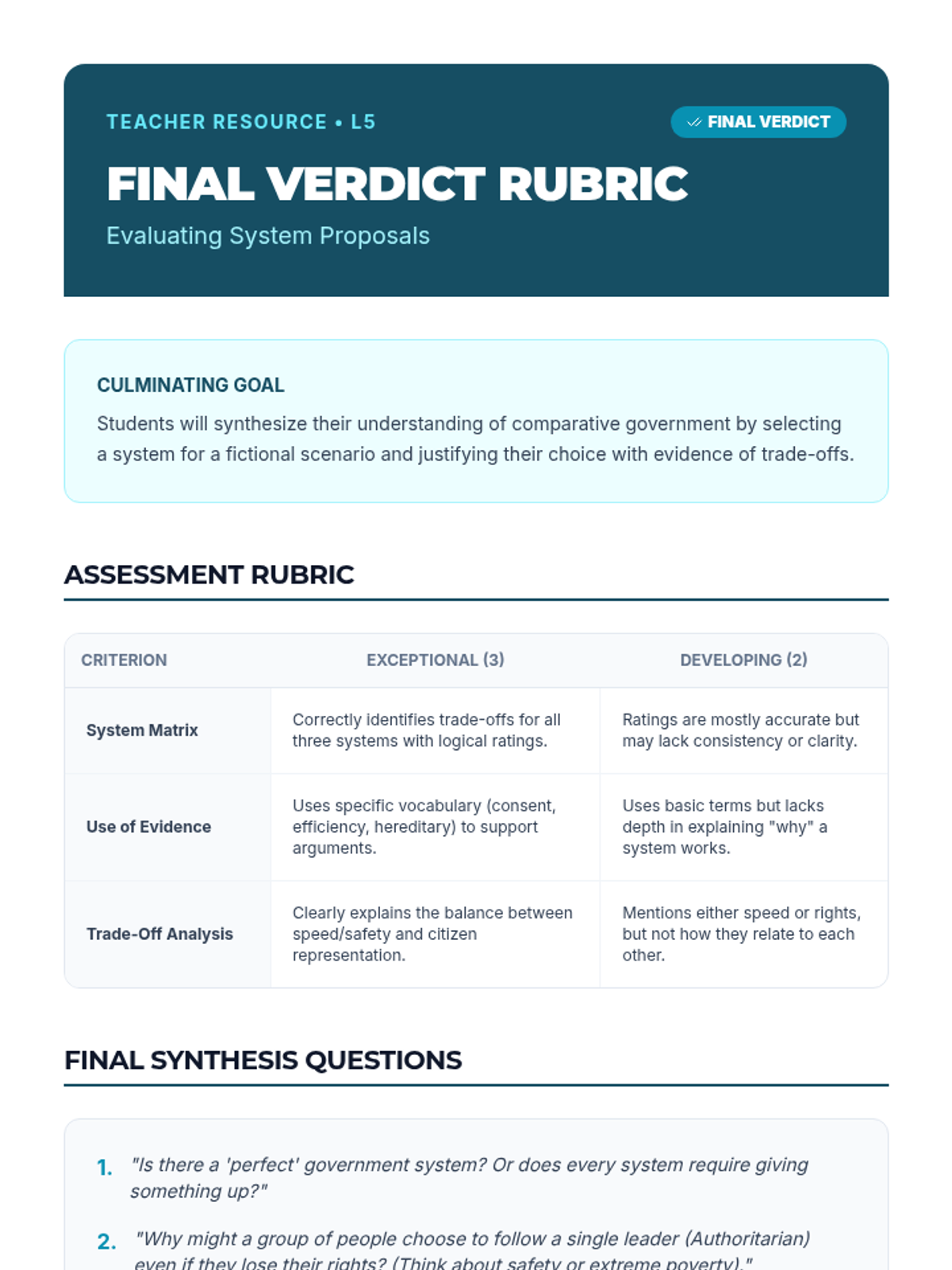 A 5th-grade civics sequence that uses immersive simulations to compare democratic, authoritarian, and monarchical systems. Students progress from exploring the nature of authority to evaluating which government structures best balance efficiency and human rights.
