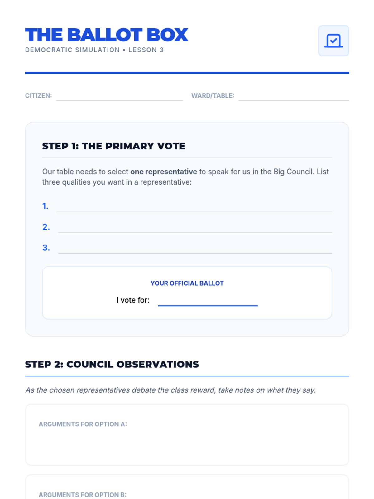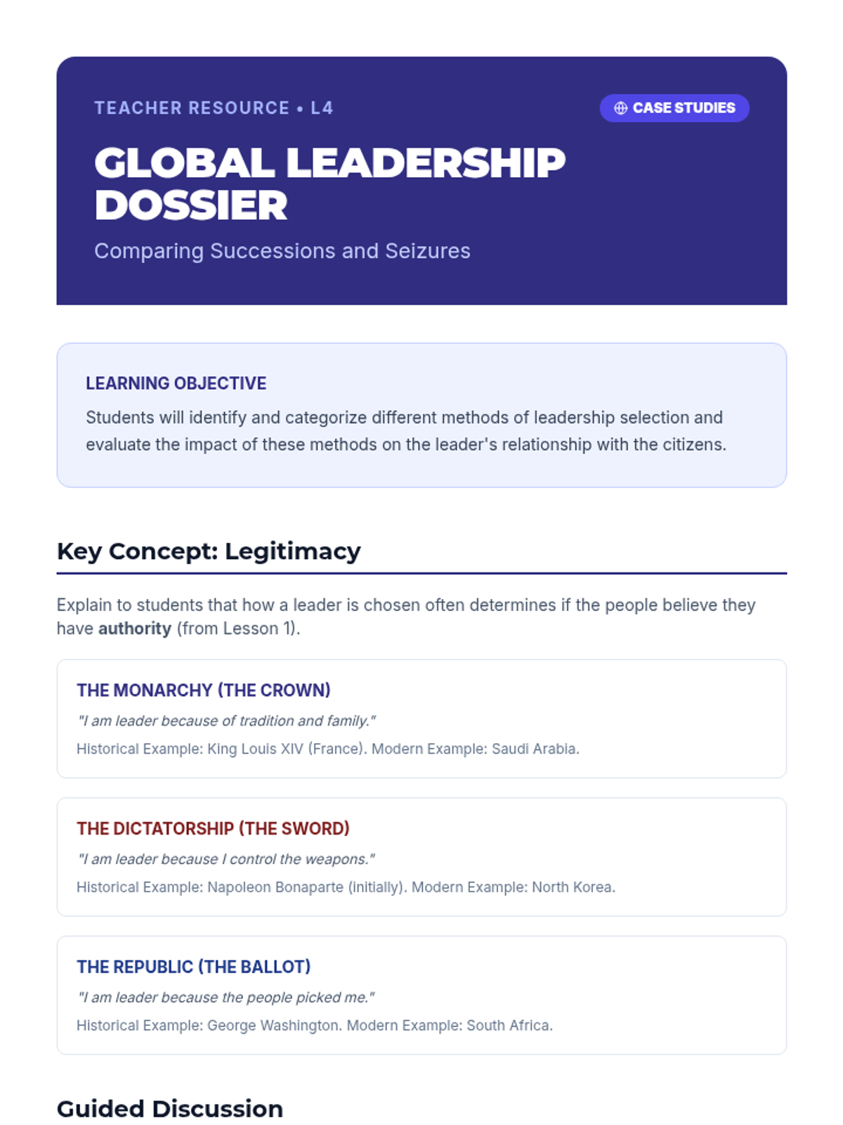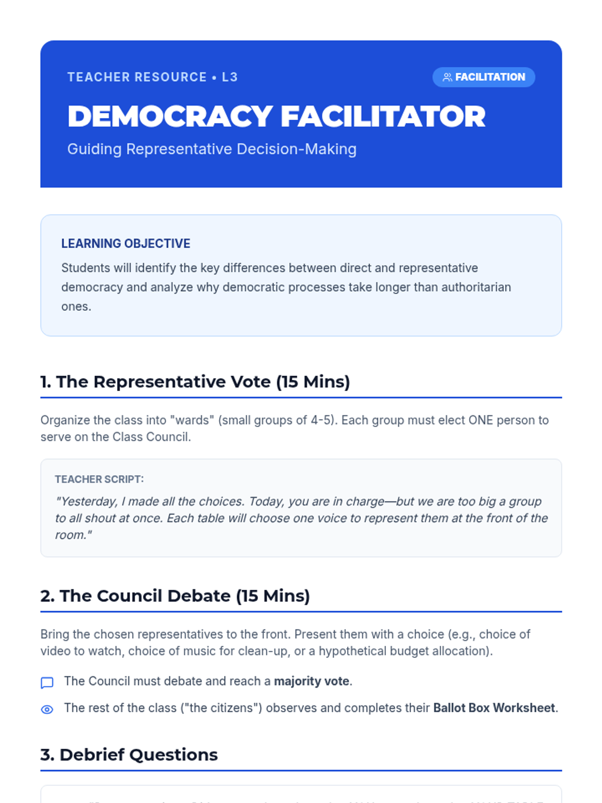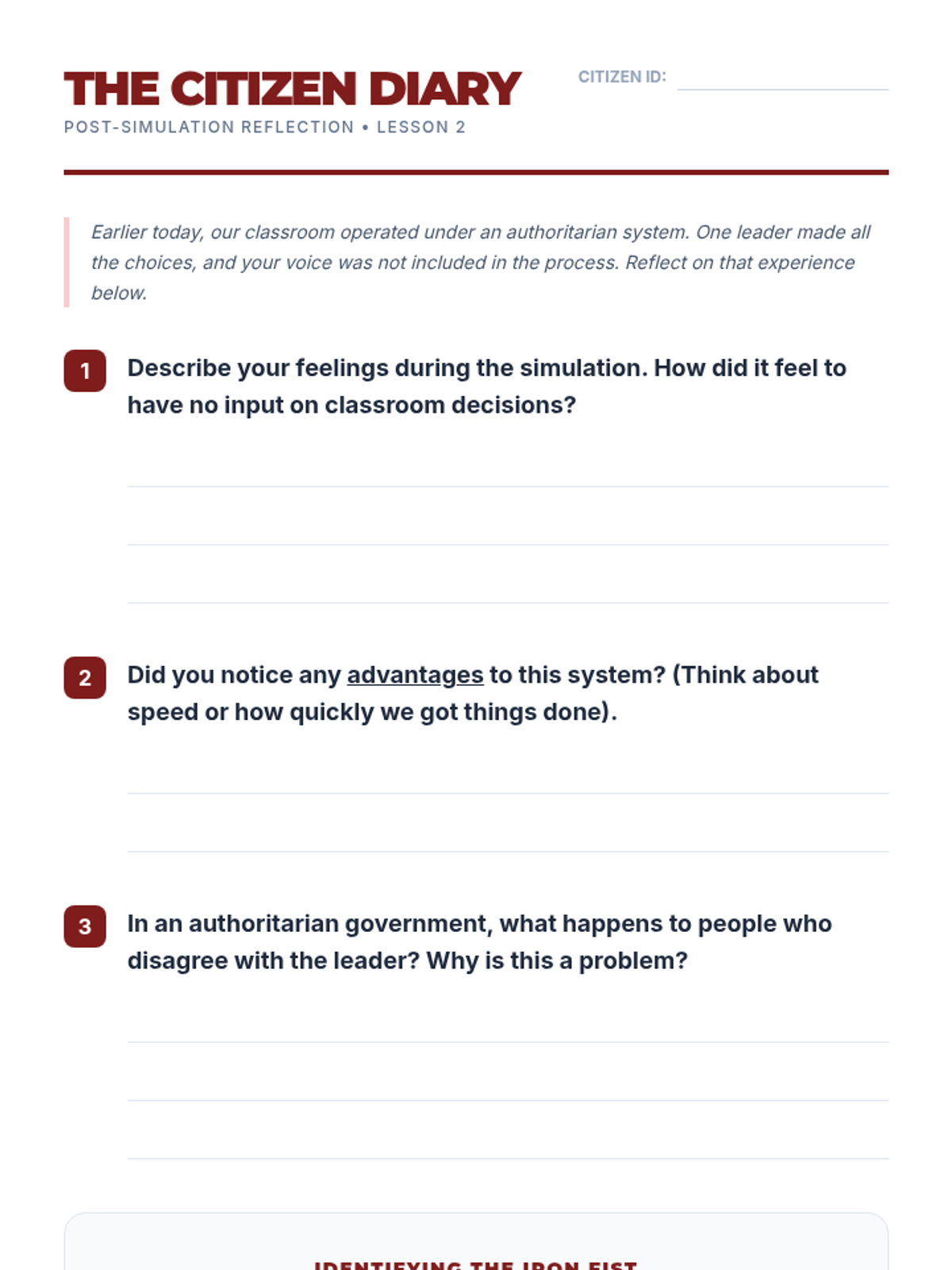 A 5th-grade civics sequence that uses immersive simulations to compare democratic, authoritarian, and monarchical systems. Students progress from exploring the nature of authority to evaluating which government structures best balance efficiency and human rights.
