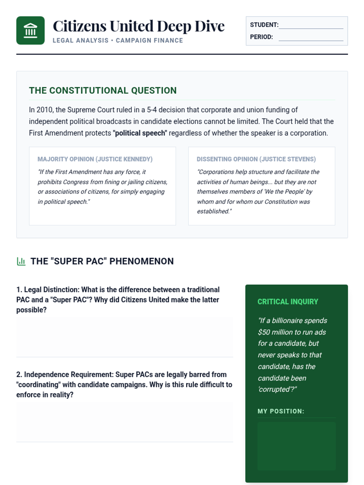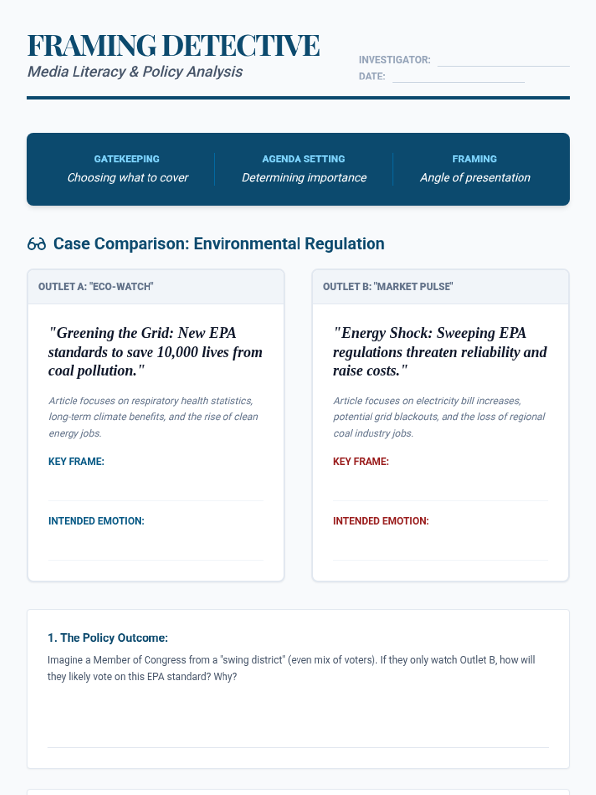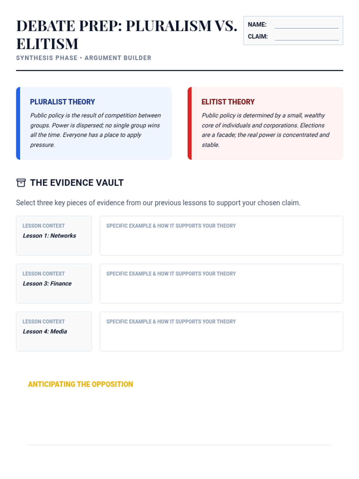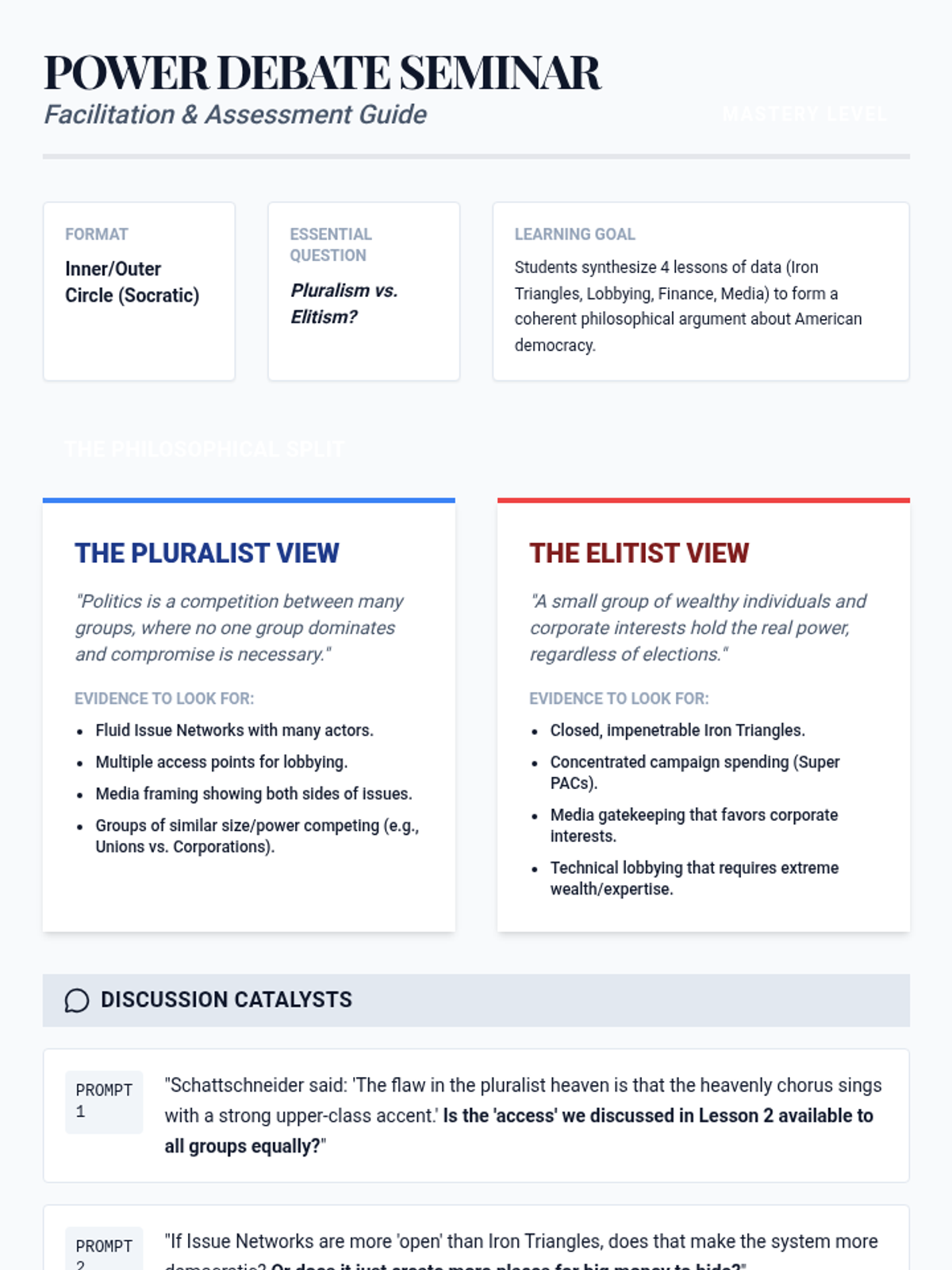 A comprehensive 12th-grade Civics sequence exploring the mechanics of political influence. Students analyze the relationships between interest groups, the media, and government agencies to understand how public policy is actually made in the United States.