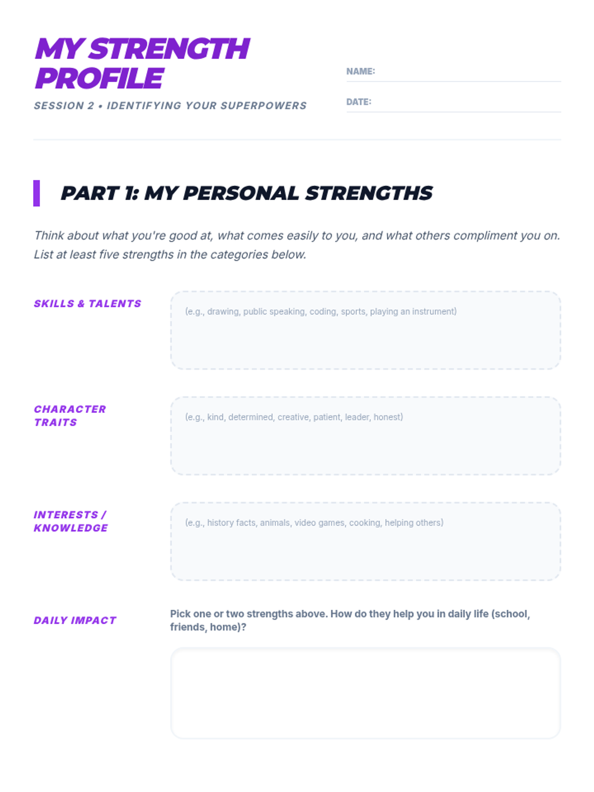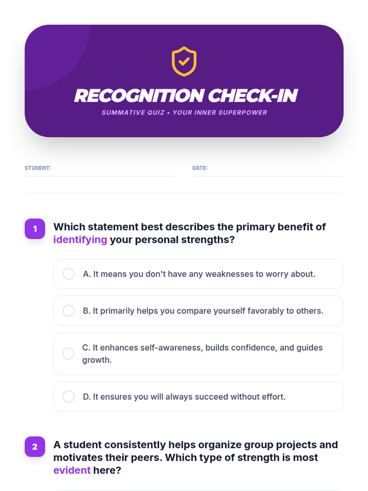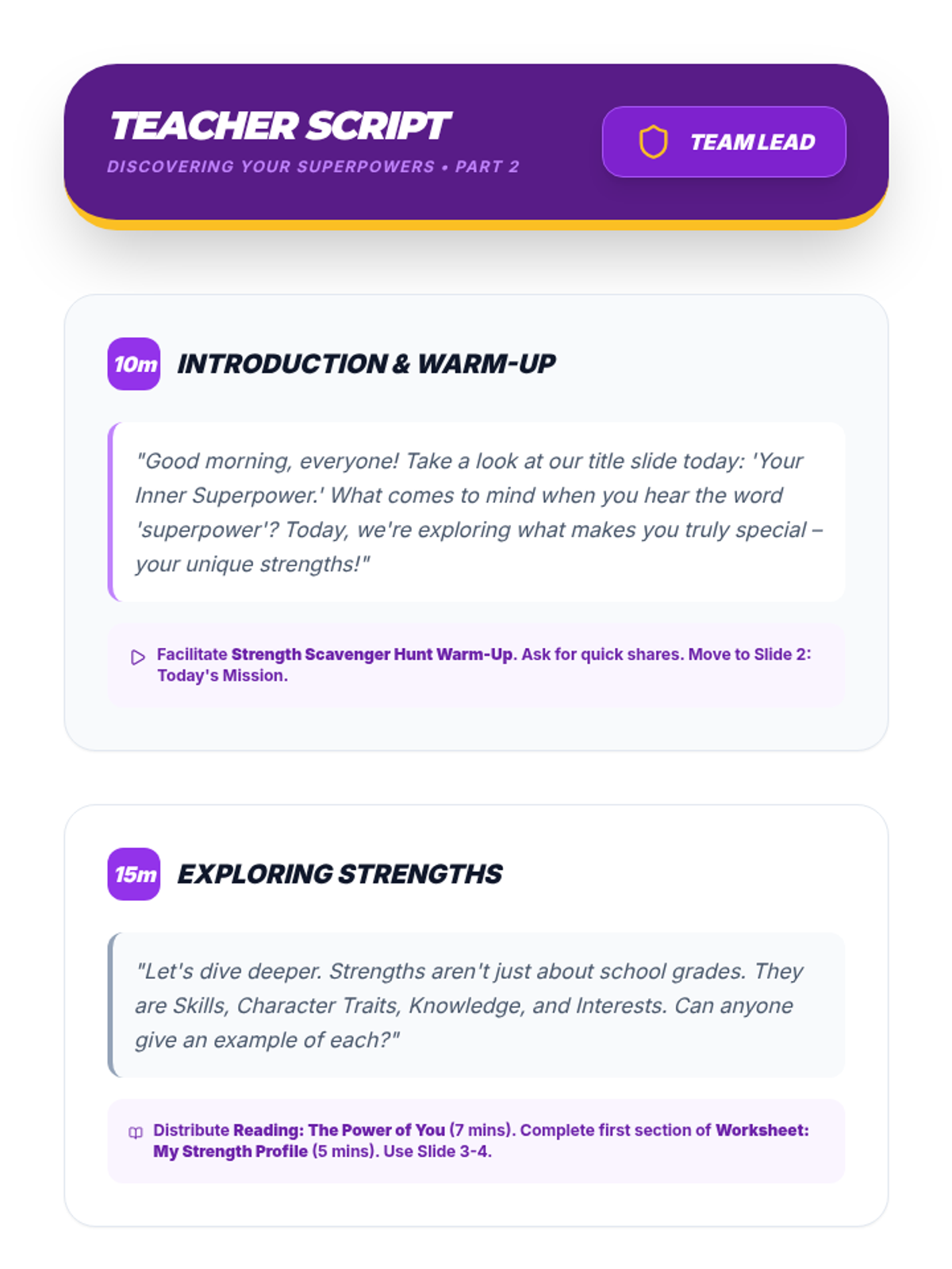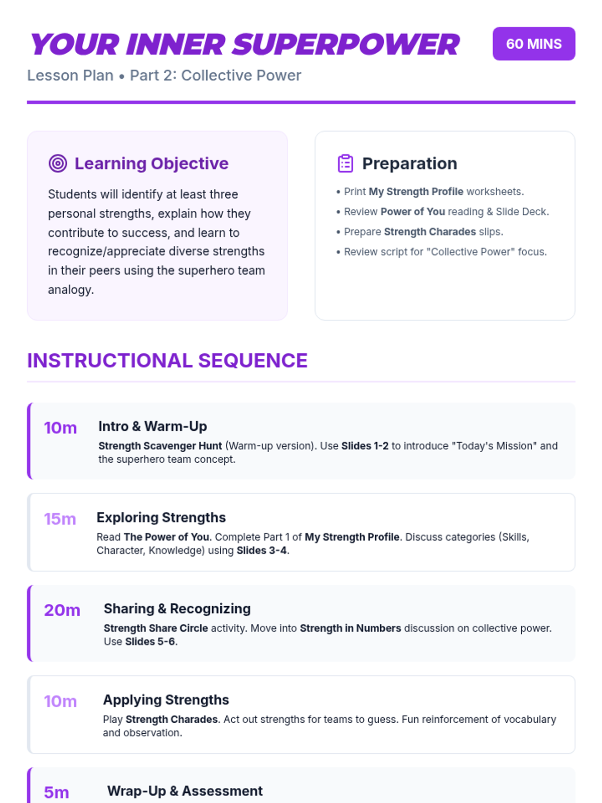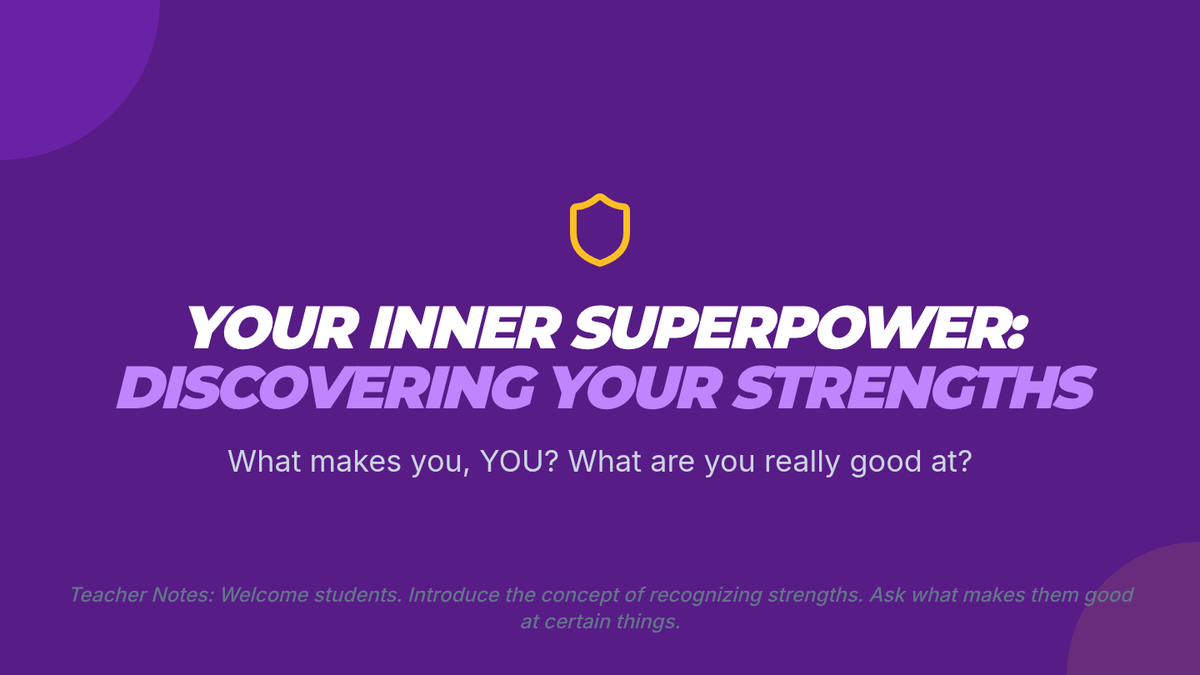 A comprehensive two-part sequence designed for high school students to identify, understand, and leverage their personal strengths. Through interactive activities, self-reflection, and collaborative discussion, students discover their 'inner superpowers' to boost confidence and academic success.