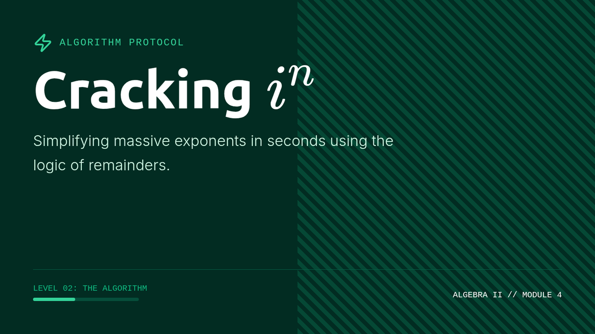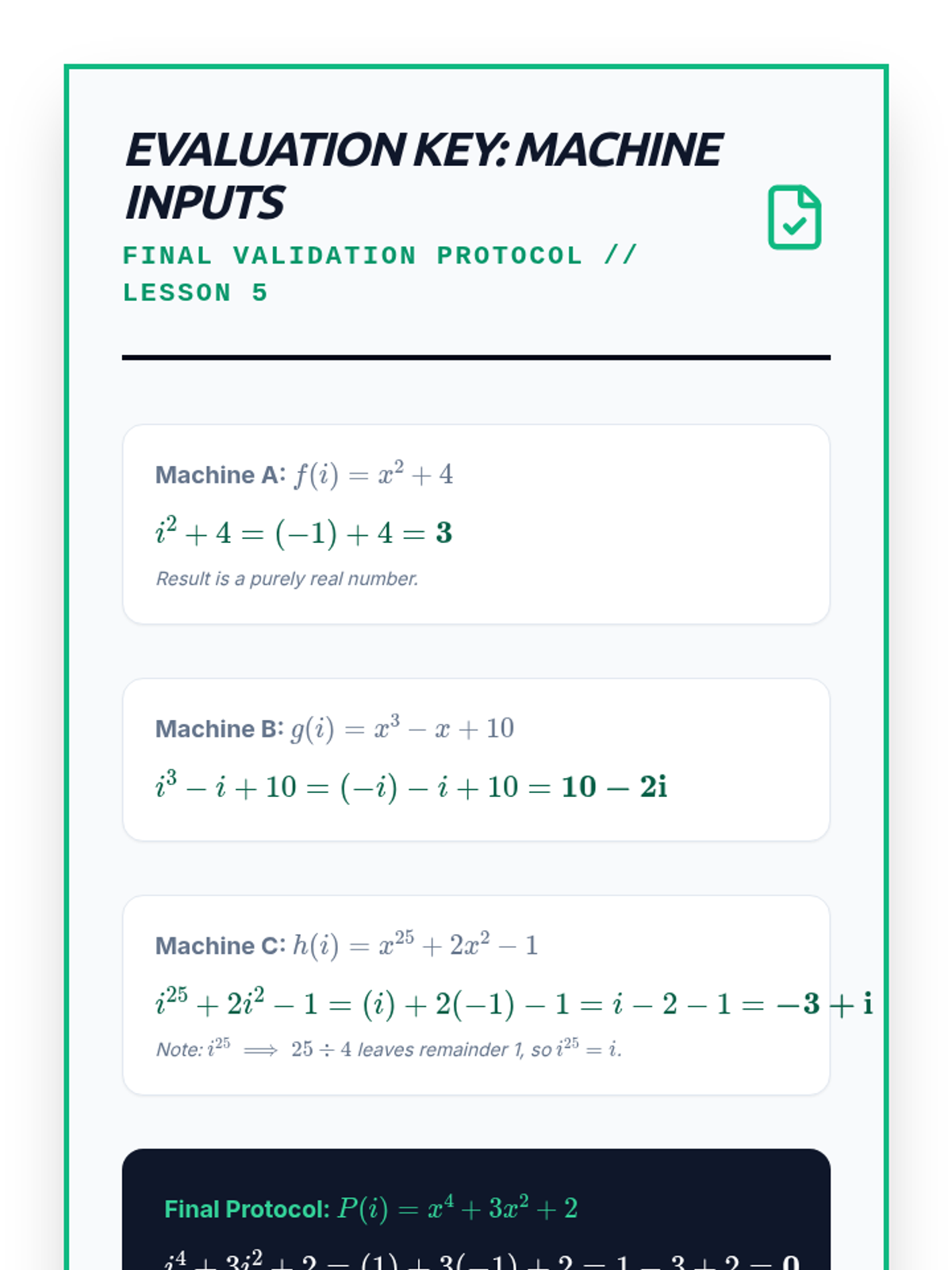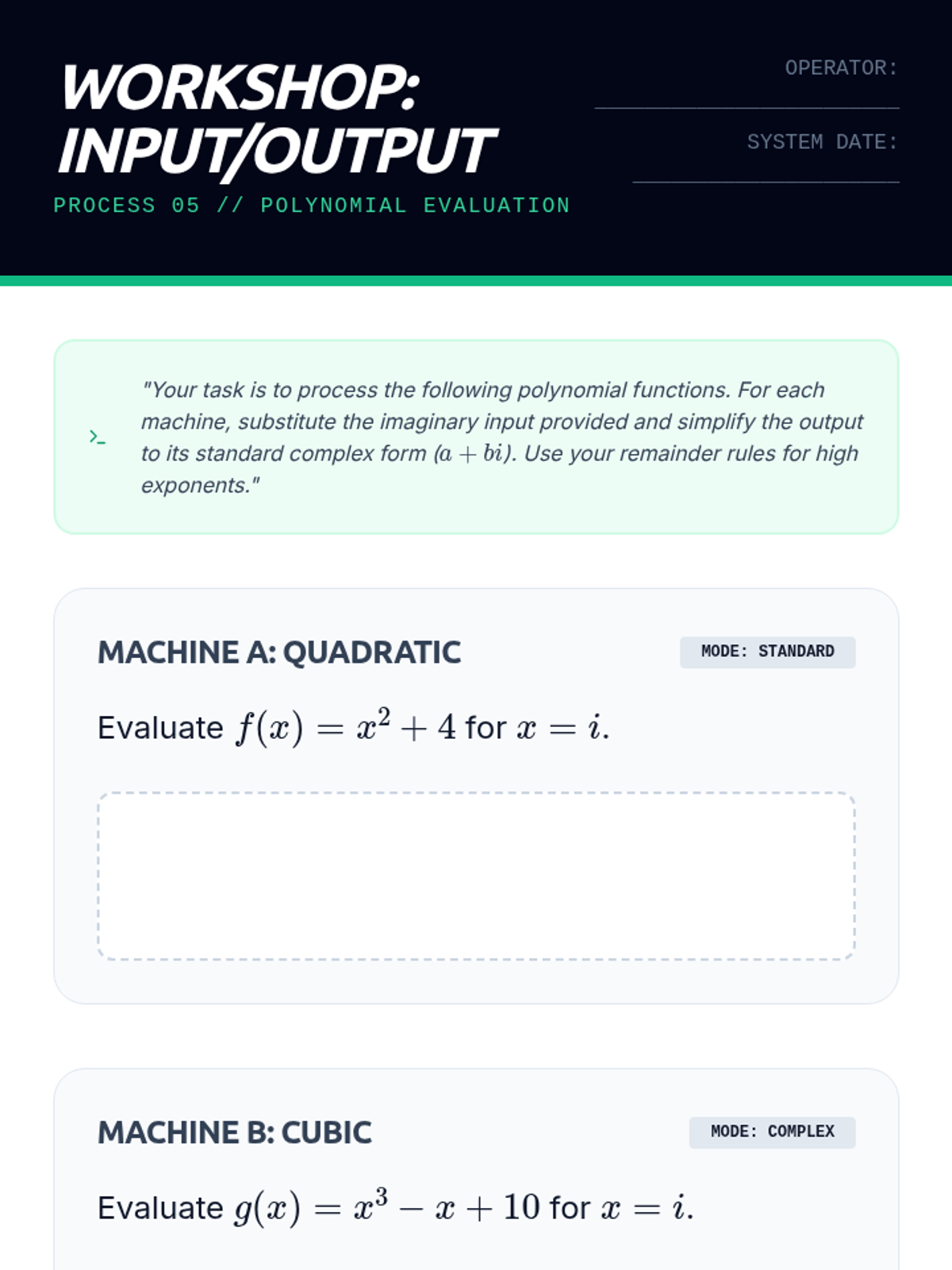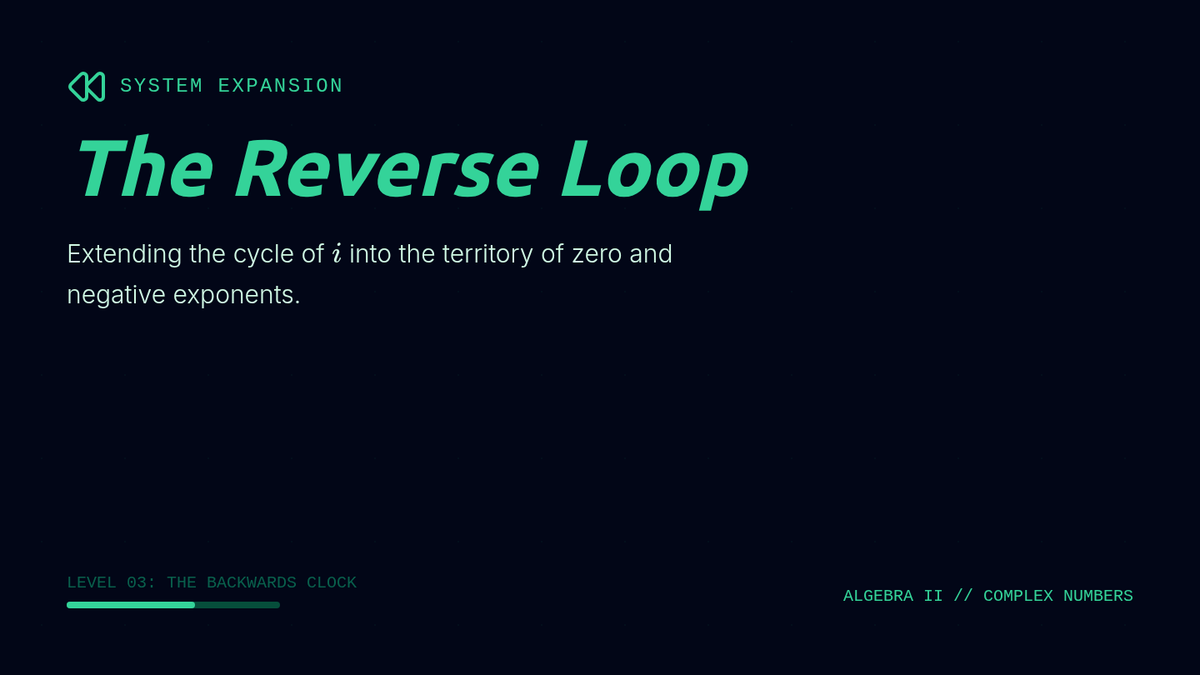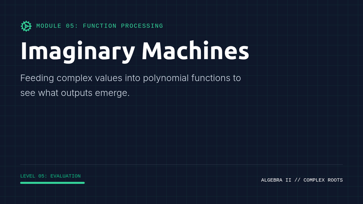 A 10th-grade algebra sequence exploring the cyclical nature of powers of the imaginary unit. Students progress from discovering the 4-step cycle to developing algorithms for large exponents, exploring negative powers, and evaluating polynomials with imaginary inputs.