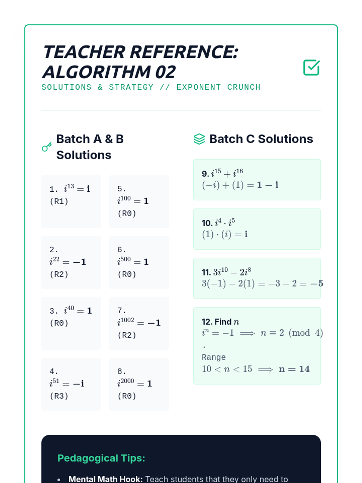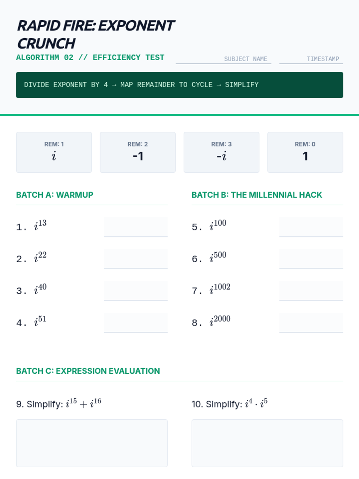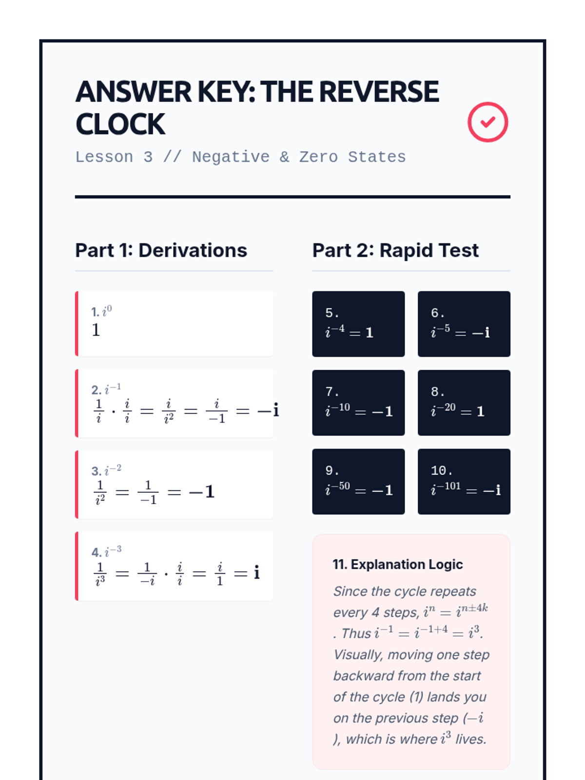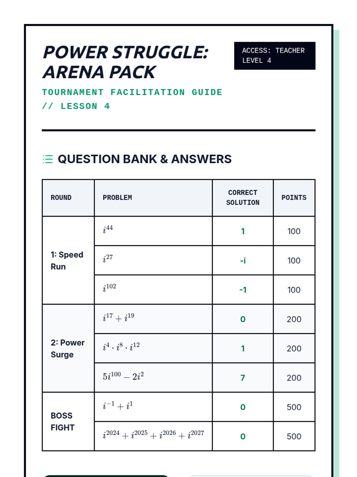 A 10th-grade algebra sequence exploring the cyclical nature of powers of the imaginary unit. Students progress from discovering the 4-step cycle to developing algorithms for large exponents, exploring negative powers, and evaluating polynomials with imaginary inputs.